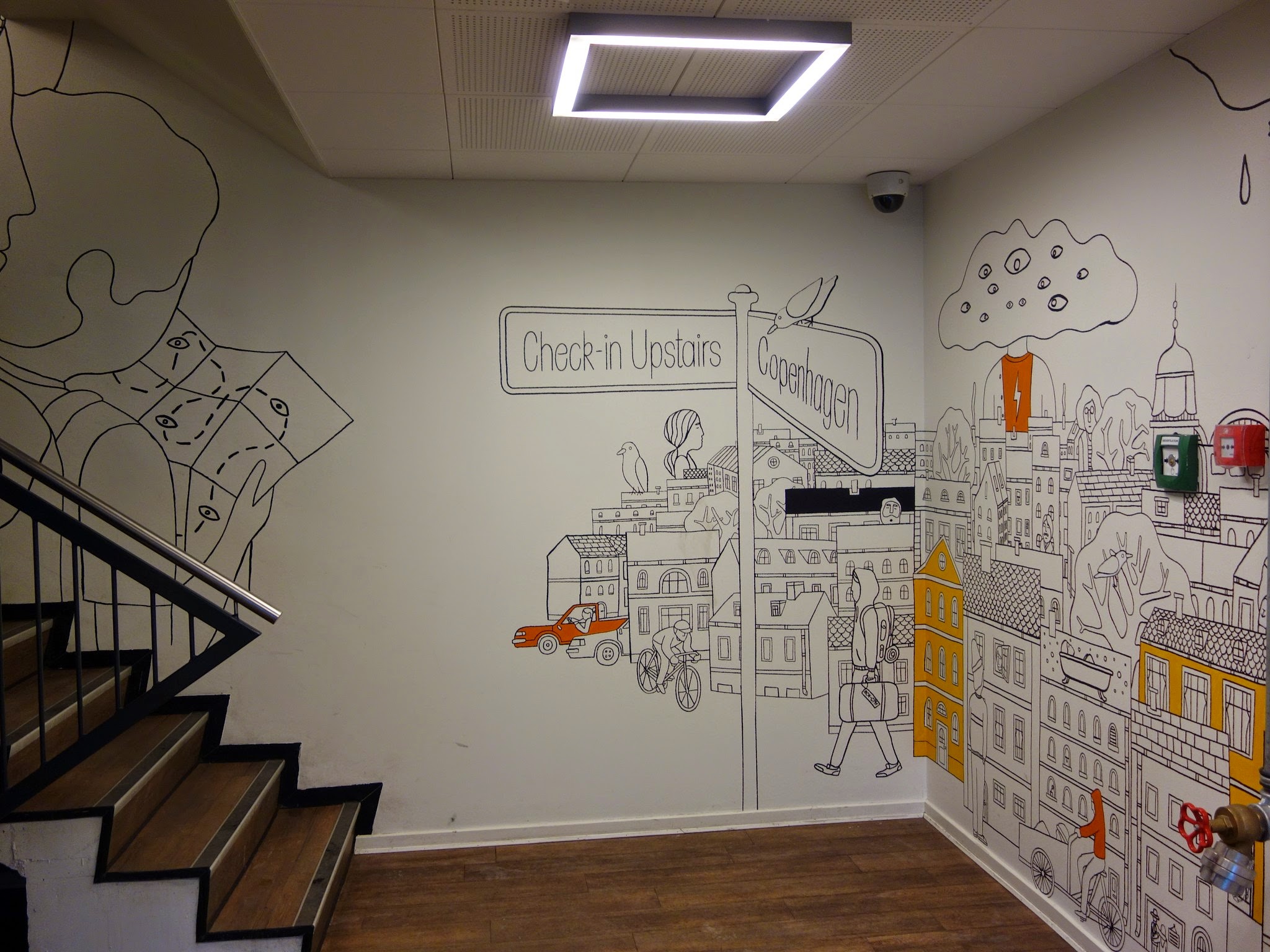 從機場搭乘地鐵進到市區非常方便,不用轉車就能直達市中心的Kongens Nytorv站,週邊都是大型的百貨公司及商店街。從班機降落到我抵達住宿的旅館僅僅花了一個半小時的時間,真是超快的!這次住宿選在離車站走路不到10分鐘的Generator Hostel Copenhagen,是一家有很大交誼空間的青年旅社,整體明亮乾淨,價位還算平實,我們訂四個晚上的雙人房一共是262EUR(歐元兌台幣當時是1:38,因此大約每晚2600NTD)。