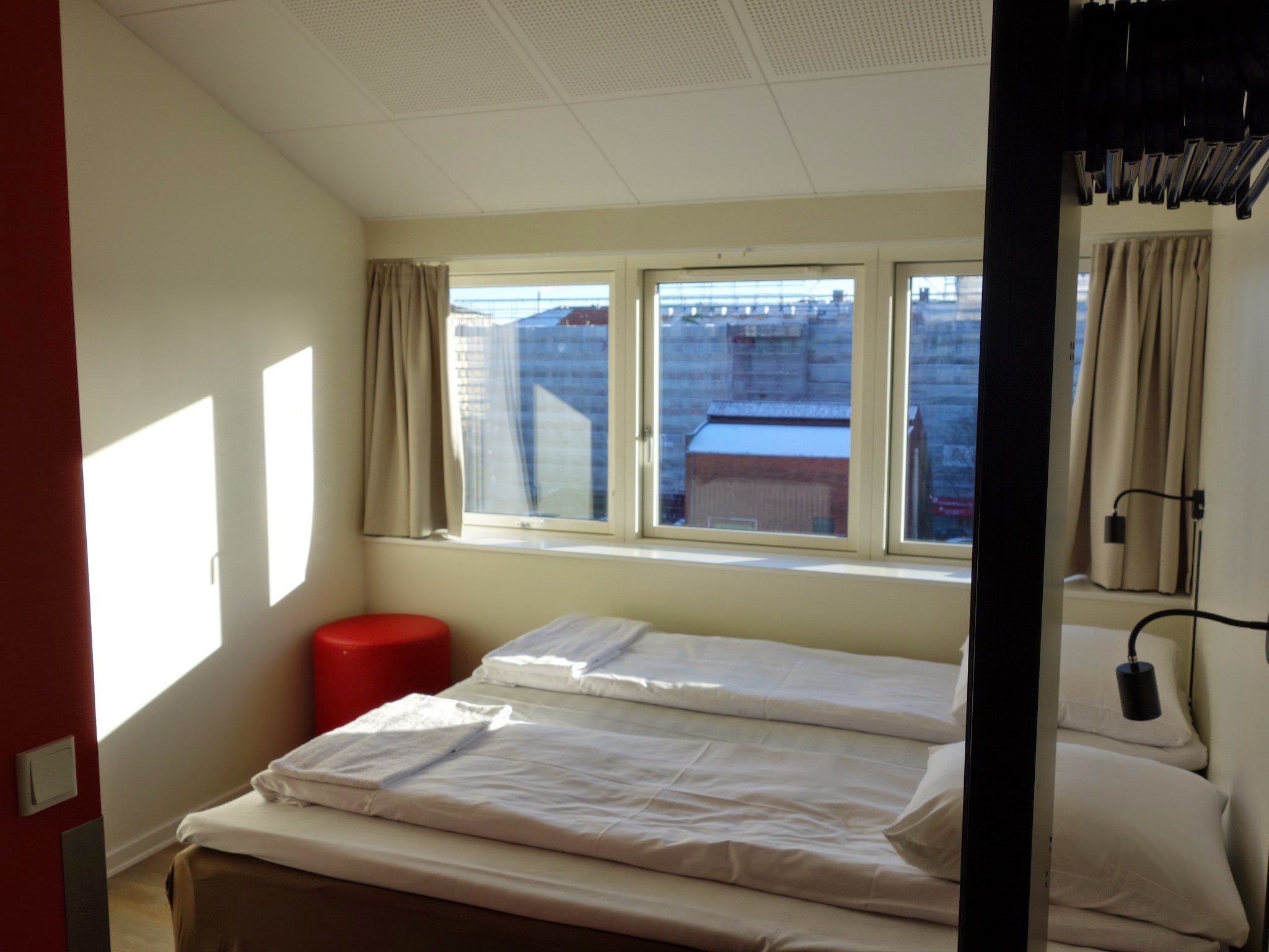 我們的房間在頂樓,基本上就是乾淨的白牆配上兩張單人床,剩下的空間要打開一個大行李箱都有困難。丹麥用的是圓圓的三孔插座,看起來是個可愛的笑臉,就算不插也可以當裝飾(?)。