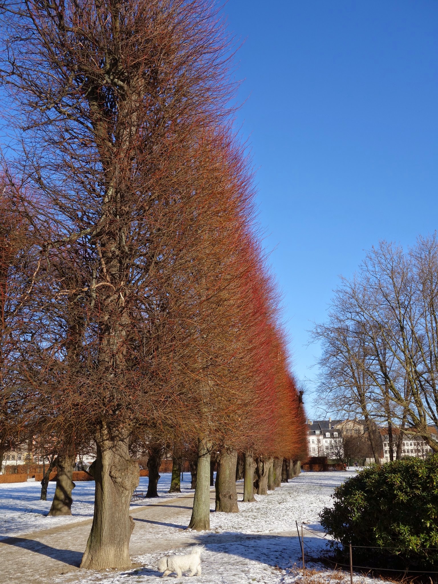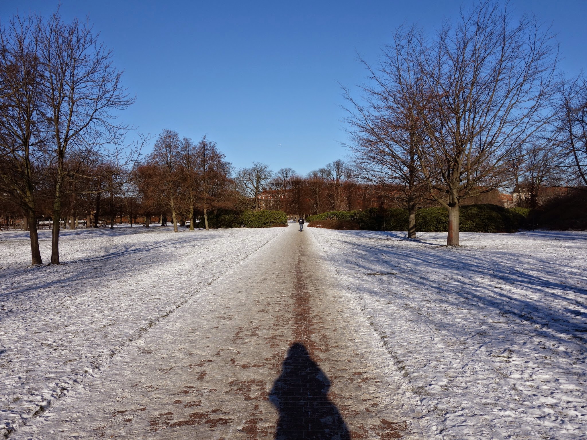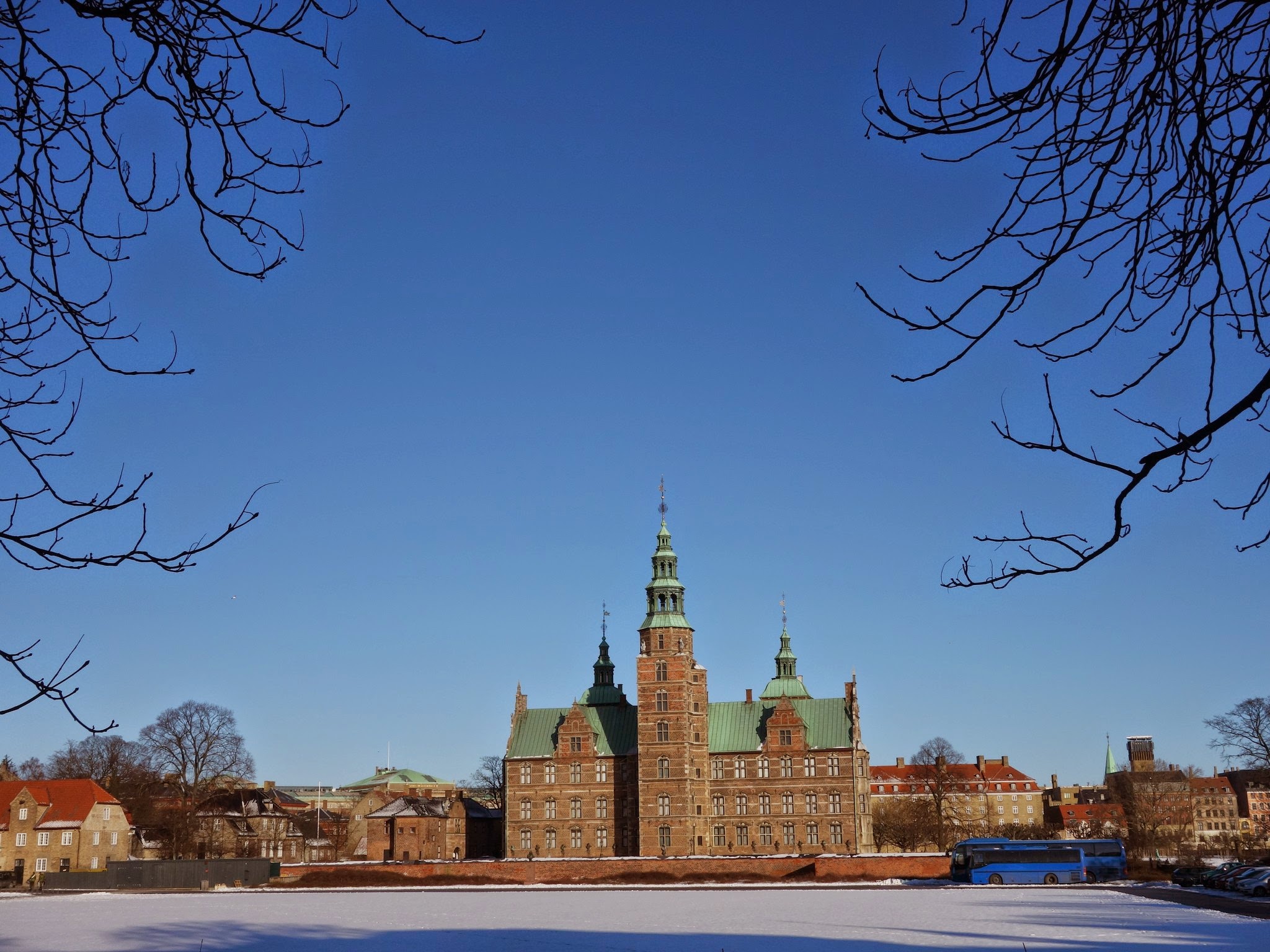 旅館的後面就是國王花園及羅森堡城堡(Rosenborg slot),算是很知名的旅遊景點,但一月的丹麥大概不是個逛花園的好時機XD。但整片白茫茫的土地和光禿禿的樹枝,還有正中午依然仰角極低的太陽,對於熱帶來的人類而言還是非常新奇。鴿子圍成一群一群的,縮著脖子曬太陽,白鴿群和灰鴿群分得很清楚,看起來不是很想一起曬;城堡旁有小小的護城河,裡面的鴨子也是挺多,偶爾走上旁邊的浮冰休息。城堡本身倒是不大,佔地約莫百坪吧,紅色的磚和銅綠色的尖塔,亦是十分雅緻。城堡的旁邊是個很長很長的軍事基地,有兩位穿著制服的軍人,腳步一致的一個人打鼓、一個人吹口哨的走過去,感覺十分悠閒,總覺得十分違和XD。