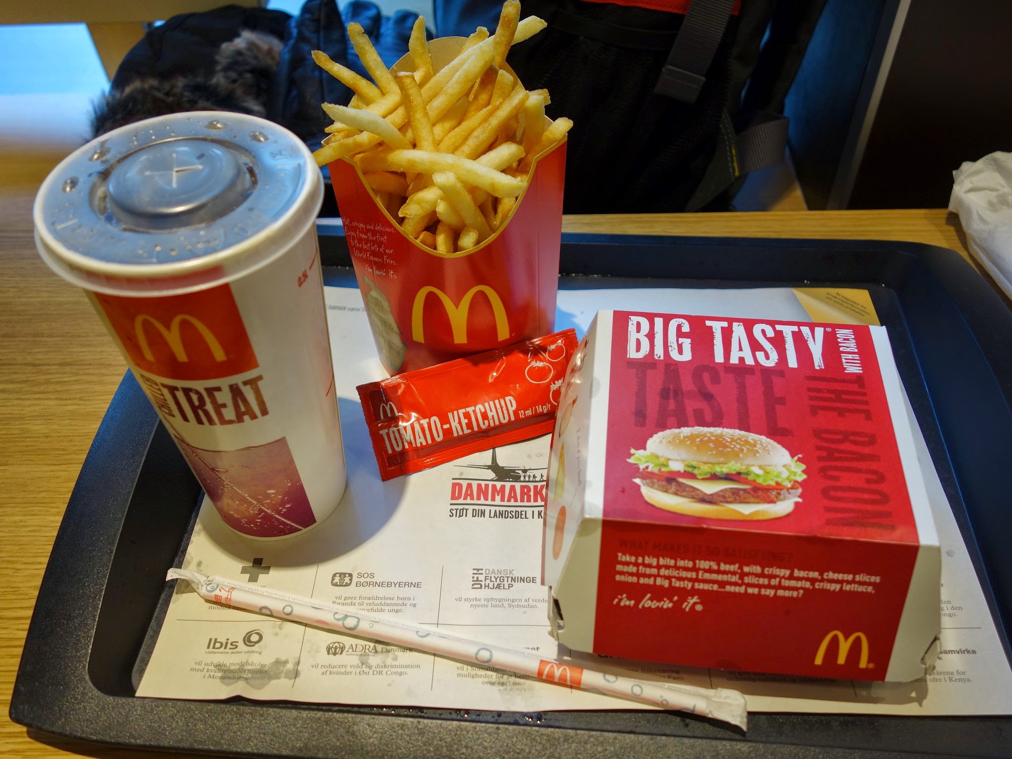 中午很俗氣的吃了麥當勞的牛肉培根堡,真是全球一致的口味,到哪裡吃都一樣。下午逛逛街,不知道是不是剛好有折扣季,好像每間店都打著Final Sale,不是對折就是三折的。有鑑於哥本哈根一月終日零度上下的氣溫,為了不被凍死,在我的托運行李出現之前,先去H&M大肆採購了一番貼身及保暖衣物。走一走看到一間樂高專賣店,這是我第一次進去樂高專賣店,對於用杯子裝整牆琳瑯滿目的樂高零件非常新奇,幸好我不是樂高控,否則這下加上大特價,肯定是要失血不少。