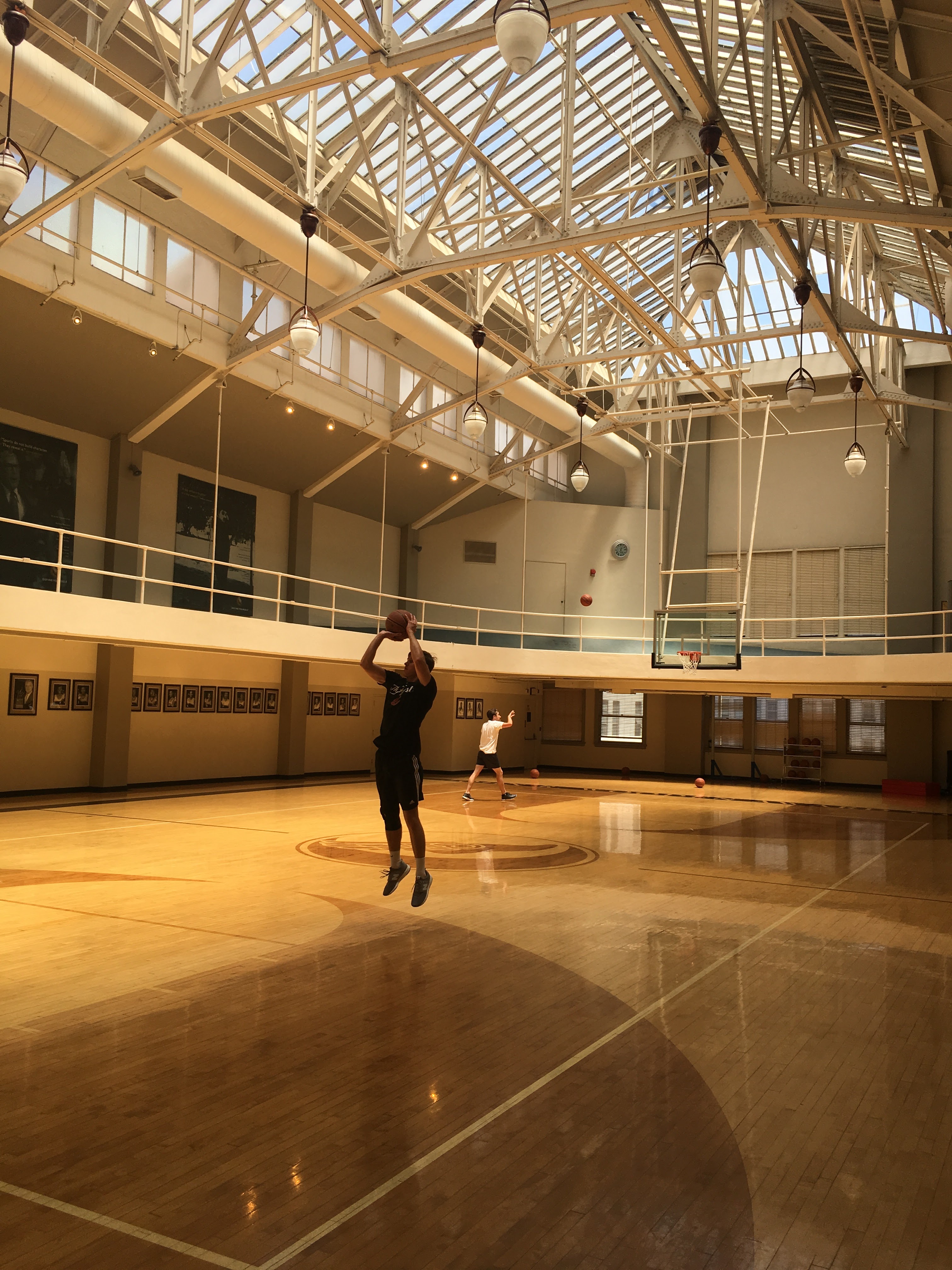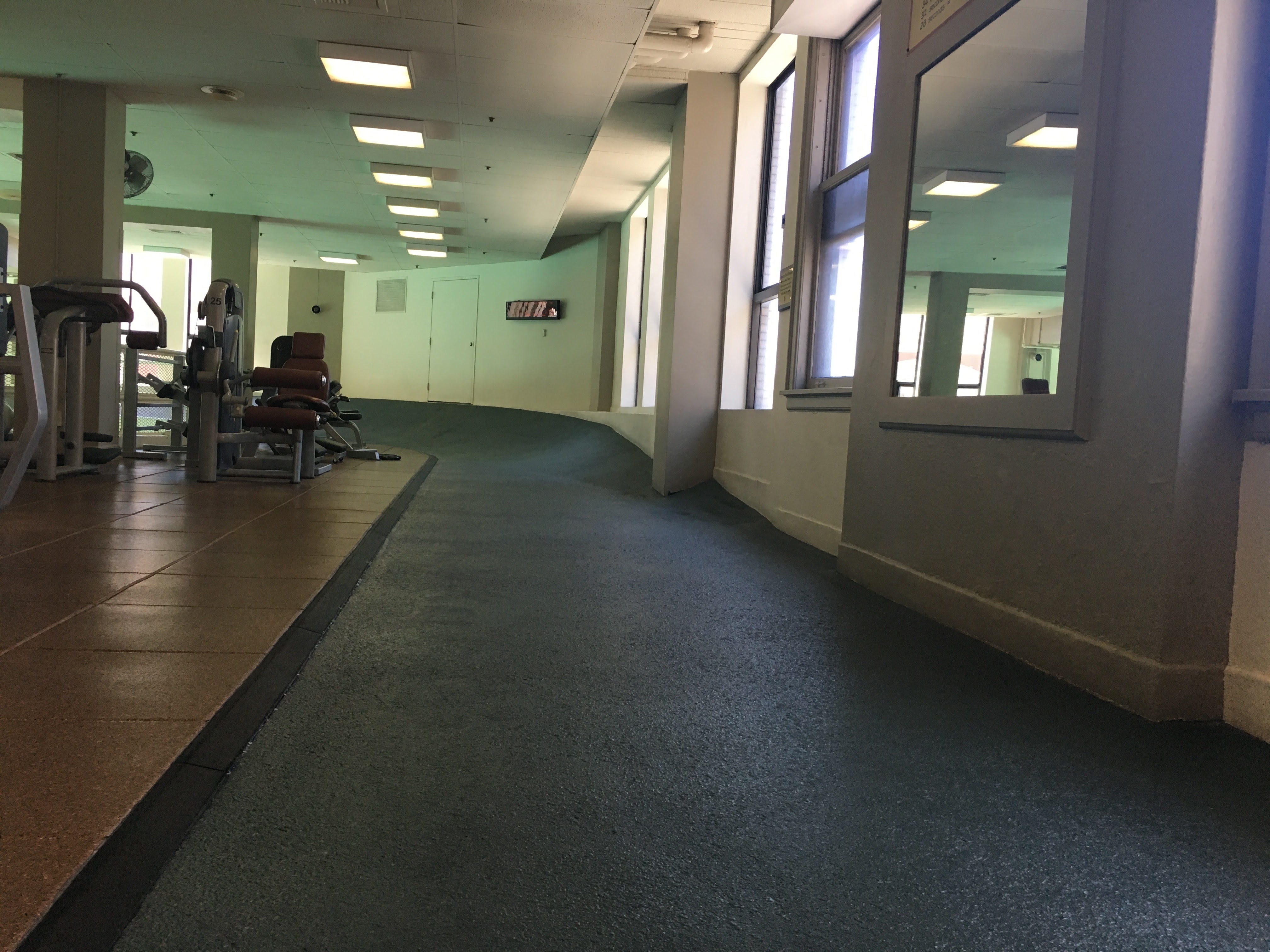 飯店的六樓是游泳池,有個天頂窗,藍綠色的光線從頂上灑下來,和泳池的顏色揉和得非常自然。另外一側是籃球場,有提供球,看到兩個人自己在投籃,更誇張的是樓上的健身房,環繞著整座建築內緣是一圈跑道!跑道走到轉角處還會傾斜提供向心力!飯店還有各種運動課程和短期的比賽,住客也都可以參加!