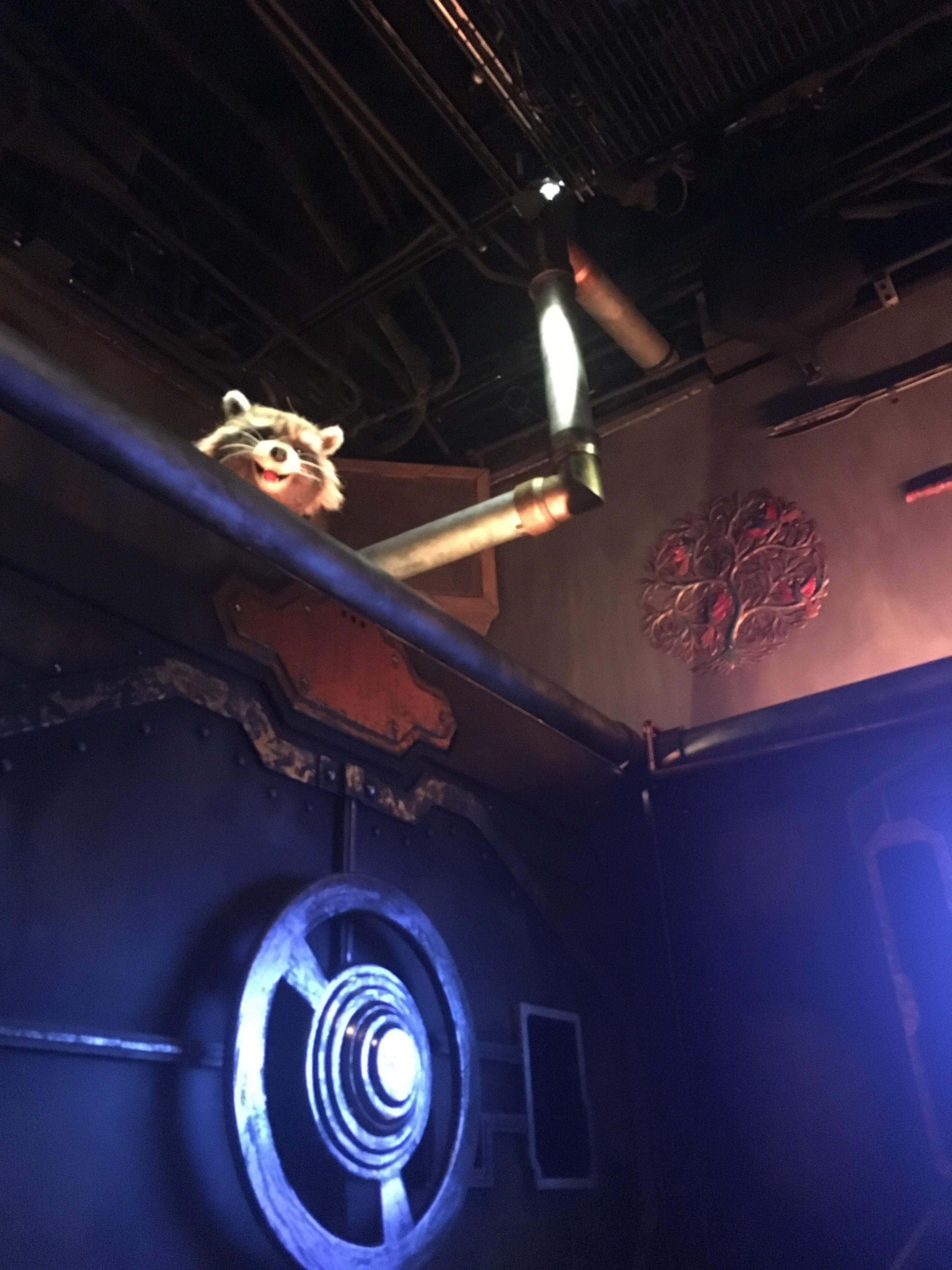 一進去就來到collector的收藏室,突然!上面出現一隻Rocket啊啊啊啊啊啊啊啊!好像啊啊啊啊啊太真實啦那東西到底真的假的啊啊迪士尼的科技已經做出會說話的浣熊了嗎啊不能說是浣熊啊啊可是實在太不科學啦怎麼弄的啦啊啊啊!!接著我們就坐進Rocket即將要切斷纜繩的電梯裡!!實在好緊張啊我這輩子還沒坐過自由落體啊!!門一關,啊啊啊啊啊啊啊啊就掉下去啦!!!接著又上上下下反彈了好幾回,每一次暫停都會打開門看到星際異攻隊的成員們在跟觸手怪搏鬥,但其實那只是超級高畫質的影像,不是真的開門。但有一次真的開門了!望出去就是迪士尼的夜景!我一個瞬間以為還是超高畫質影像啊!眼睛實在是太容易受到矇騙了啦!!