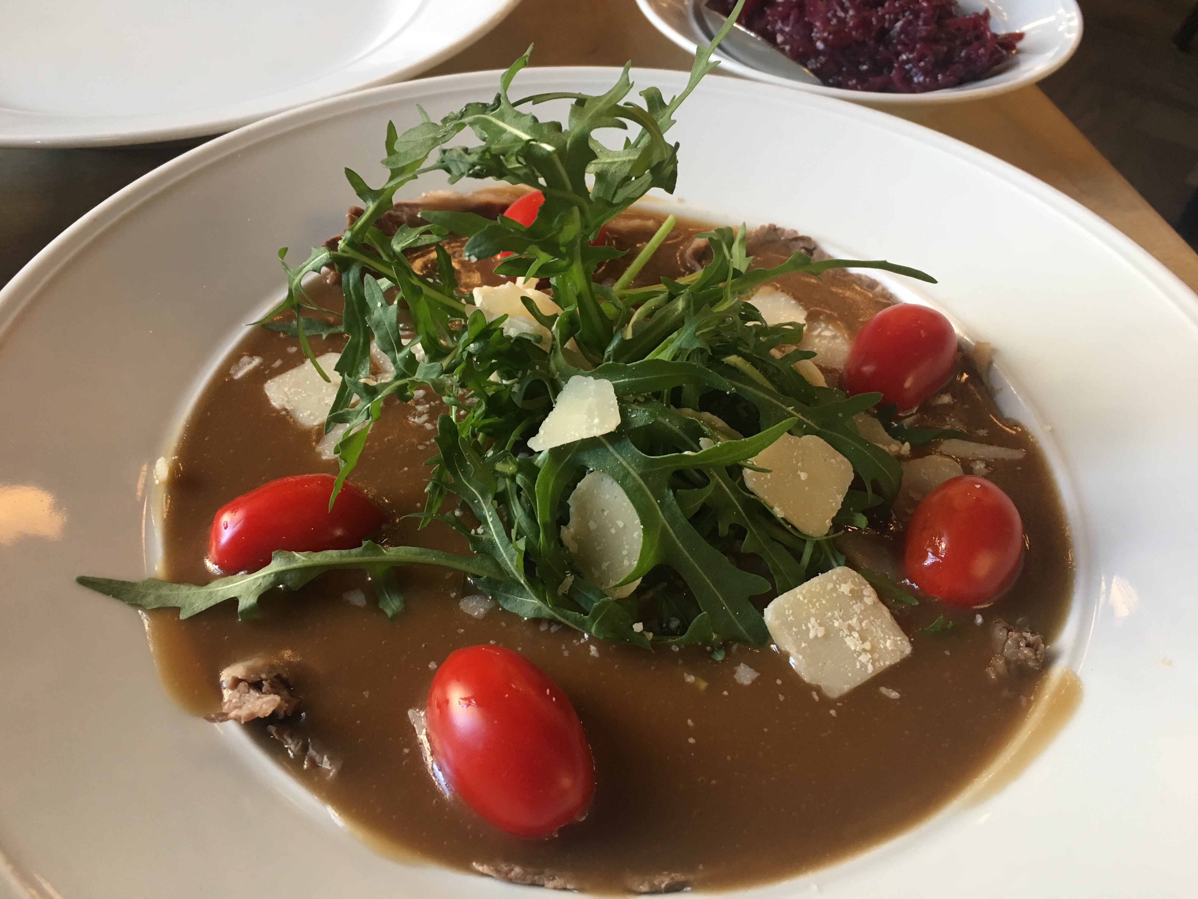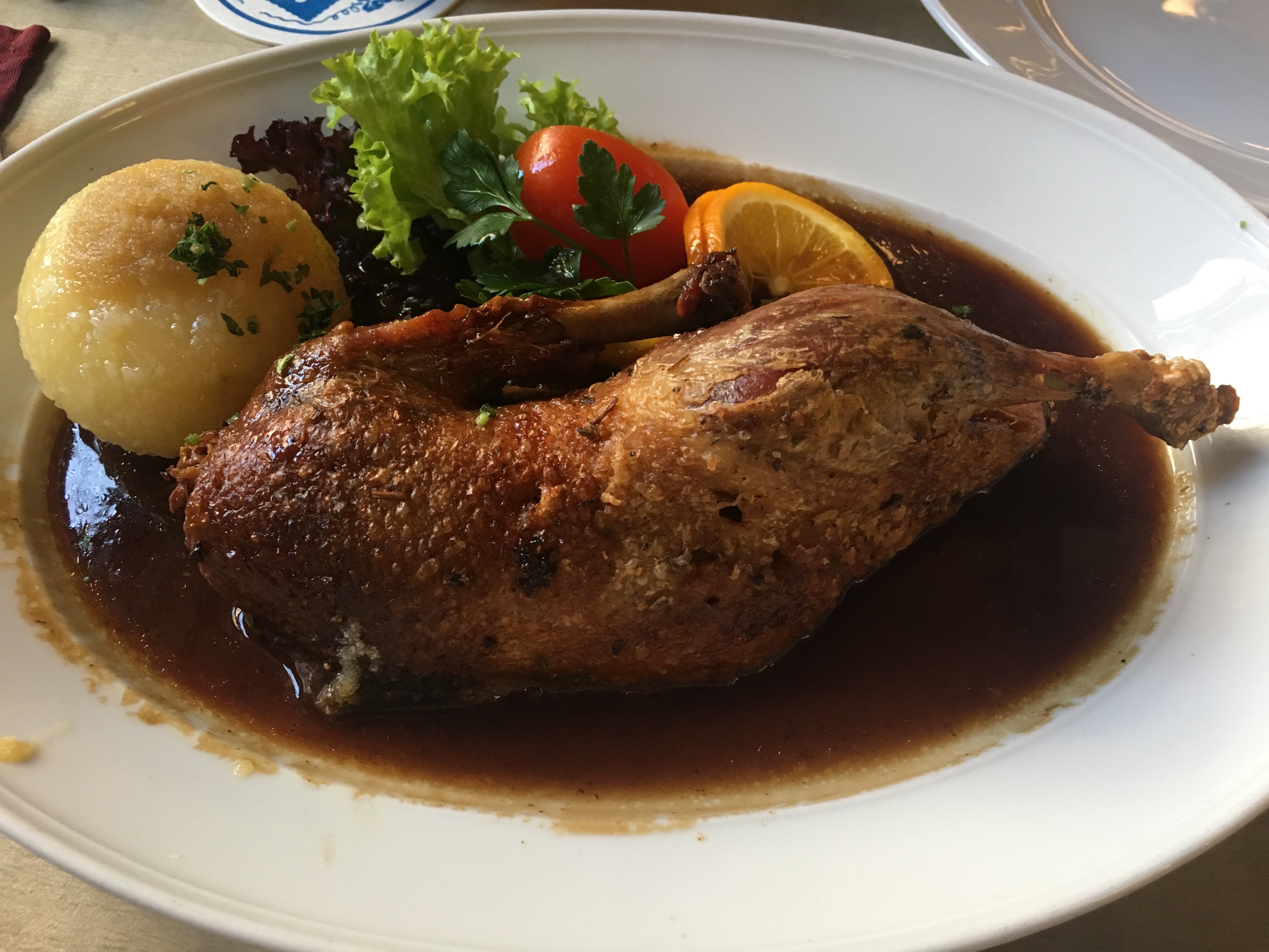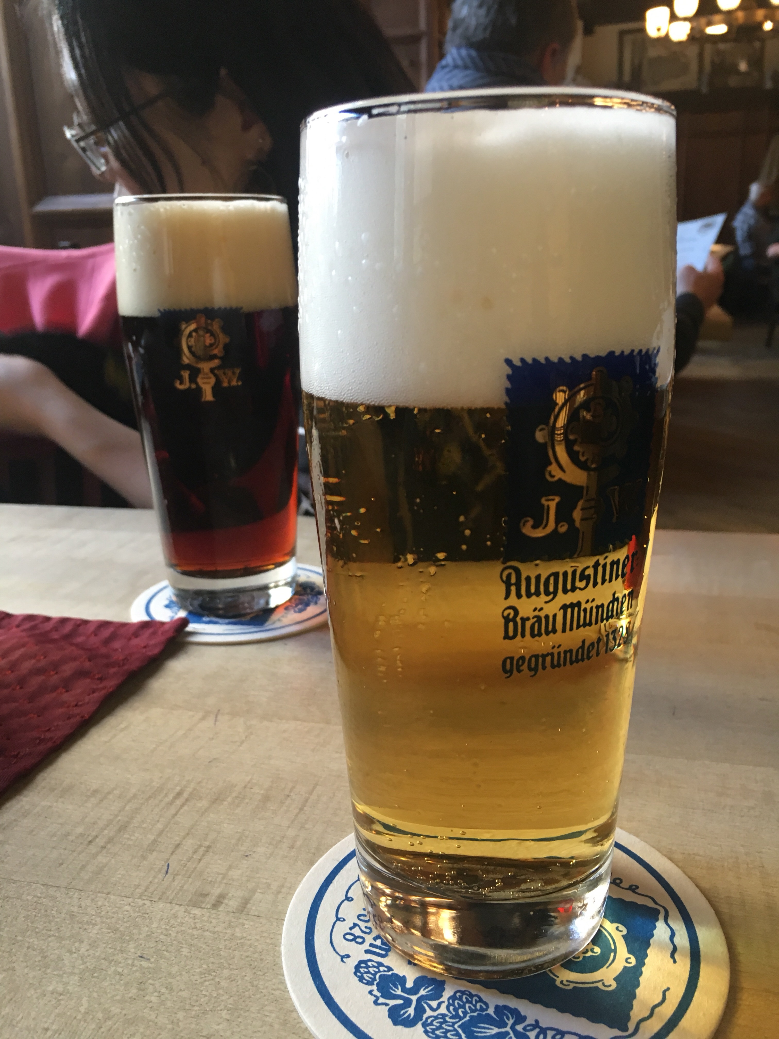 晚餐吃了一間超級老牌的酒廠餐廳Augustiner Klosterwirt,點了一道冷菜是燉牛肉片搭配醋做的醬汁,還有一道烤半鴨主餐,配兩杯不同口味的啤酒,真是樣樣好吃啊!尤其那道冷菜,牛肉和醬汁的酸味搭配上菜葉的微苦,真是恰到好處的融合在一起,嚥入喉後,再配上一口黑啤酒,那溫潤的酒液把方才的味道再一次回味,真是令人驚艷不已!烤鴨也是火候到位,皮脆肉嫩不乾柴,不過德國菜的醬汁似乎都偏鹹,難怪都要配啤酒!結果我們兩個居然一個喝到有點醉,科科,笑點變很低。