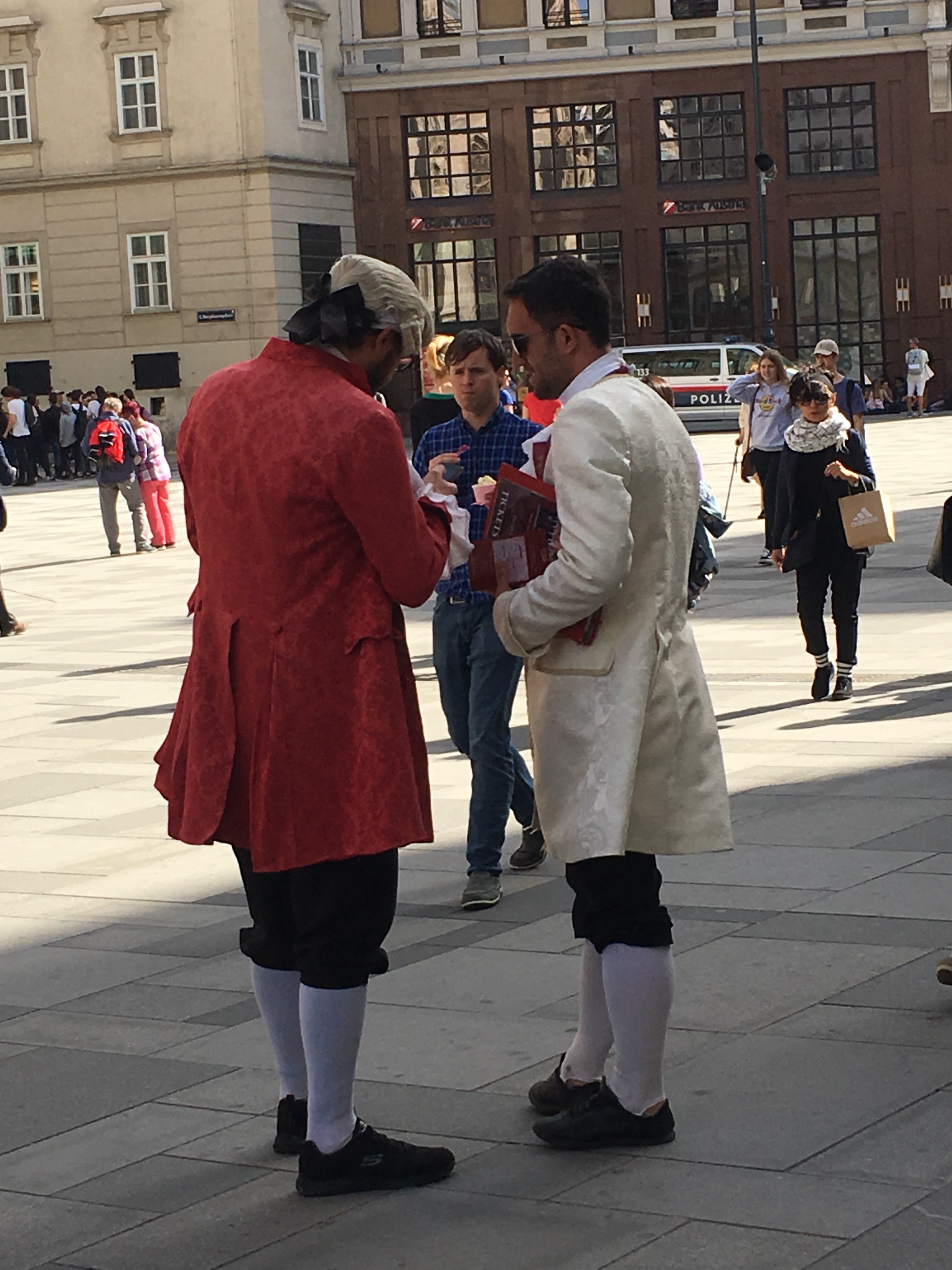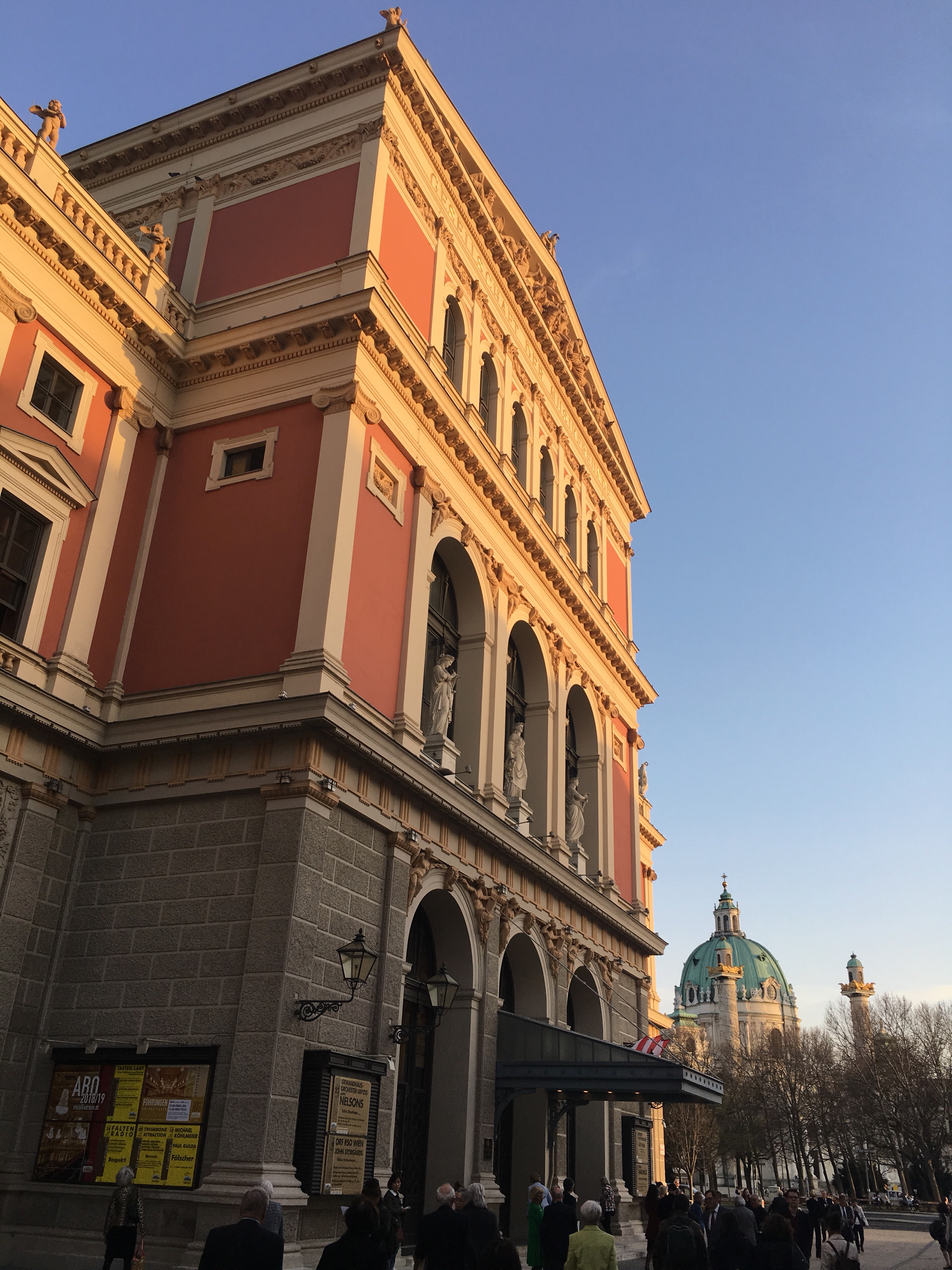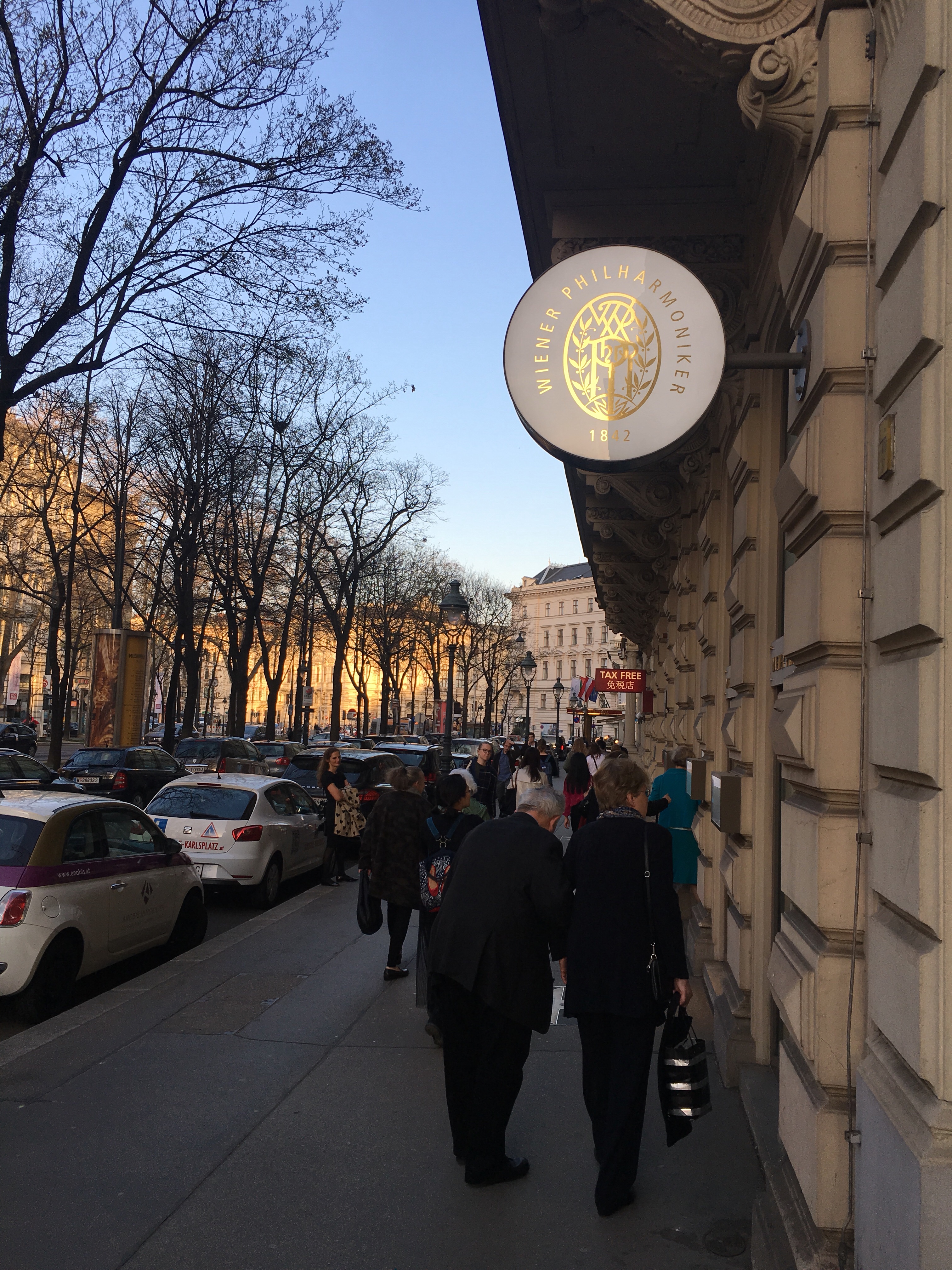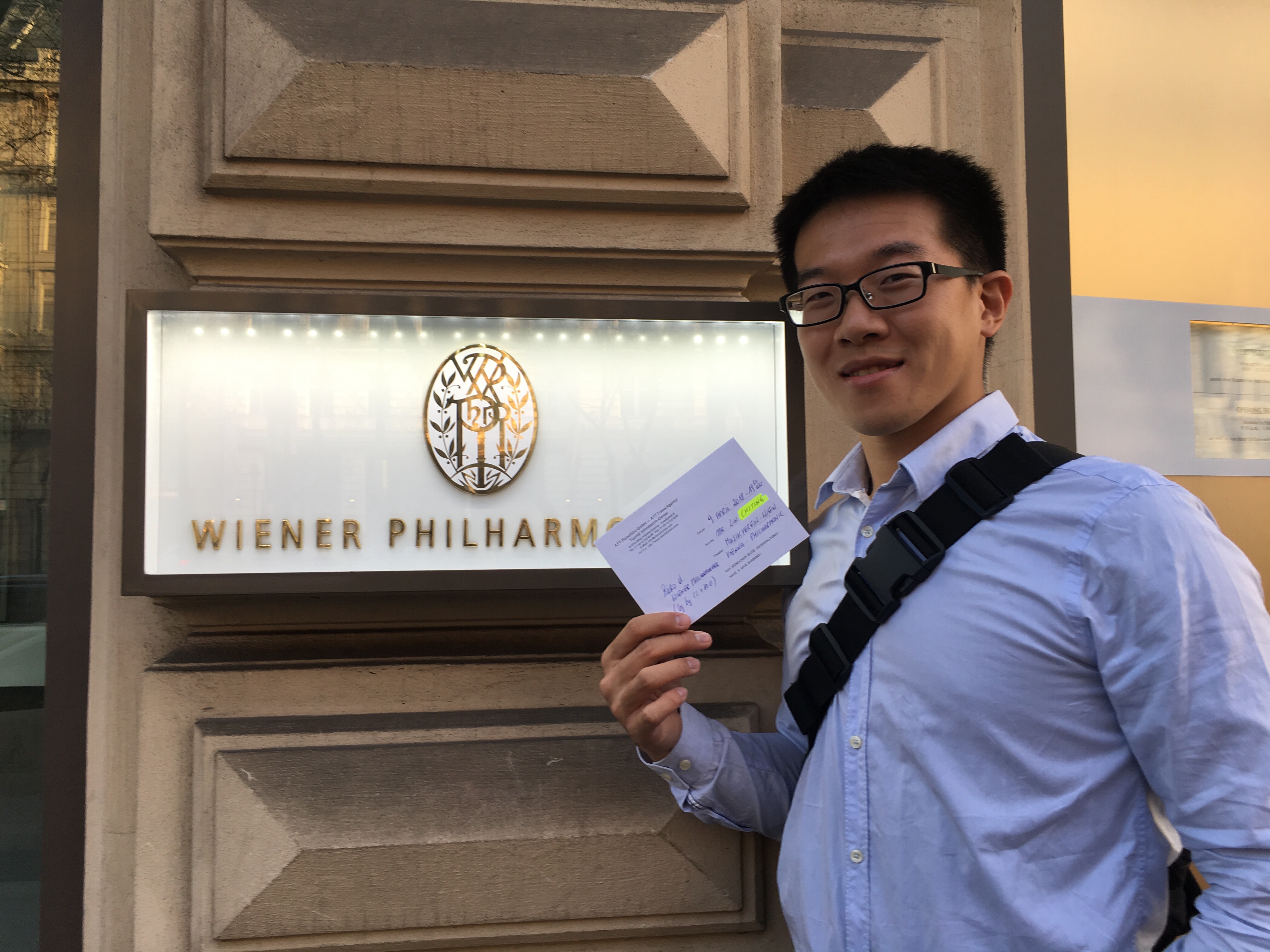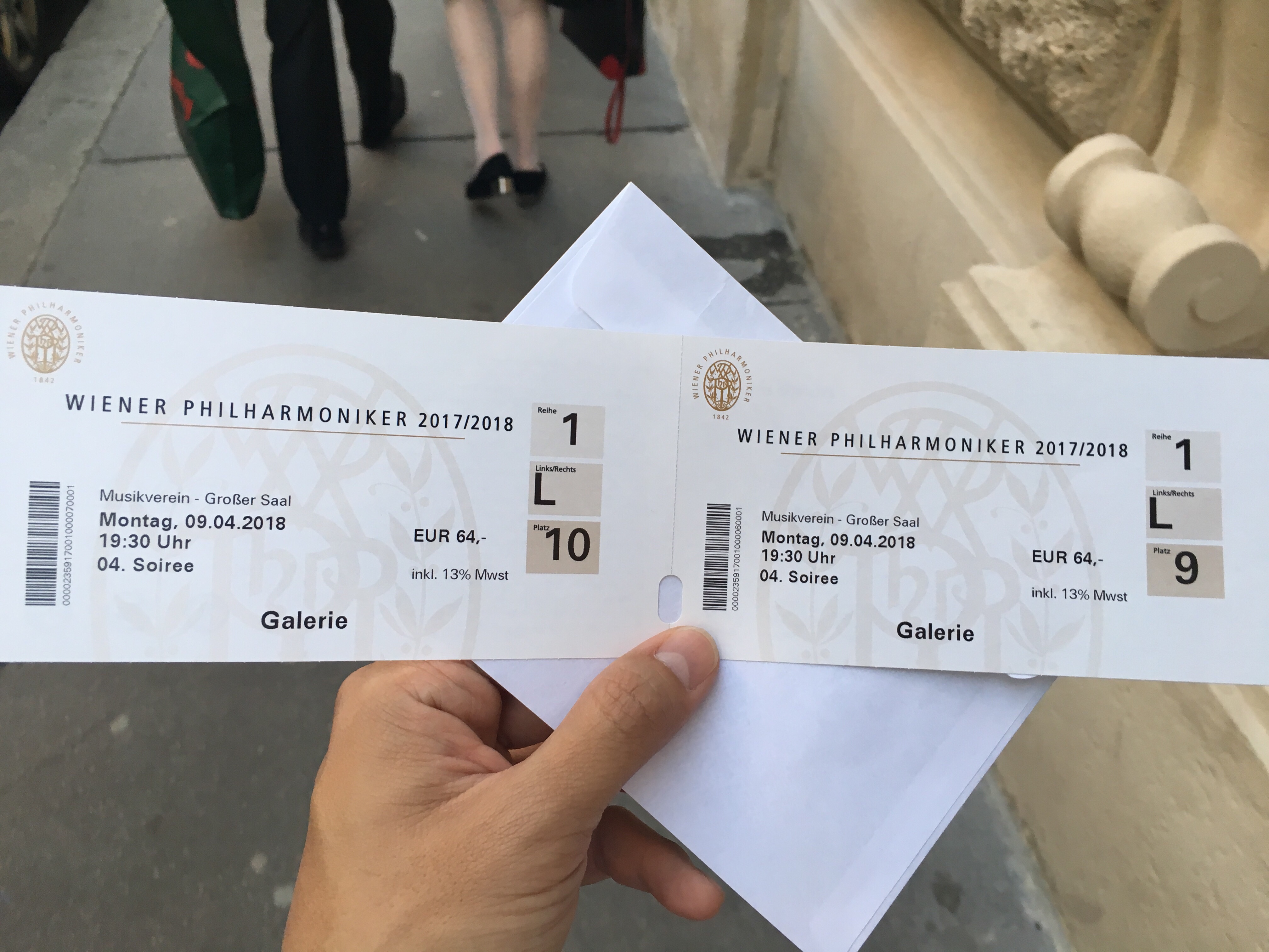 今天晚上還有一個重頭戲,那就是維也納愛樂在金色大廳的演奏!這張難得的票是我一個月前在網路上委託一間維也納公司ViennaTicket.com代買的,因為維也納愛樂的票會優先賣給會員,剩下的票則會在開演前一週在官網上販售,所以常常會搶不到票。這間公司幫我買到了位於三樓看台第一排正中央的兩個位子,一張票要價新台幣3000多元,算是實在的價格。我們稍微穿了正式一點點的服裝(依然穿這運動鞋),先來到在環狀大街上的愛樂辦公室拿票,再跟隨各種盛裝打扮的人們前往一個街區外的金色大廳。
