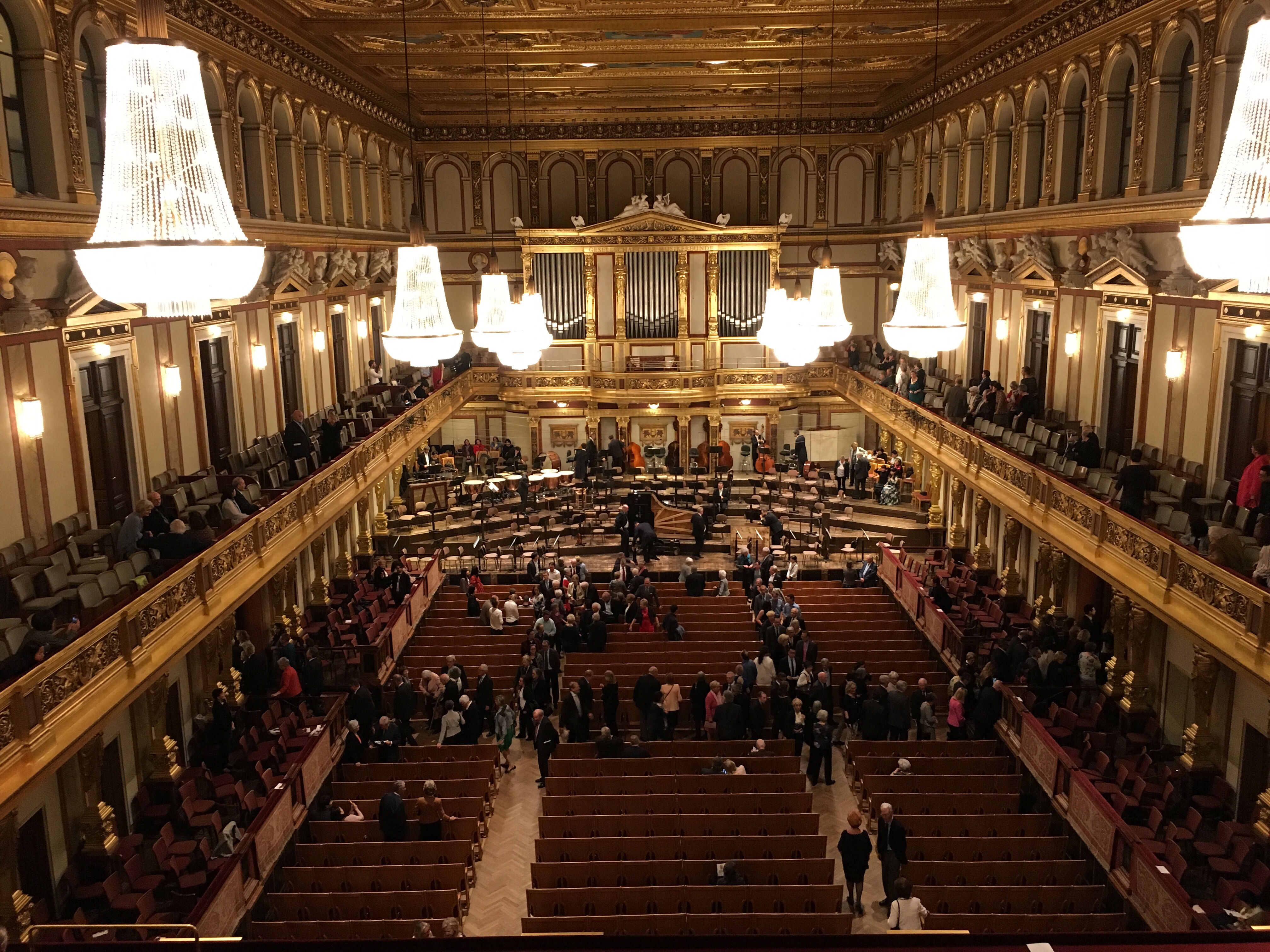 好不容易上到看台,我們的位子果然就是面對著舞台的正中央,簡直無可挑剔!金色大廳的內裝果真不同凡響,整間演奏廳漆得金碧輝煌,牆上和屋頂的雕刻與壁畫細緻,兩側還有各位音樂大師們的雕像。座位是木頭椅子,挪動姿勢的時候會微微的幾嘎幾嘎得響,害我整場都不太敢亂動,坐到關節都硬了。