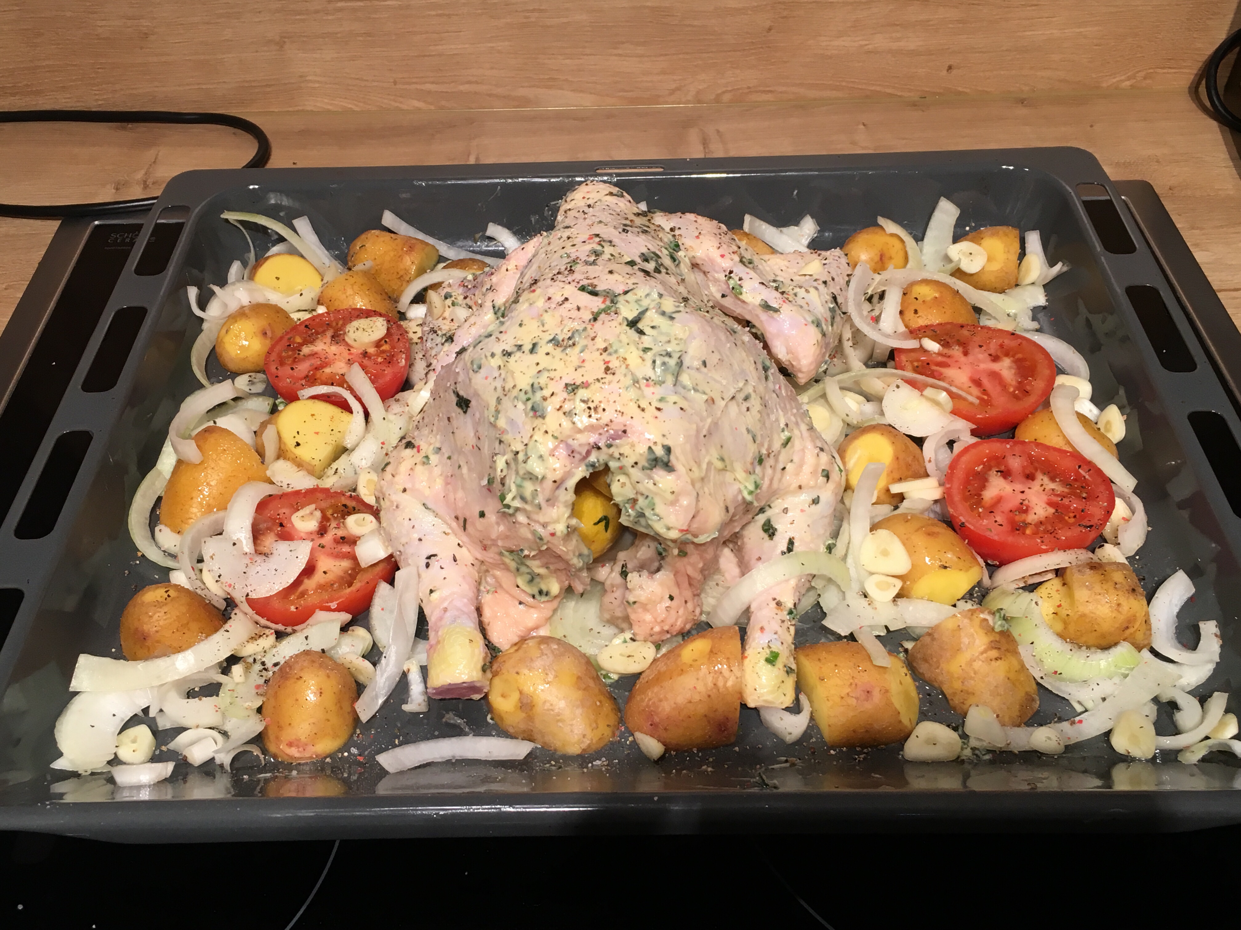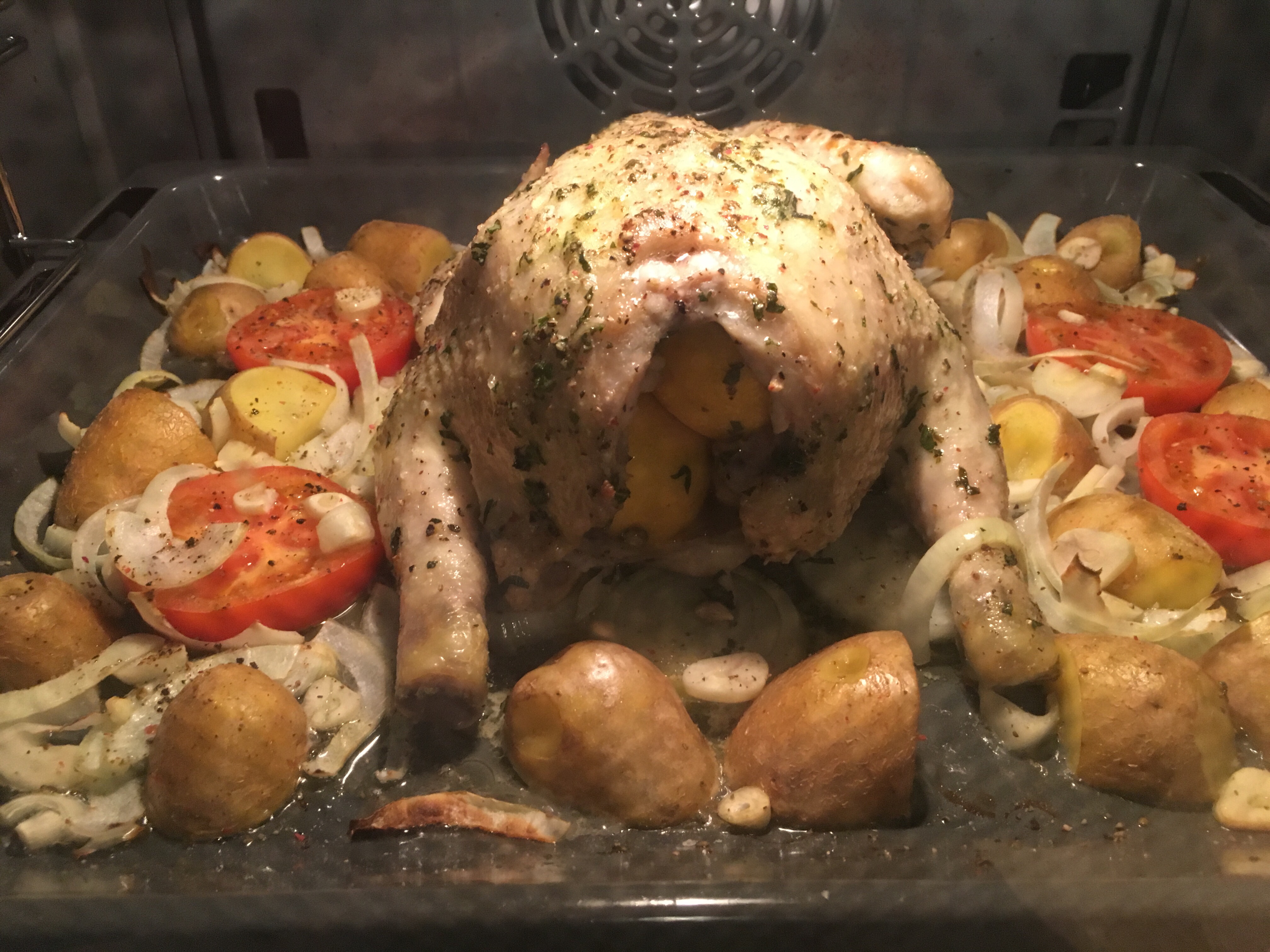 因為沒有前一天先醃過雞,只好走一個懶人全雞食譜系列,要在雞皮和雞肉間抹上大量奶油和著調味料,其實也不難做,只是我扯一扯雞皮就破啦!也沒東西可以把雞皮縫起來進去烤,乾脆就算了!在雞肚子裡塞了番茄洋蔥、和食譜上說要放的切半檸檬,就進去烤了!