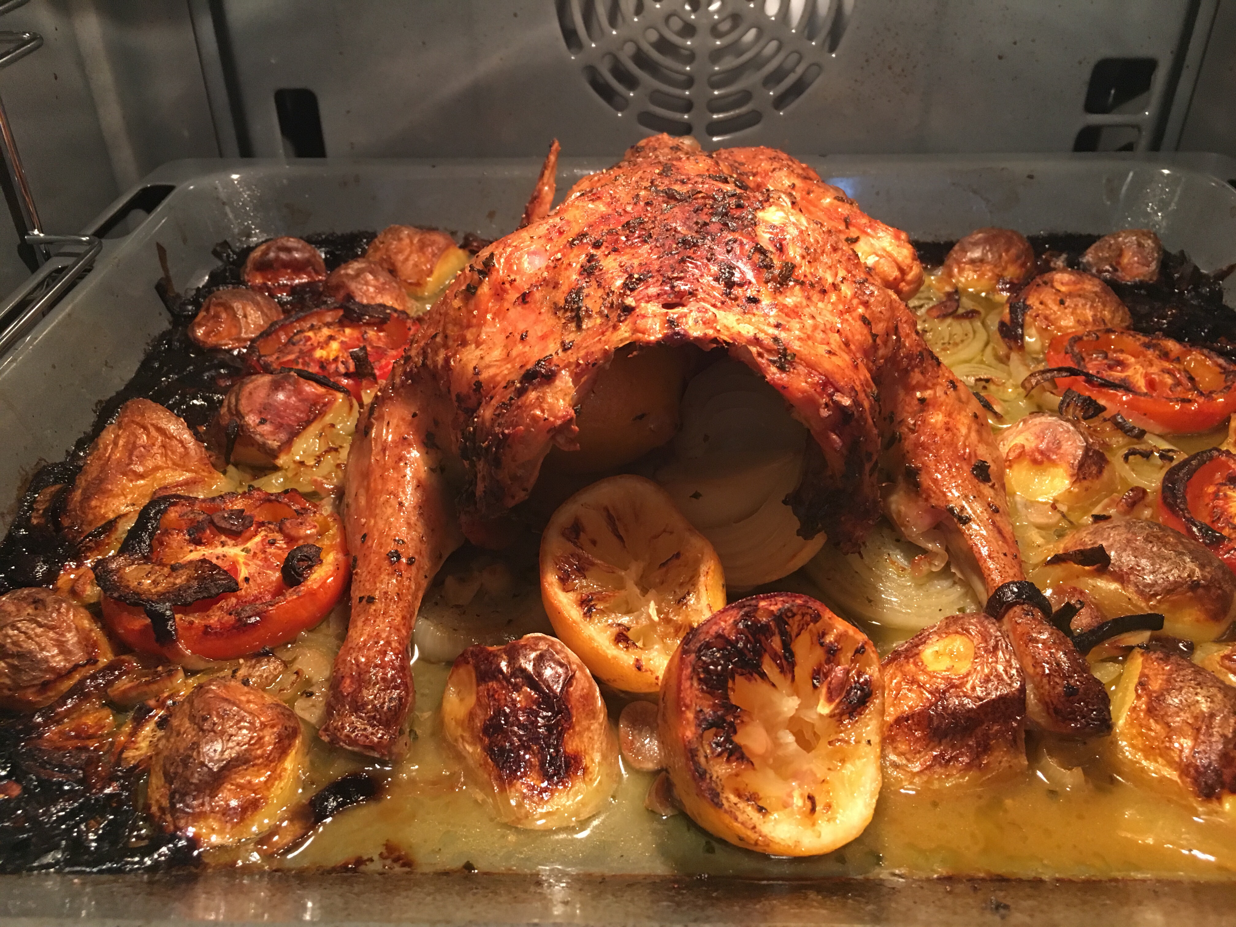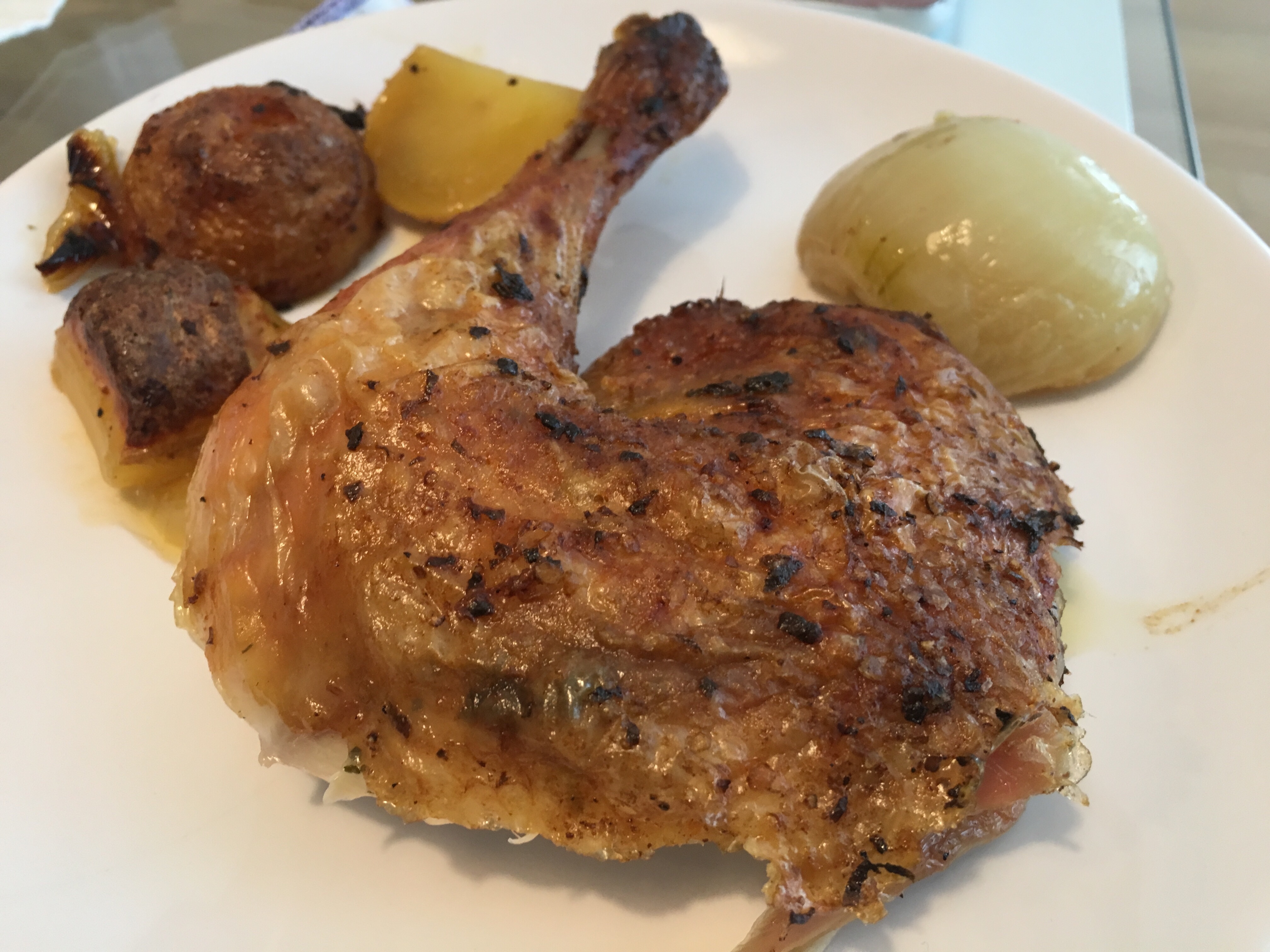 一個多鐘頭後,生雞變成了脆皮烤雞。檸檬從雞屁屁掉出來了,結果害得底下的蔬菜們都變得很酸XD。雞肉還不錯吃,但有點微乾,看來下次還是得想辦法把雞綁好縫好才行。