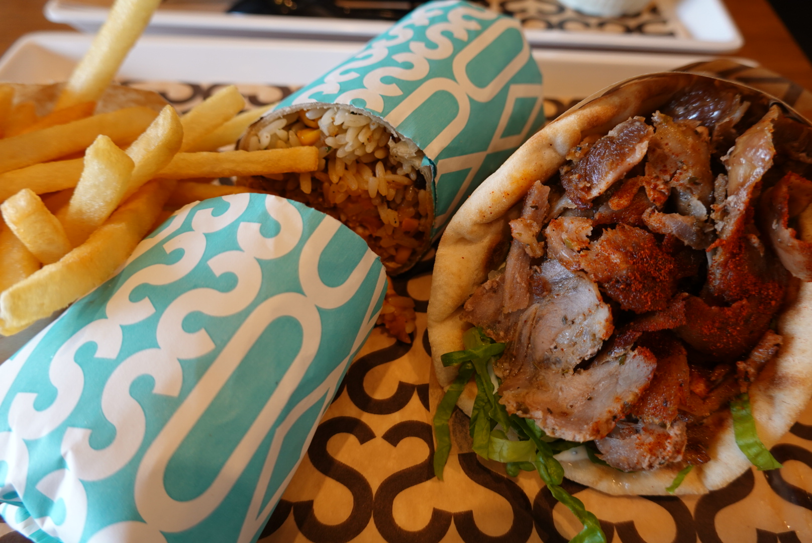 中午在會場對面的希臘捲餅速食店Suvlas吃飯,點了一個沙威瑪捲餅、一個像是塞了蕃茄蛋炒飯的捲餅、和一個希臘沙拉,居然就要台幣七百多塊錢(而且還不太好吃,果汁有種發酵感)!