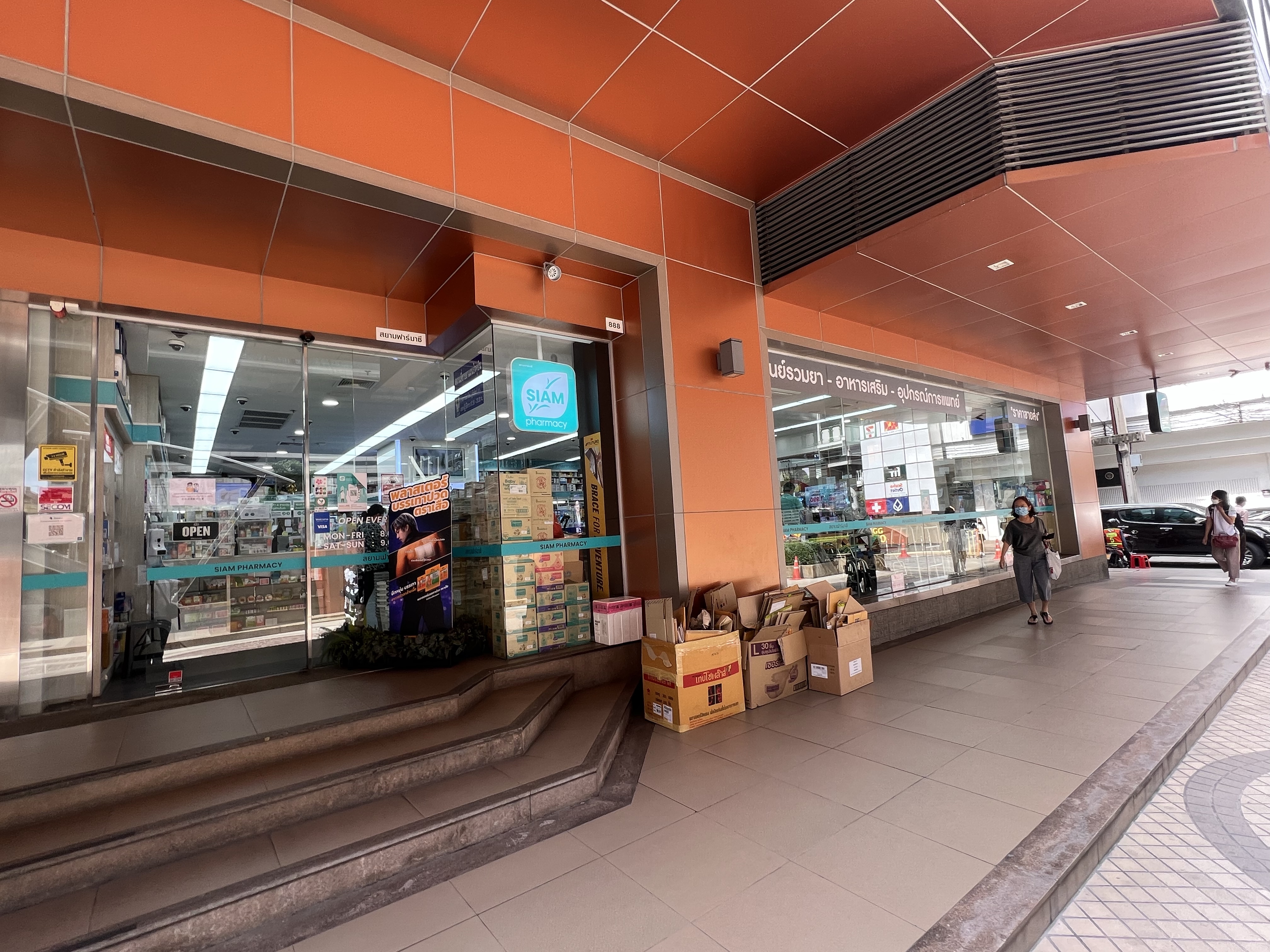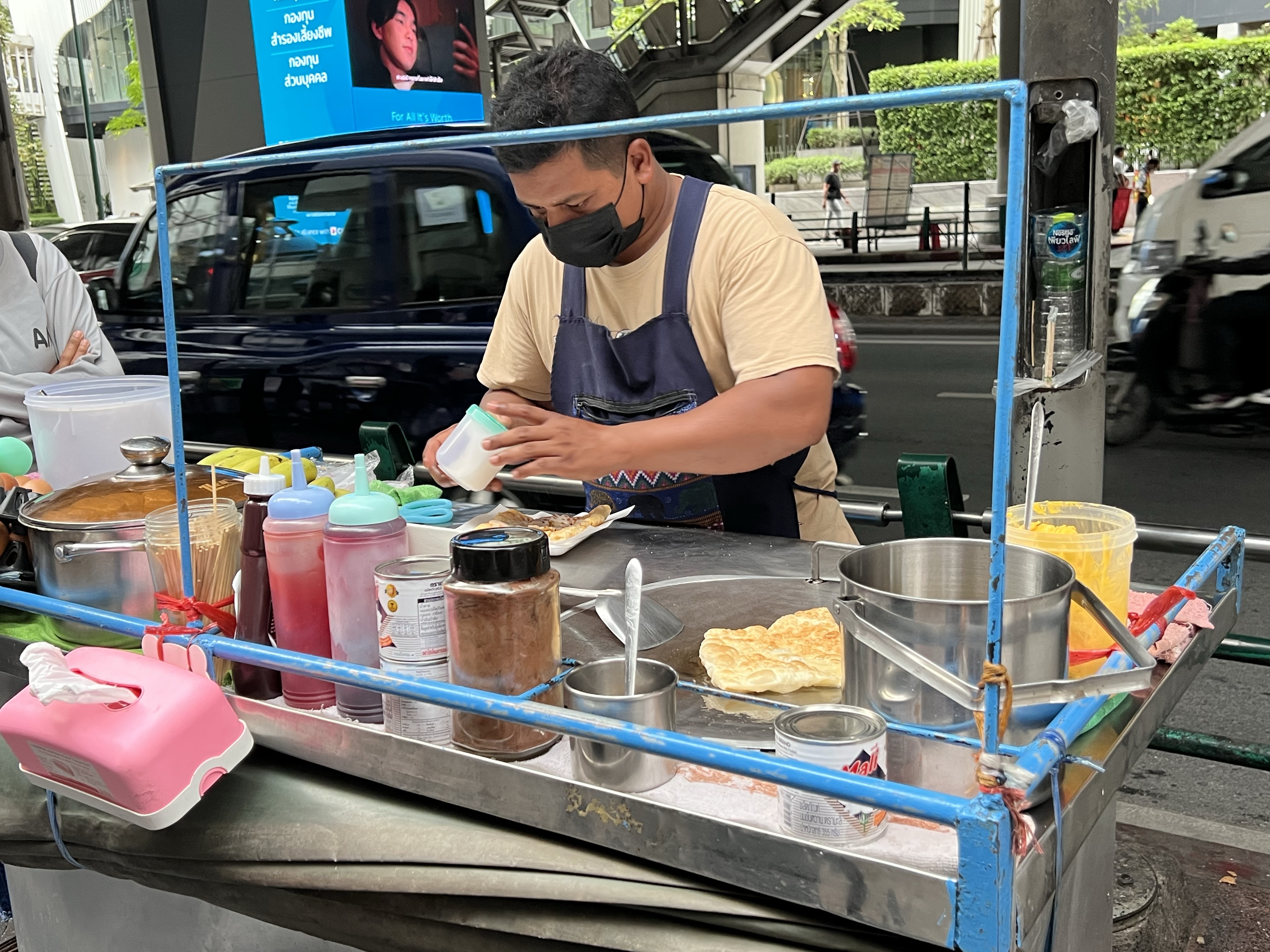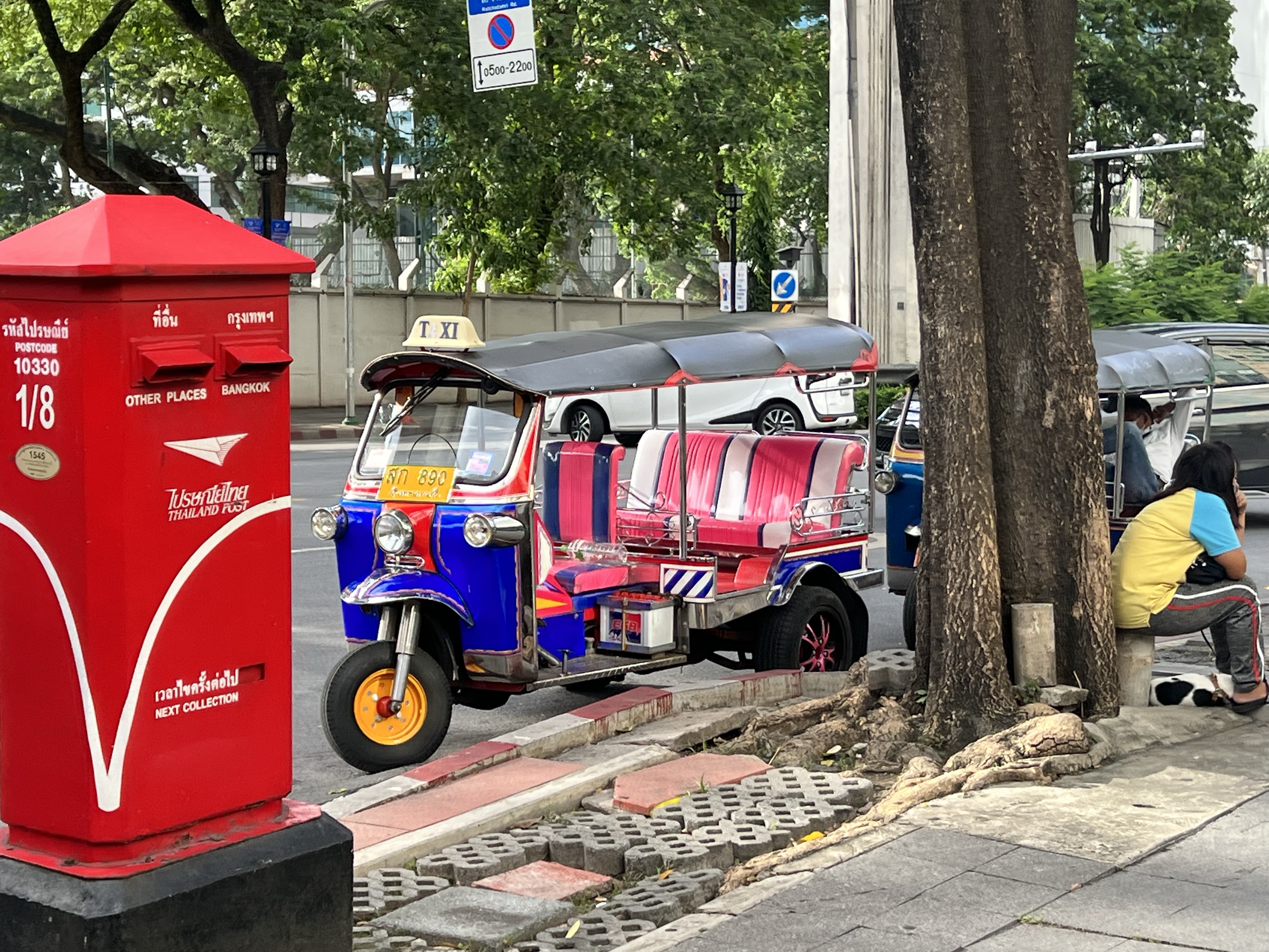 稍微在大廳的沙發上發個懶,緩緩剛才被計程車摧殘的半規管,就出發去感受一下早上上班時段的曼谷了。旁邊轉角就是從早到晚都很多人的四面佛,門口的小販有賣花束貢品的,還有賣一籠籠等著被放生的斑鳩類生物。路旁的人行道不寬,地磚也到處是破碎的凹凸,遇到公車站或共享腳踏車站就會被吃到幾乎只剩單人走過的寬度。在一旁的7-11買了一罐優格和一罐椰子水喝,繼續往前就有不少辦公大樓,人行道上則是一整排賣早餐給上班族的小販,有蛋餅、三明治、炸雞翅等等,還有不少賣切好的水果的。轉角處看到一個棚子下排了一些人,原來是摩托計程車的站點,在曼谷交通這麼瘋狂的地方,摩托計程車看來是唯一的辦法。