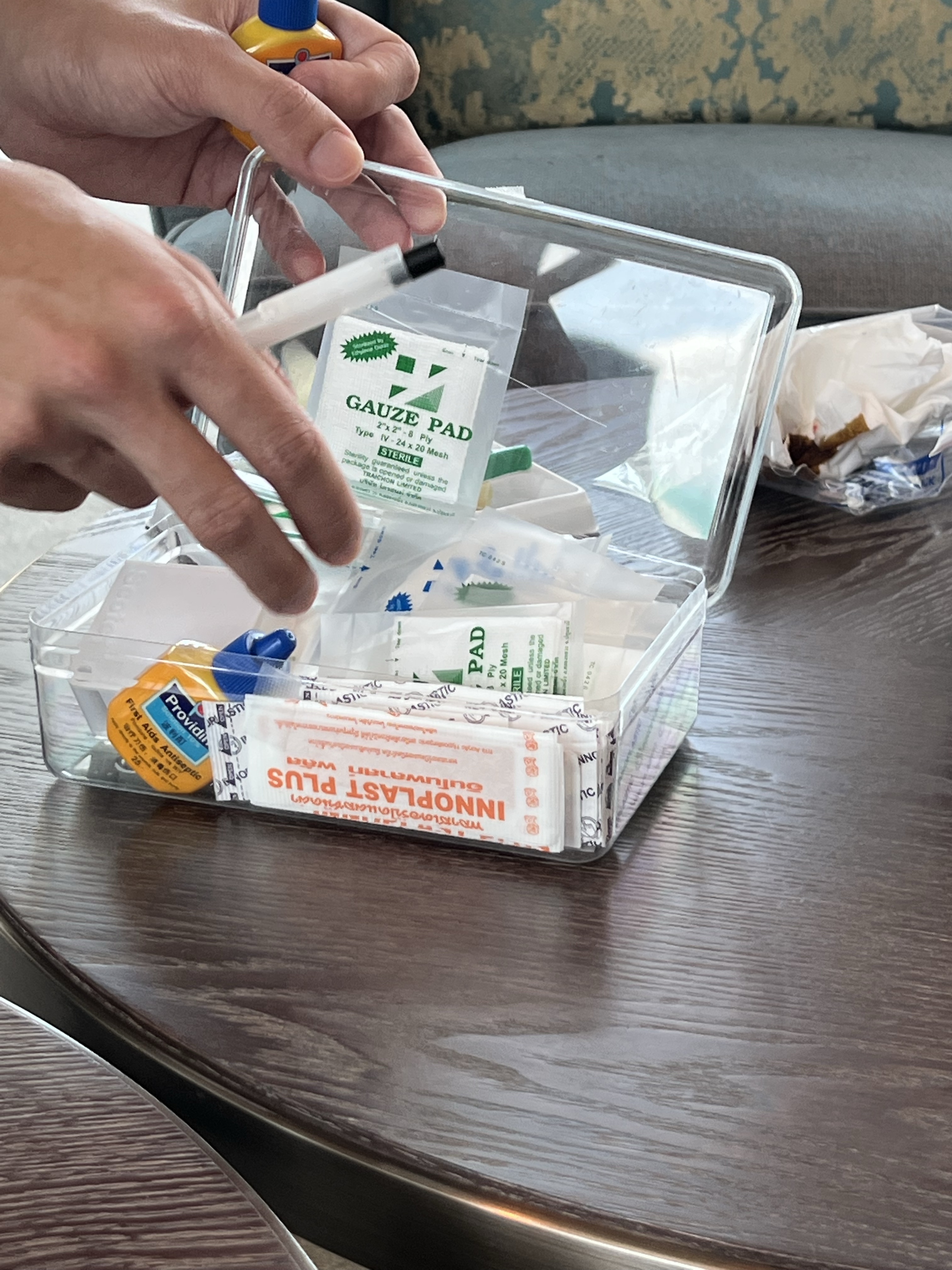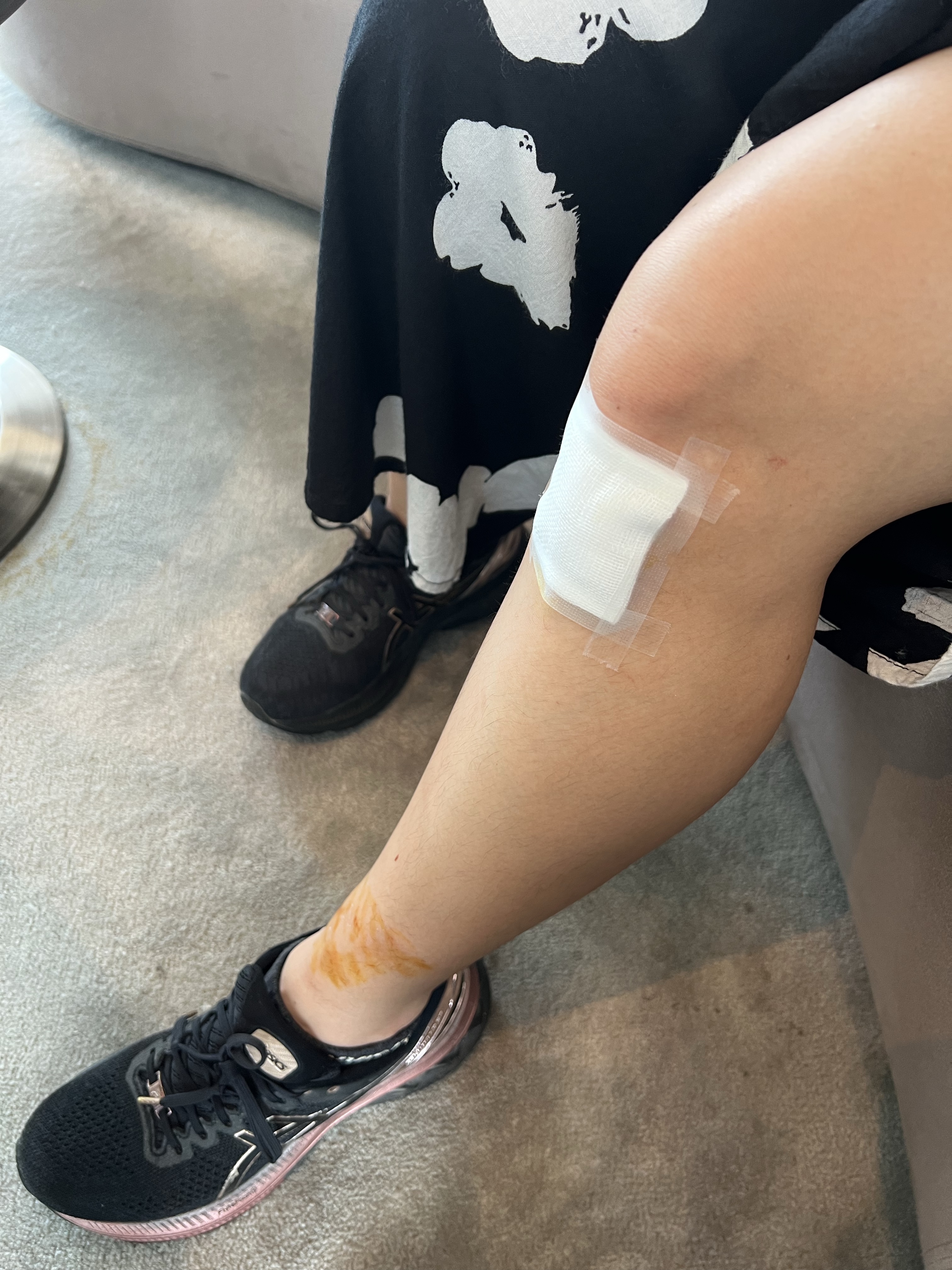 當場先拿水稍微沖洗過傷口,去前面經過的藥局買了防水貼布和消毒的用品,就直接走回飯店休息了。回到飯店,跟櫃檯說我們需要醫藥箱,櫃檯小哥看了茹茹正在流血的傷口大驚失色,趕緊傳了整組外傷消毒用品過來,整組沒拆封大概從來沒想過會用得上。我邊幫茹茹清傷口,旁邊好幾個服務人員都在圍觀,可能想要幫忙但也不知道能做什麼,大家就看我邊消毒邊被痛爆的茹茹爆捶。