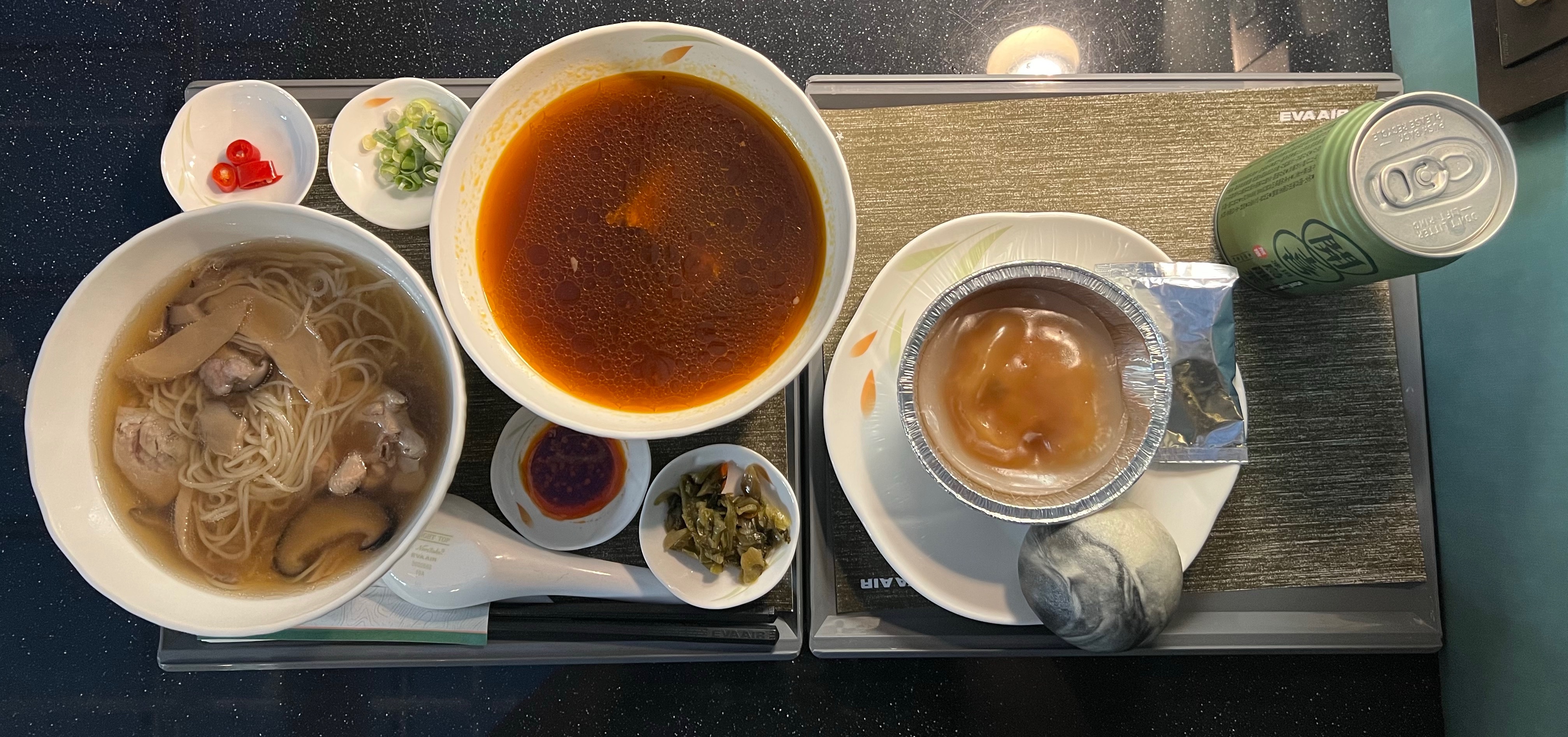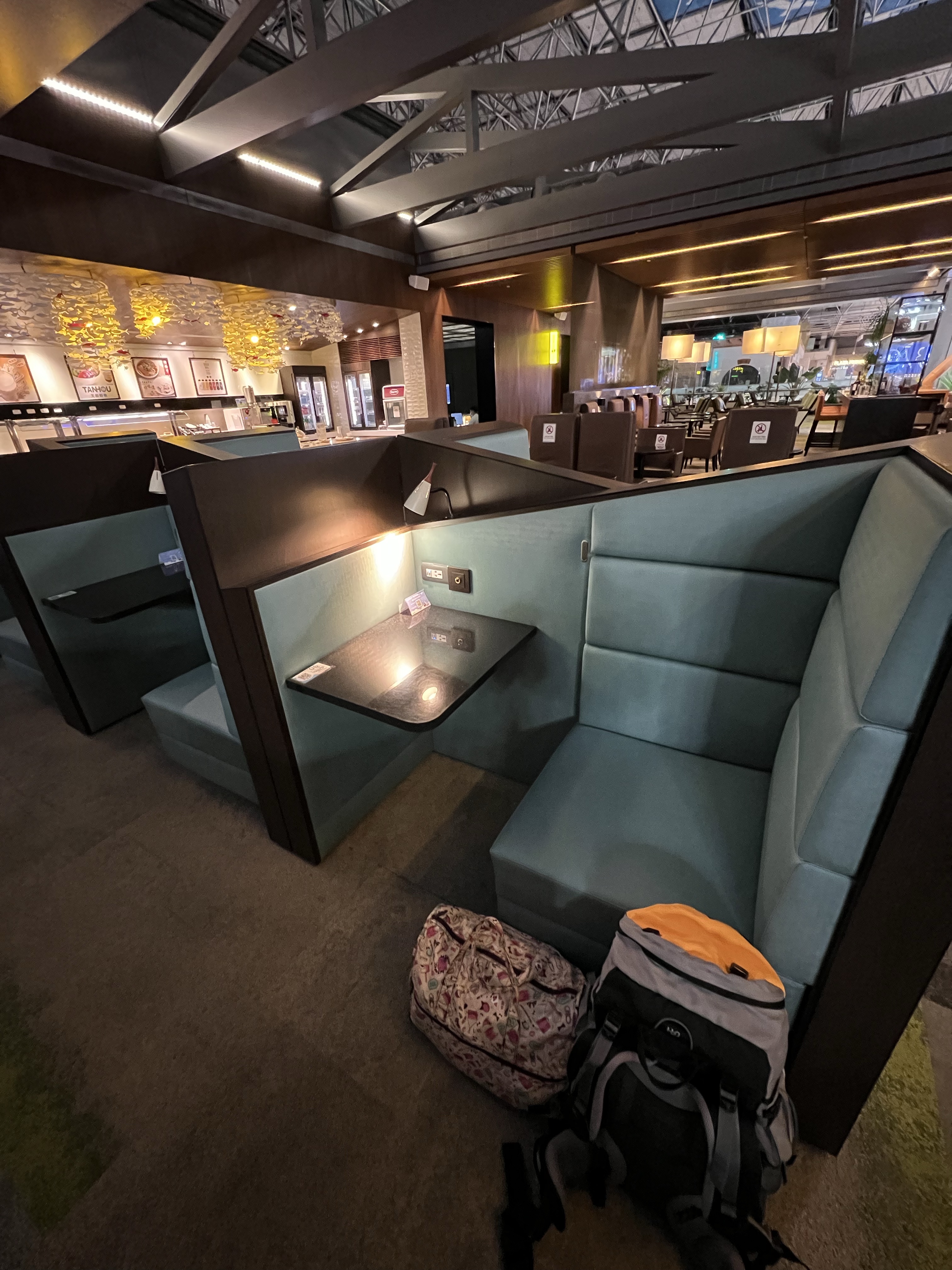 安檢完還有一個半鐘頭才登機,沒吃晚餐的我當然要去貴賓室吃一頓。這一年持有國泰長榮最高級的聯名卡總算有了回報,終於能進去The garden一探究竟!進去後覺得也沒什麼特別,就只是桌上有個QR code可以掃碼點餐,餐點也只有鼎泰豐提供的三種麵食:菇菇雞湯麵線、紅燒牛肉麵、和絲瓜麵線。點了前兩種來吃,再配上自助餐檯的蒸肉圓和流沙包,口味口感都夠水準,不過對台灣人來說應該就覺得沒什麼特別。吃完東西原本想沖個澡再上機,結果淋浴間因為疫情居然還沒開放,我實在是不太能理解為何最高等級的貴賓室不能淋浴,但桃機公有的淋浴間卻已經開放這種事。但反正就這樣吧,去廁所漱漱口洗洗臉、拿紙巾沾水擦擦就算了。