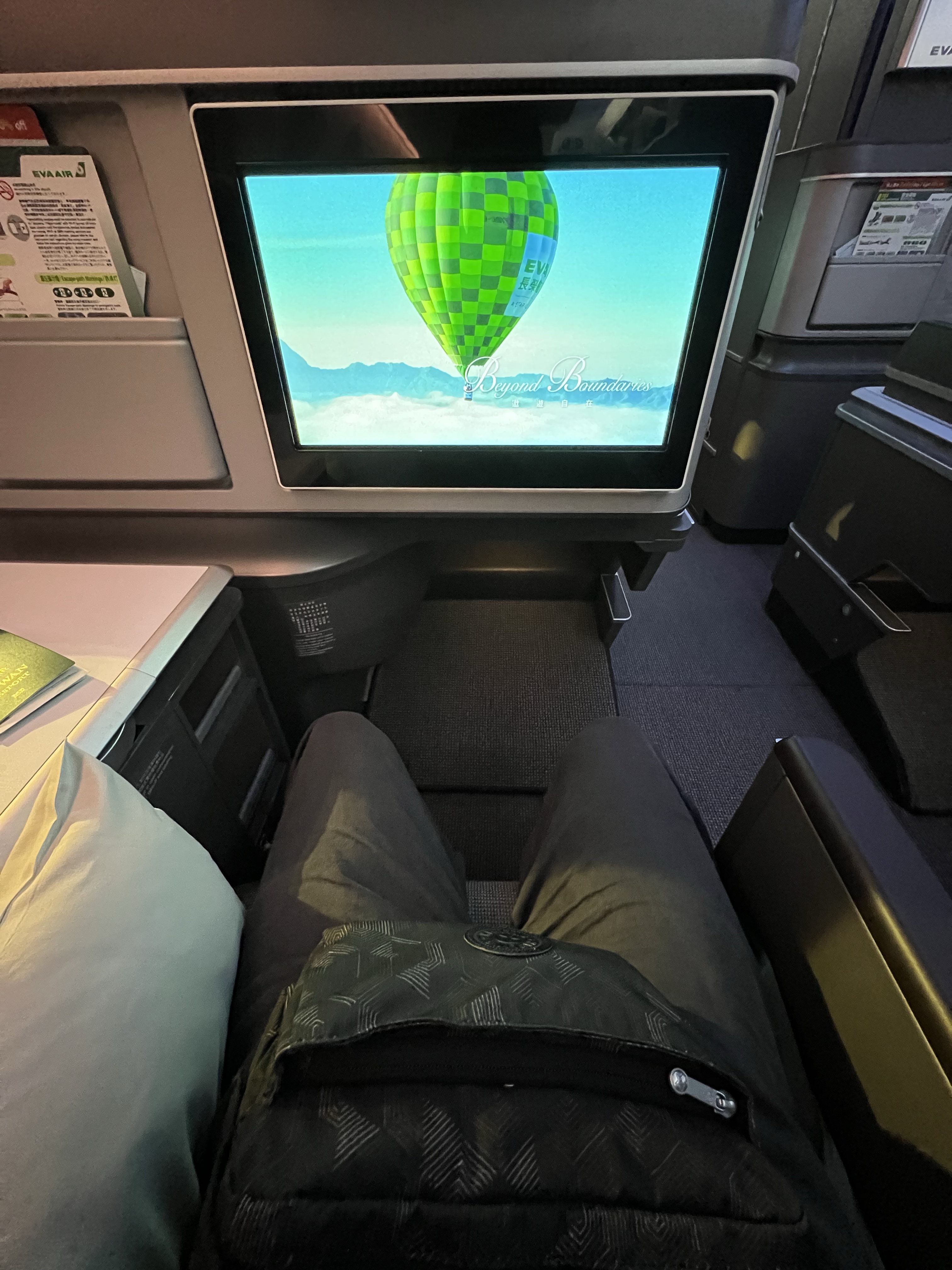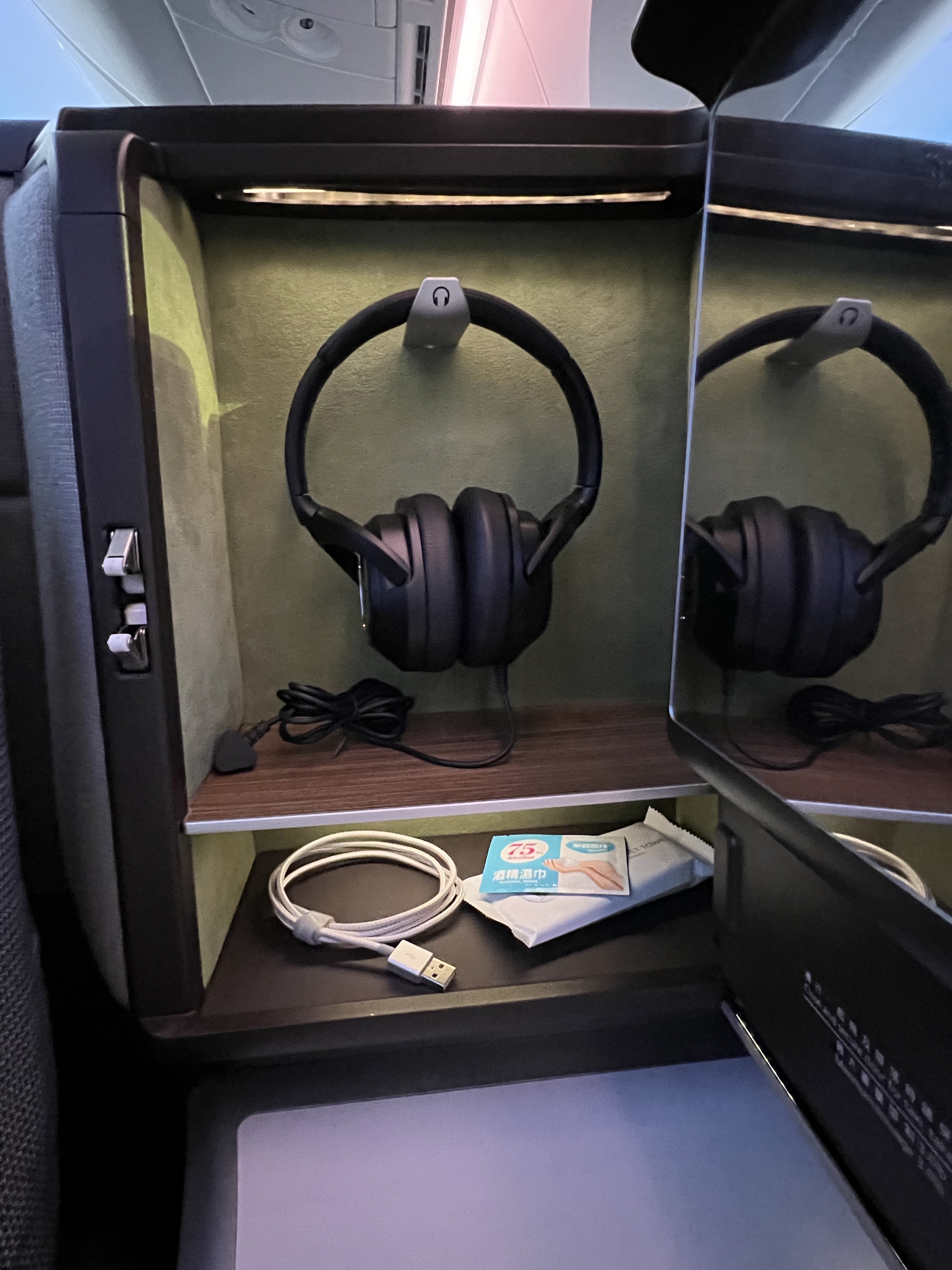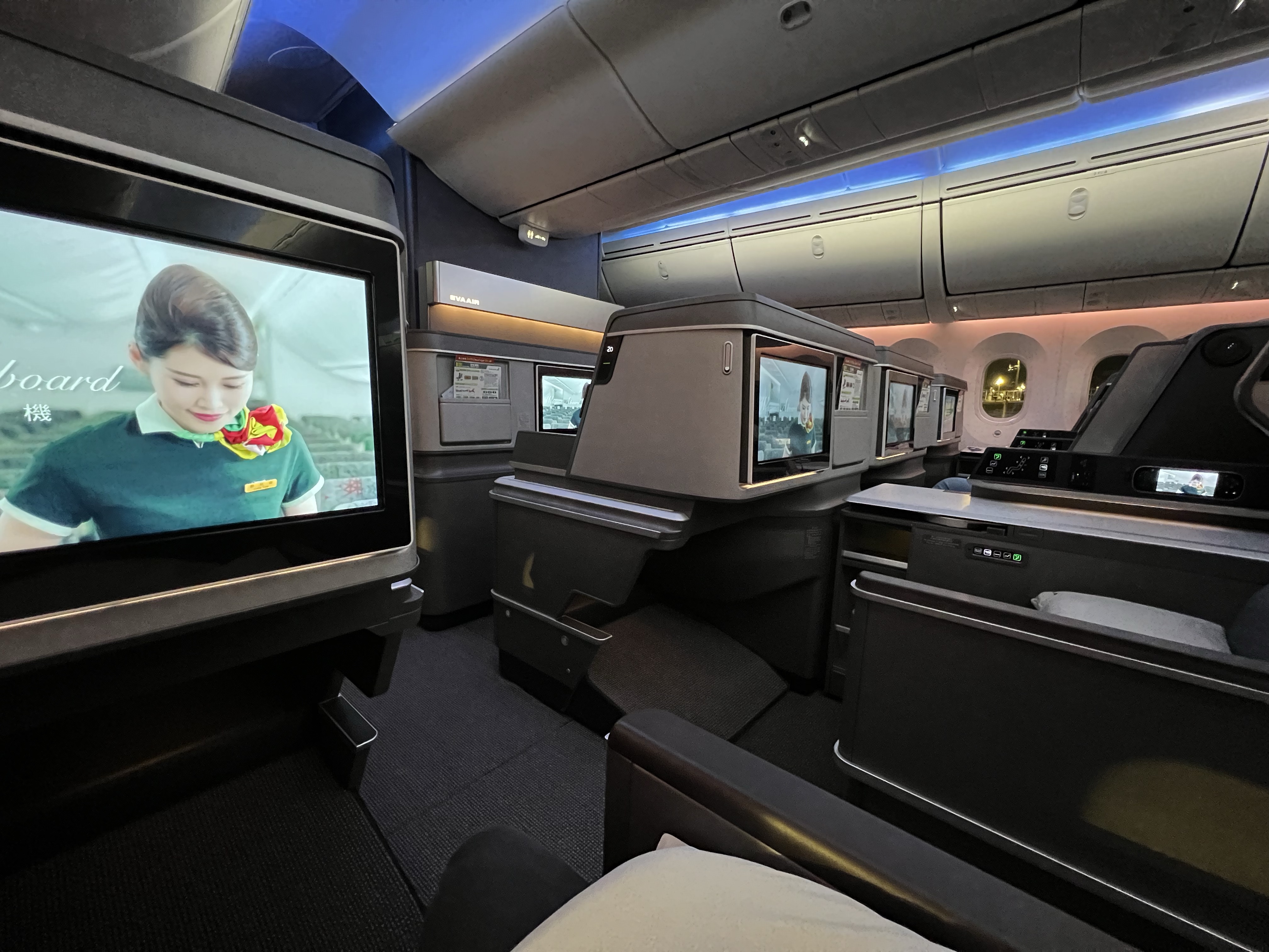 好久沒有搭長榮商務艙,之前都是反魚骨配置,這次搭的787-10機型是新的長方形排列,每個位子都是正對前面,看起來相對寬敞,旁邊的檯面也做得很精緻,還有個附鏡子的小置物箱。但後來發現把椅子漸漸放平時還是滿卡腳的,不過至少不用躺斜斜的還是舒服不少。
