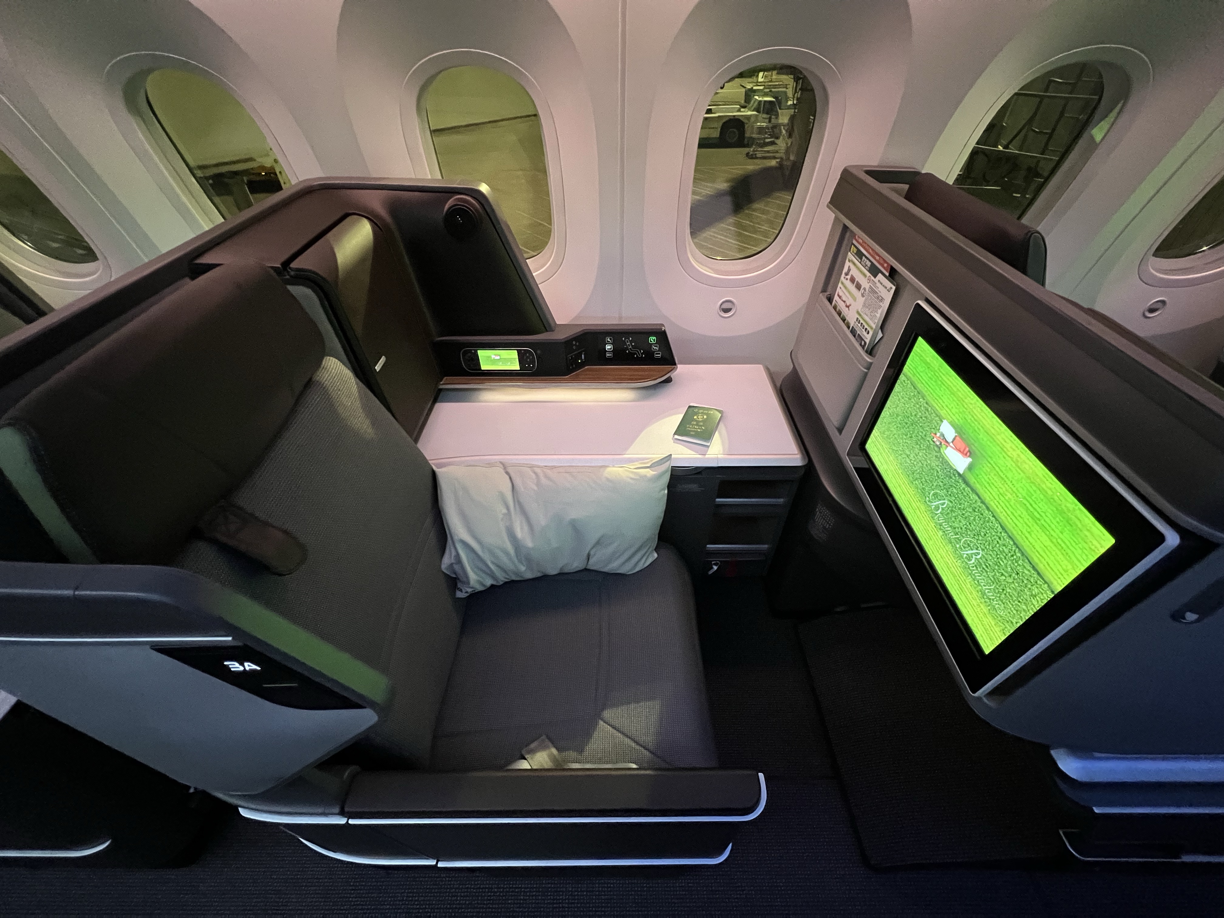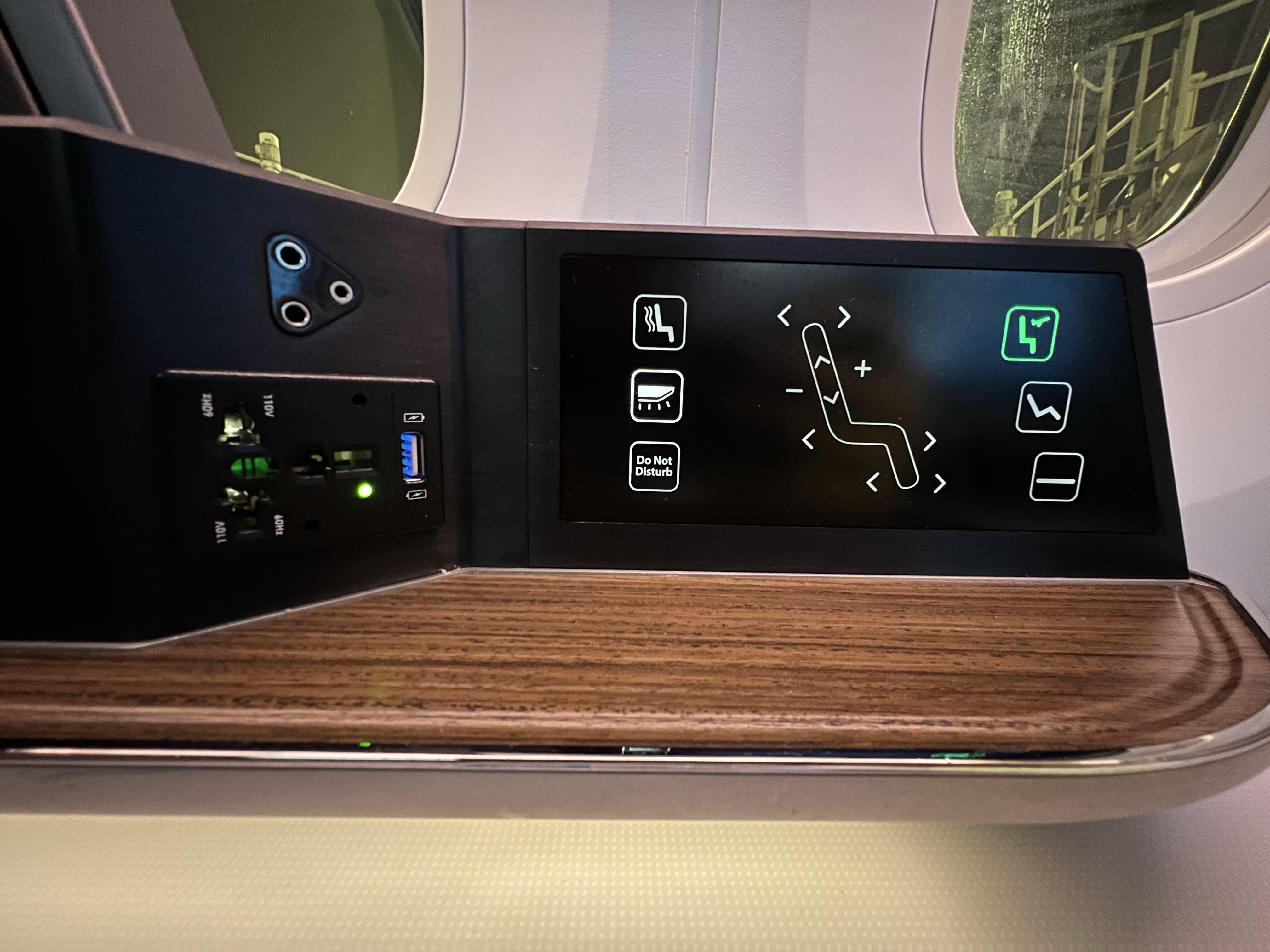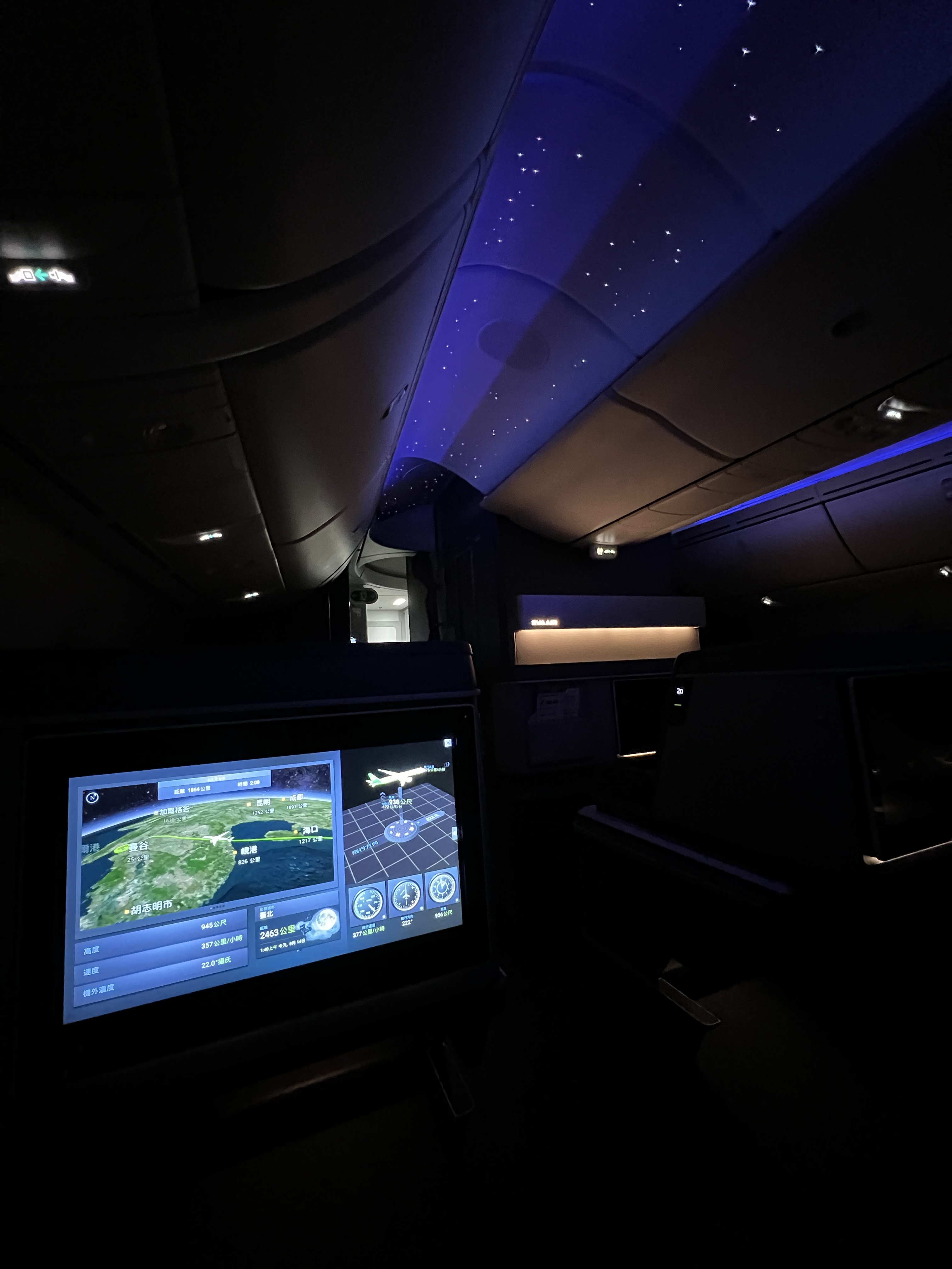 好久沒有搭長榮商務艙,之前都是反魚骨配置,這次搭的787-10機型是新的長方形排列,每個位子都是正對前面,看起來相對寬敞,旁邊的檯面也做得很精緻,還有個附鏡子的小置物箱。但後來發現把椅子漸漸放平時還是滿卡腳的,不過至少不用躺斜斜的還是舒服不少。