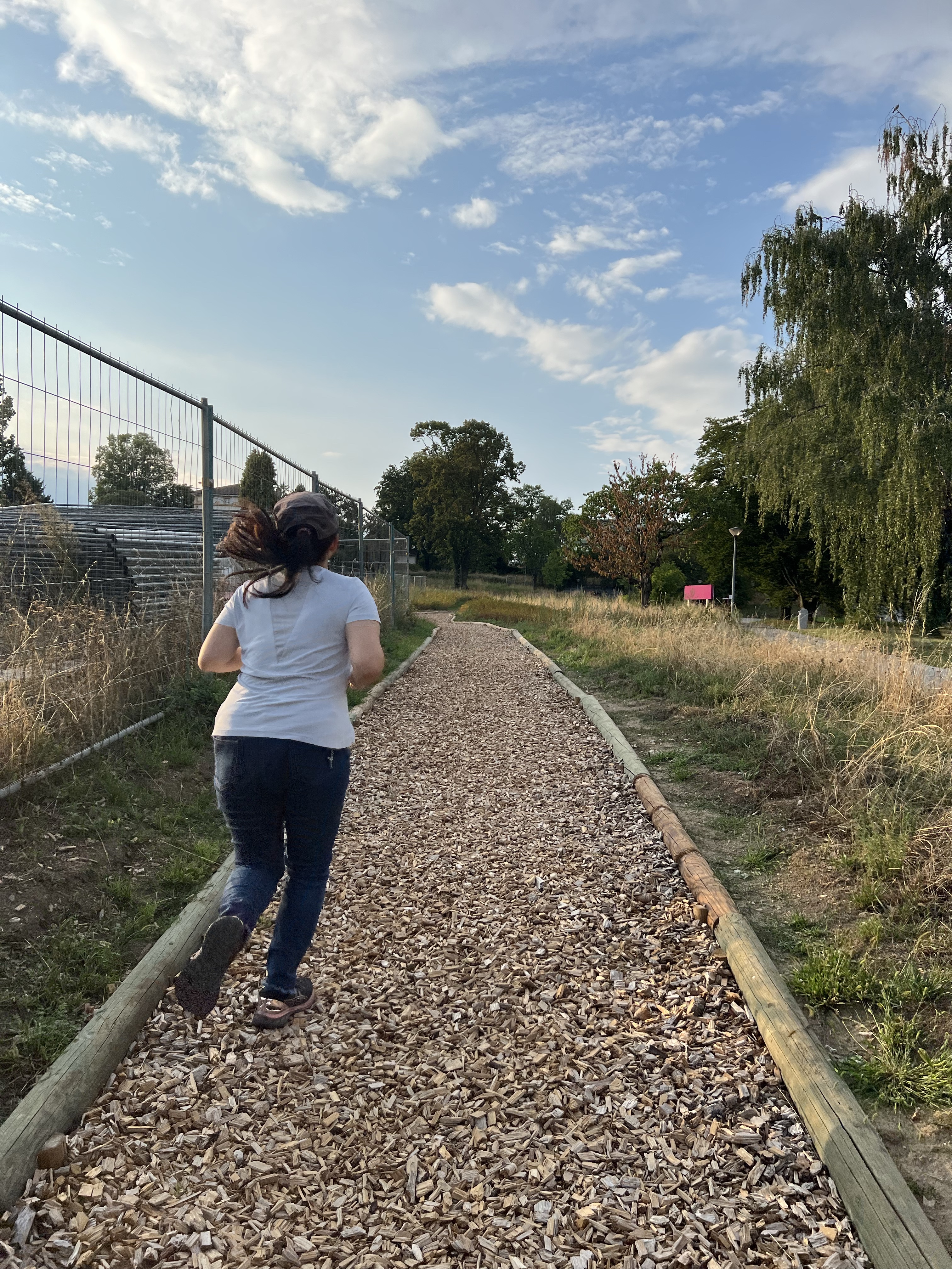 湖旁邊的小丘上有條用木屑鋪成的步道,跑起來很有緩衝感,感覺對膝蓋友善。步道旁邊的草地上有一群綿羊在吃草,每隻的背上都站了烏鴉,不太知道為什麼,但我們一靠近就全飛光了。