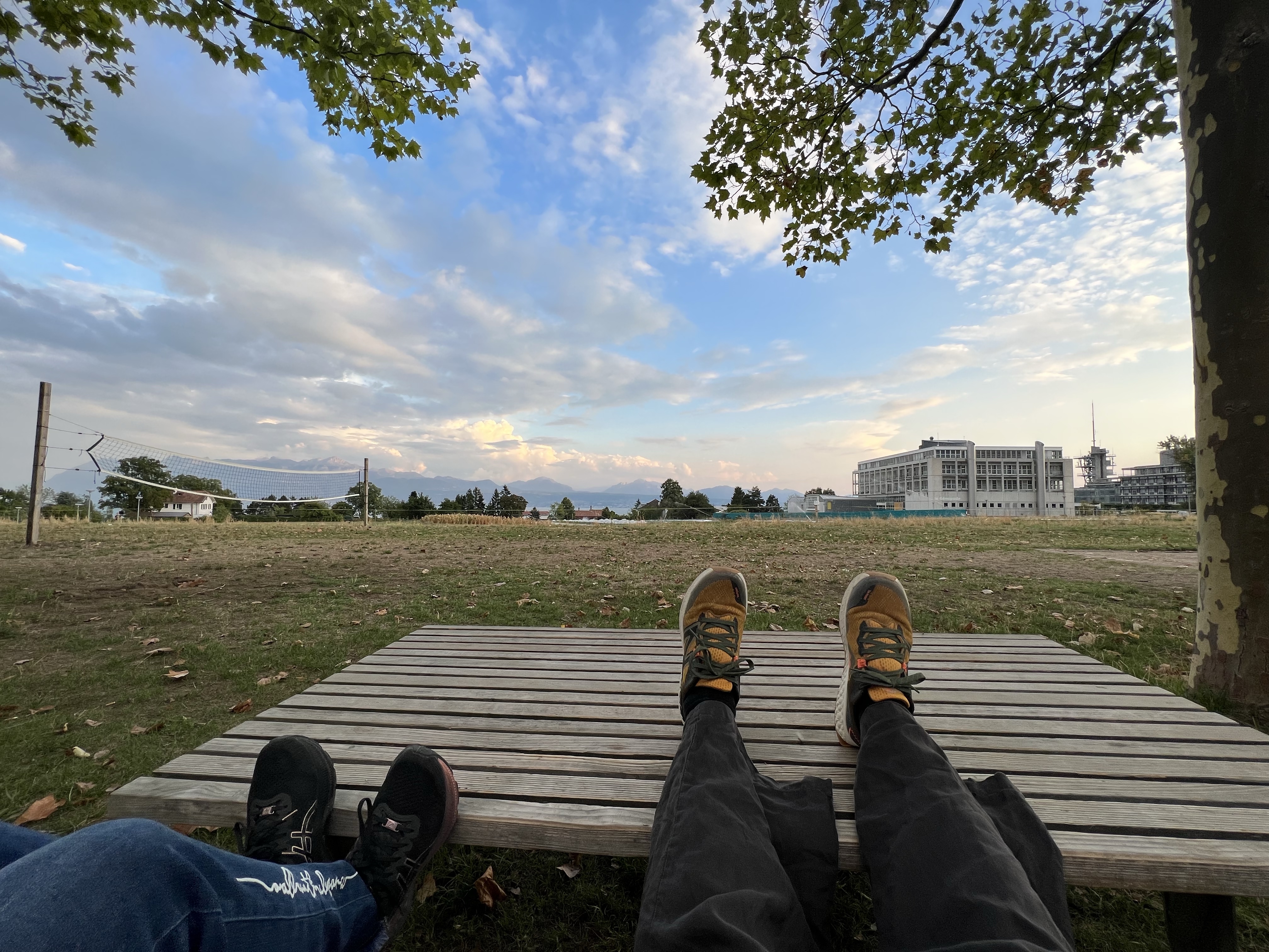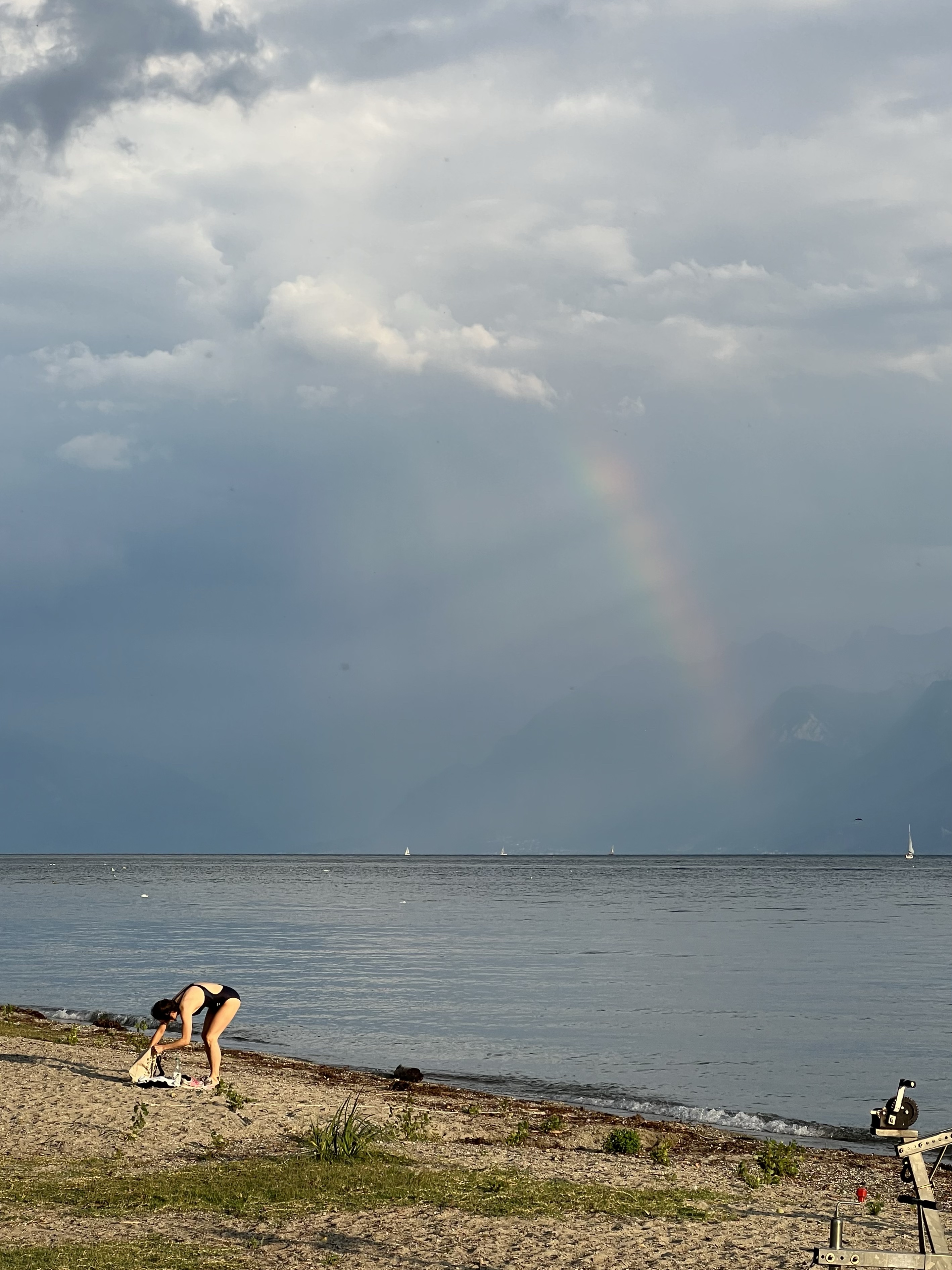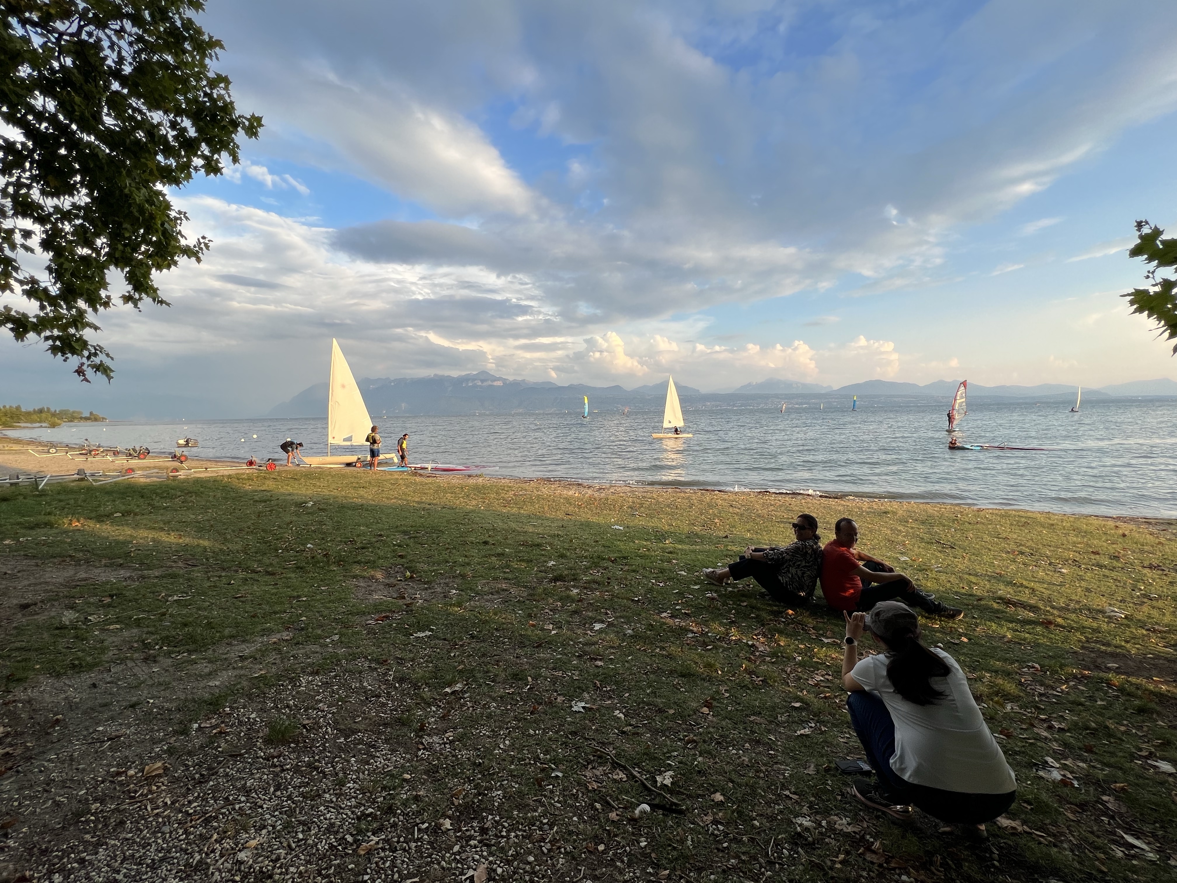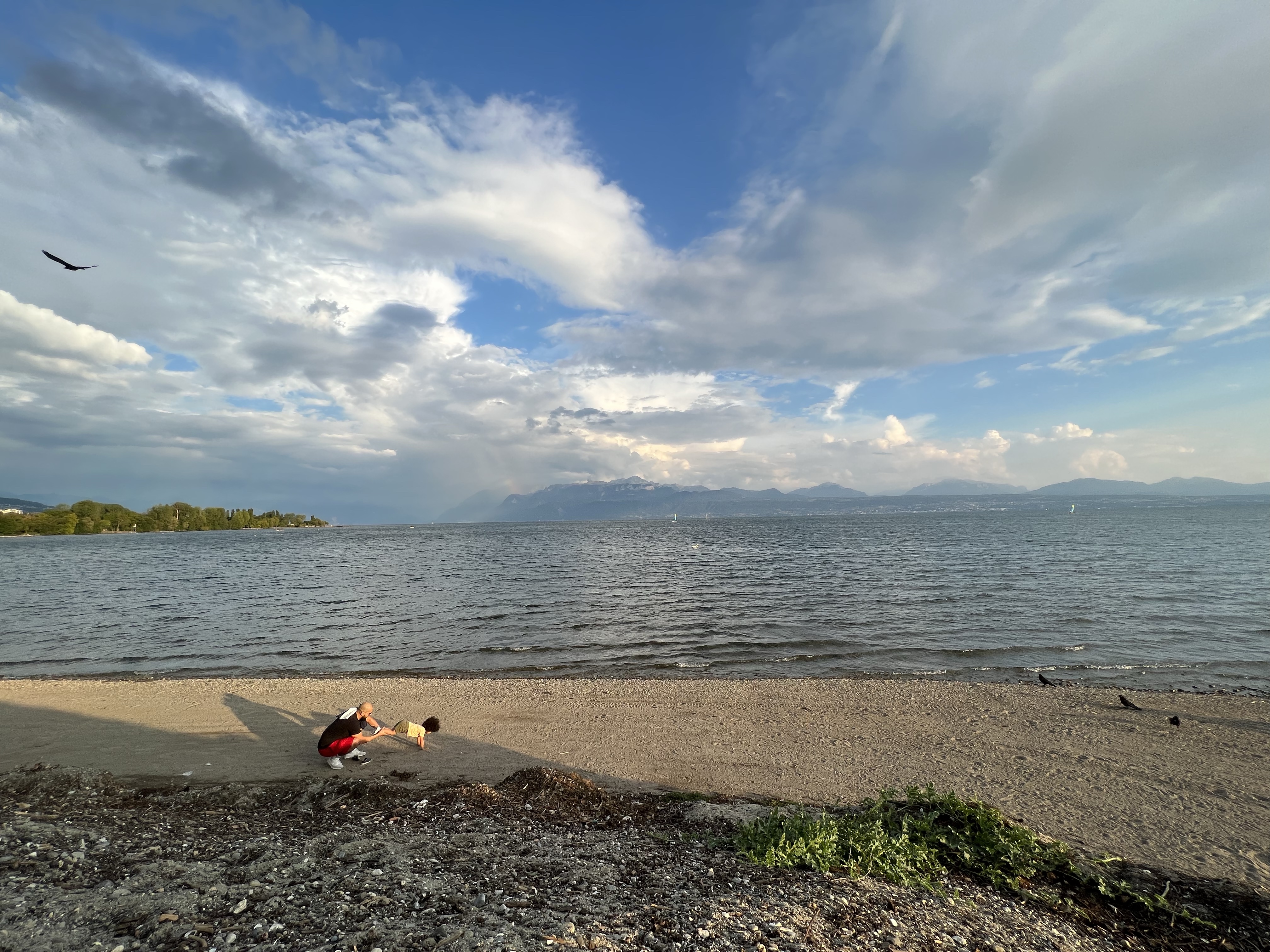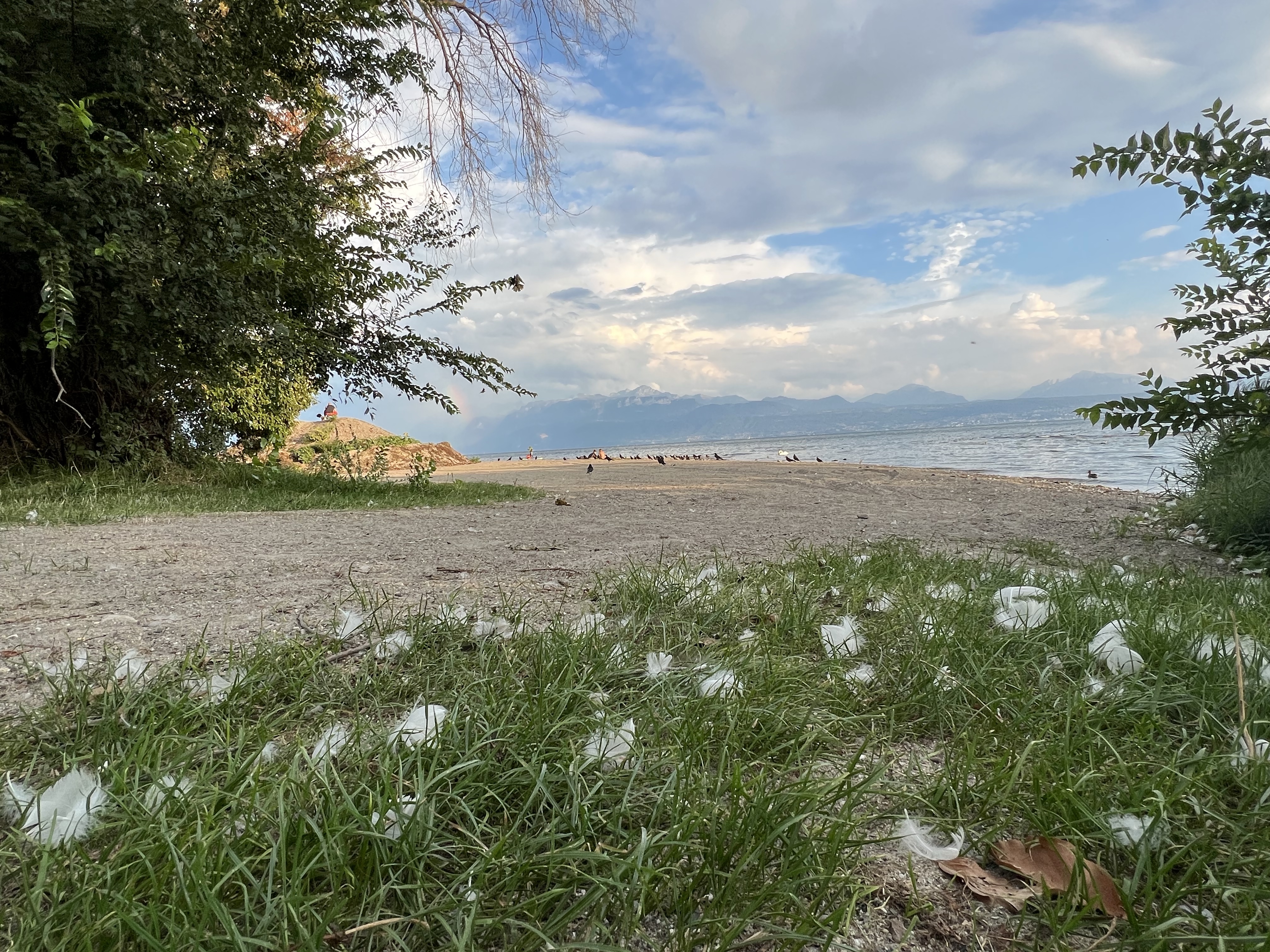 湖邊鳥超多,看到一對情侶在野餐,旁邊圍了一大群的烏鴉慢慢逼近;湖面上也有很多綠頭鴨跟天鵝,看到人會試探性靠近看看有沒有吃的,沒有再悠悠漂走。湖對面的法國側看起來在下大雨,我們這邊看過去剛好出現彩虹。旁邊的足球場正在玩踢屁股的處罰遊戲。