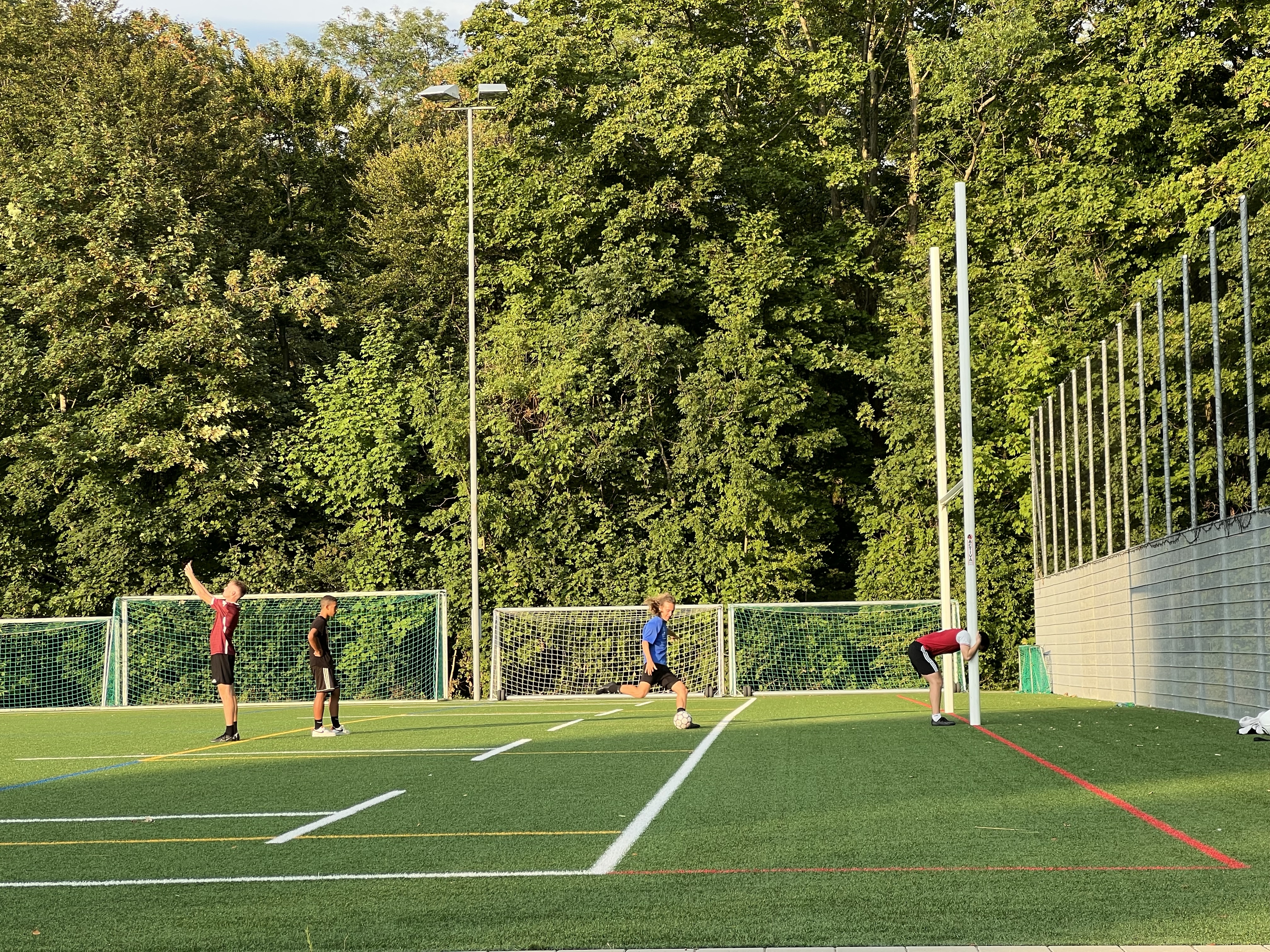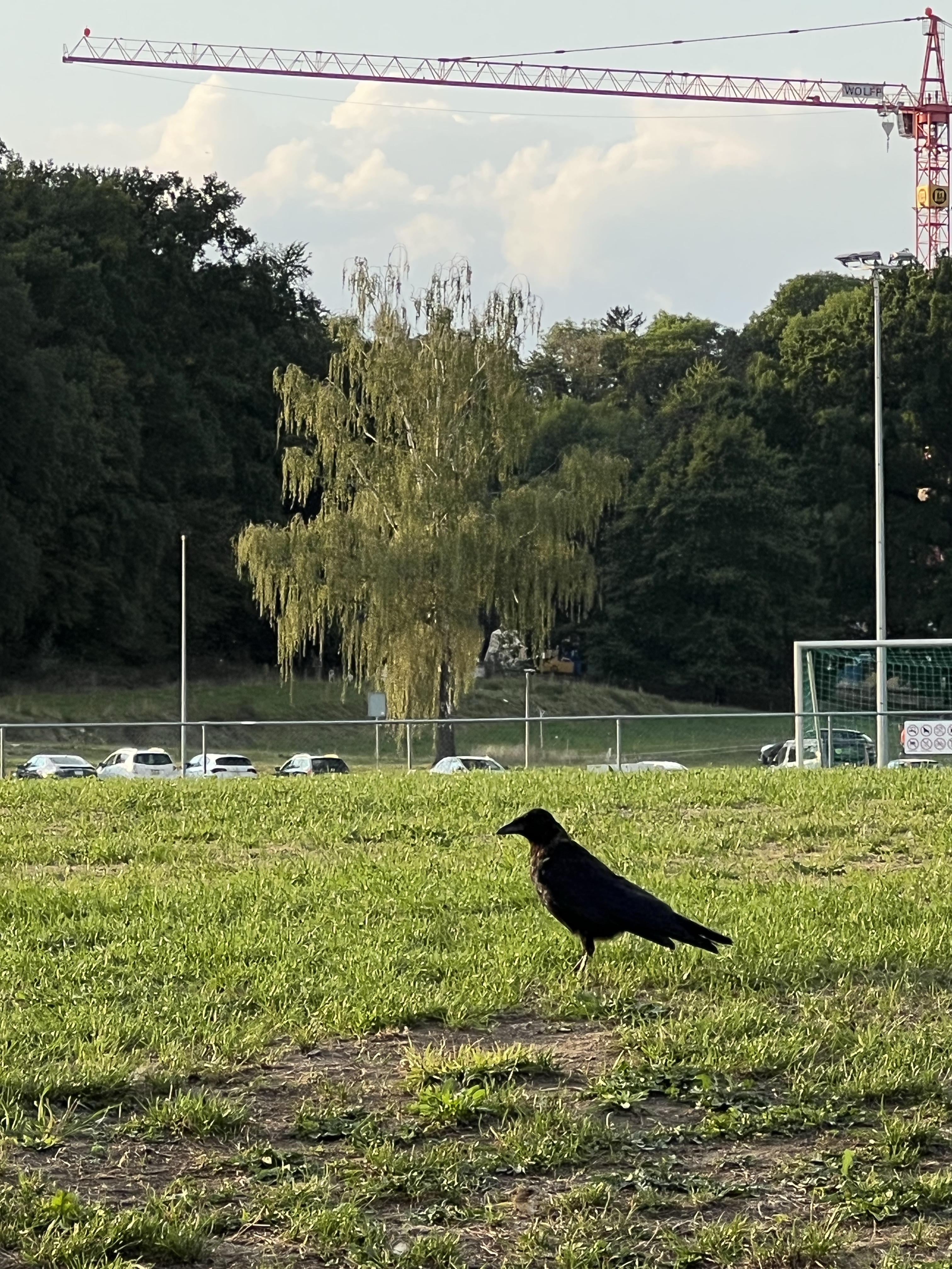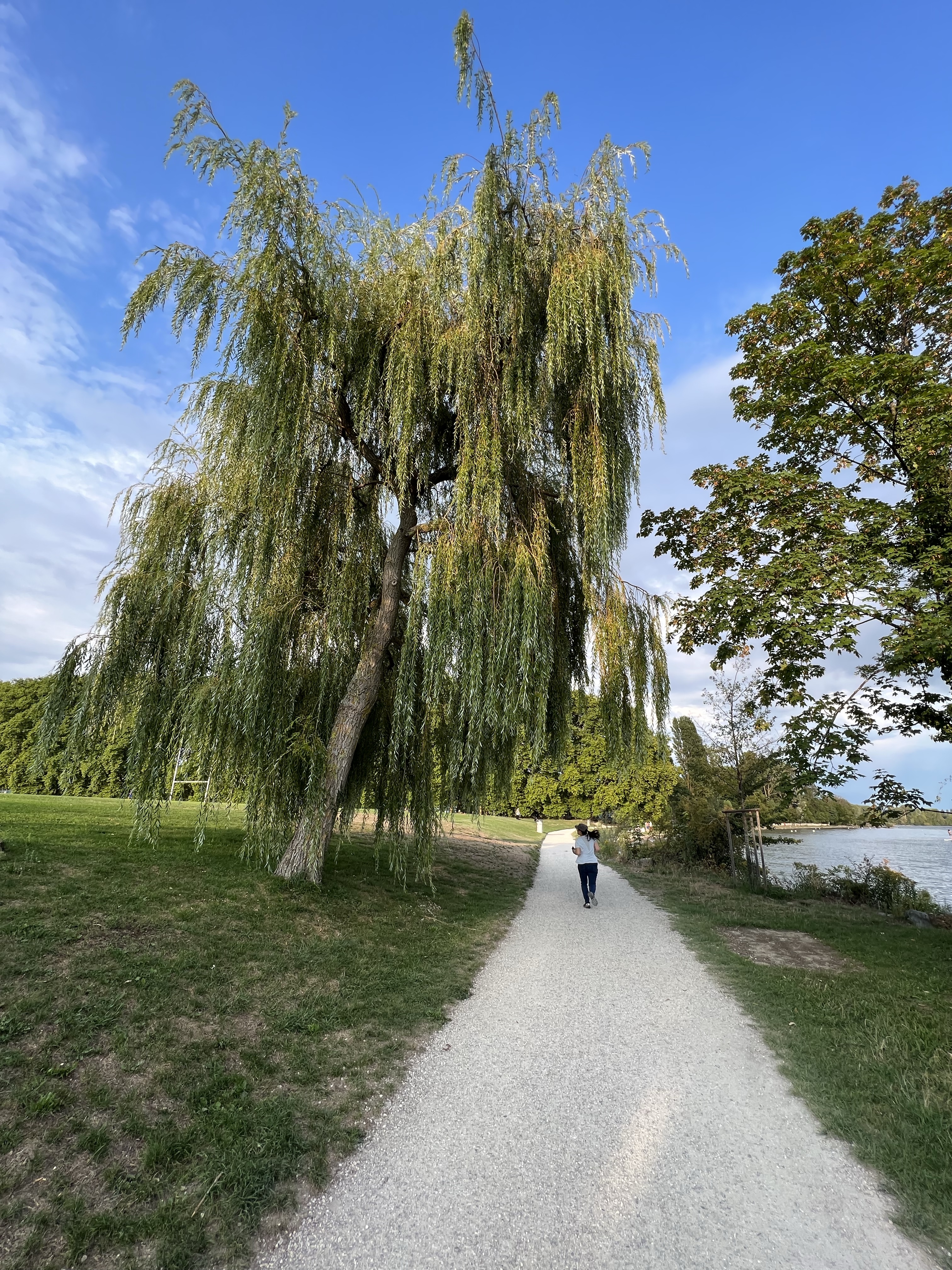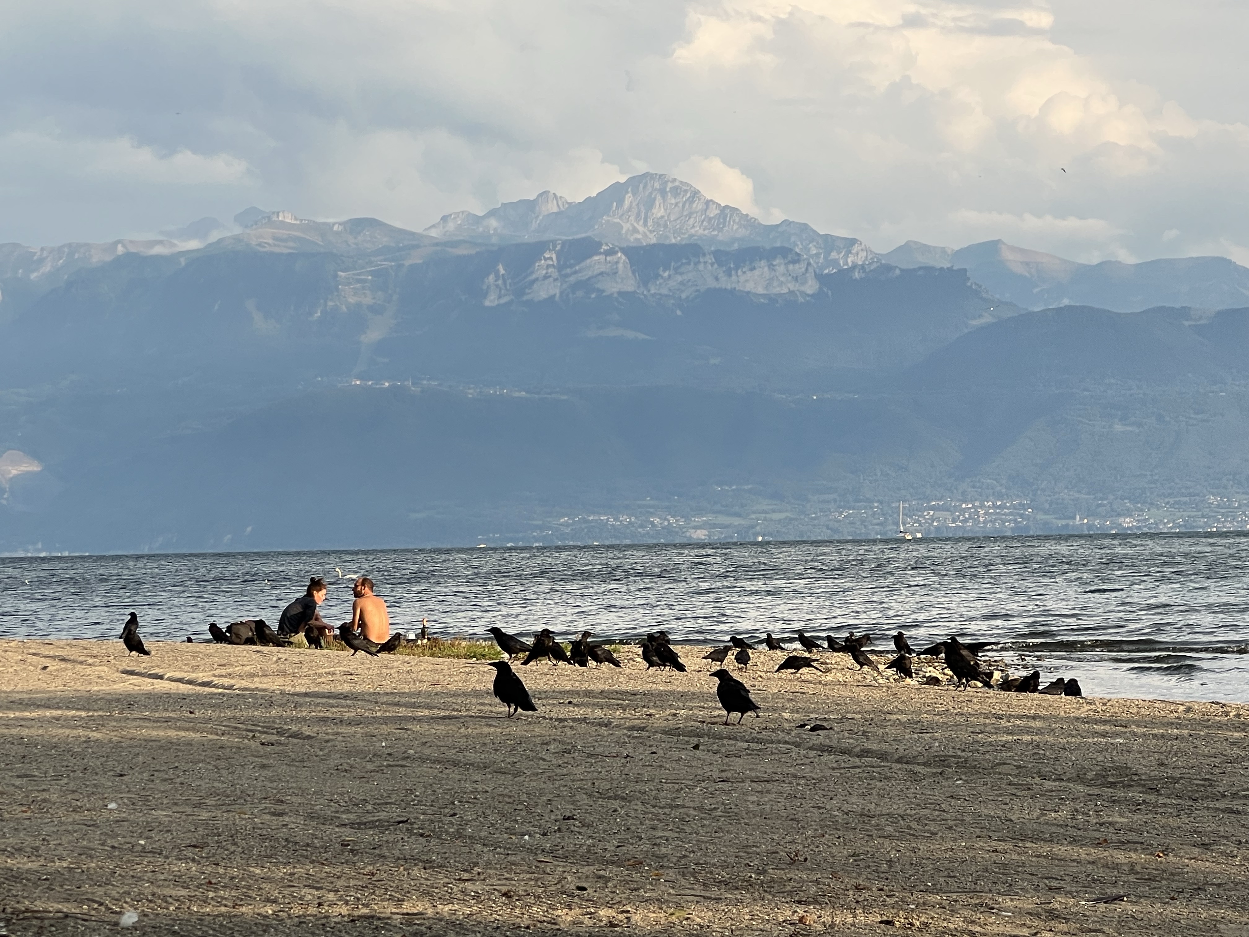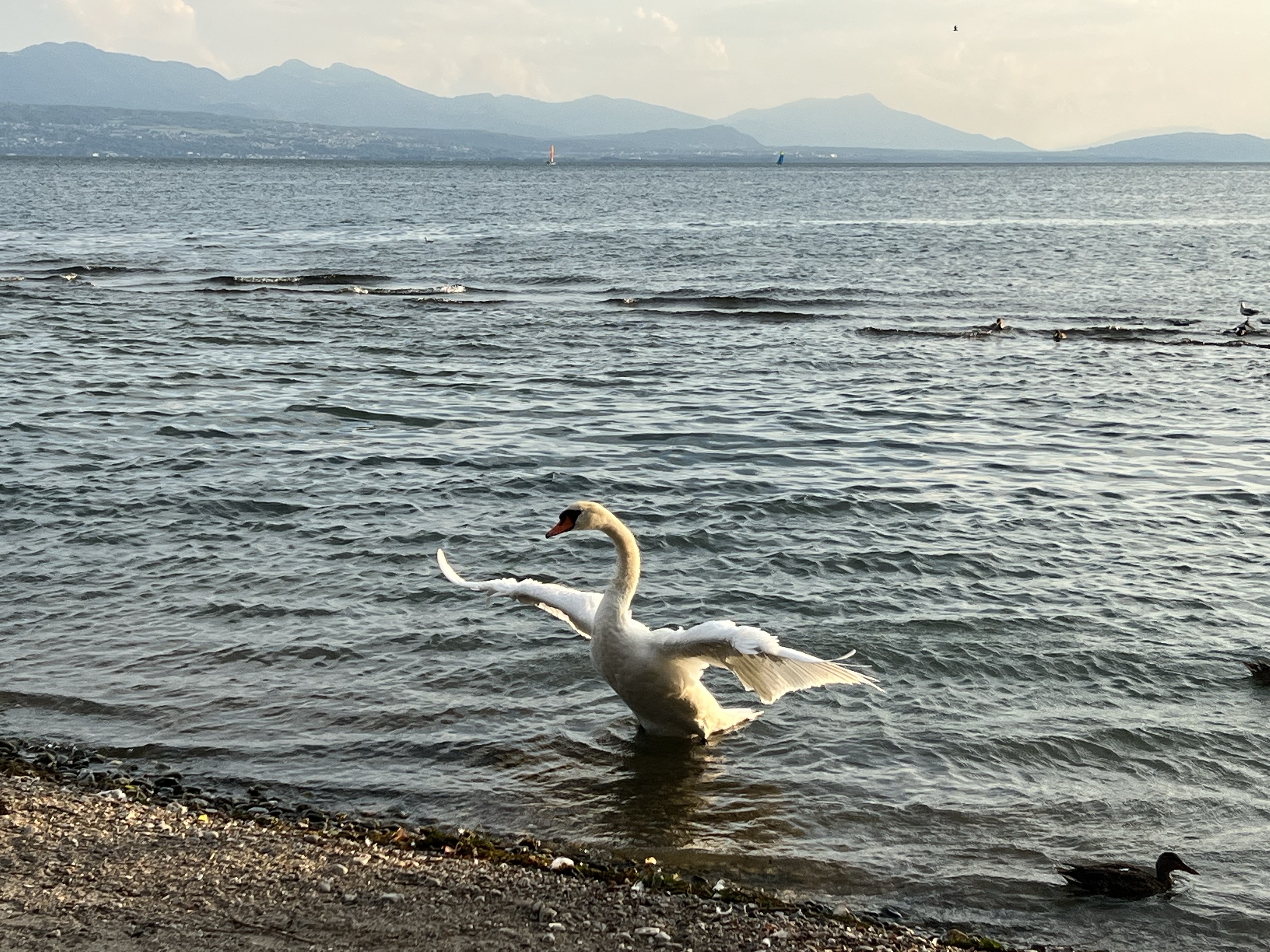 湖邊鳥超多,看到一對情侶在野餐,旁邊圍了一大群的烏鴉慢慢逼近;湖面上也有很多綠頭鴨跟天鵝,看到人會試探性靠近看看有沒有吃的,沒有再悠悠漂走。湖對面的法國側看起來在下大雨,我們這邊看過去剛好出現彩虹。旁邊的足球場正在玩踢屁股的處罰遊戲。