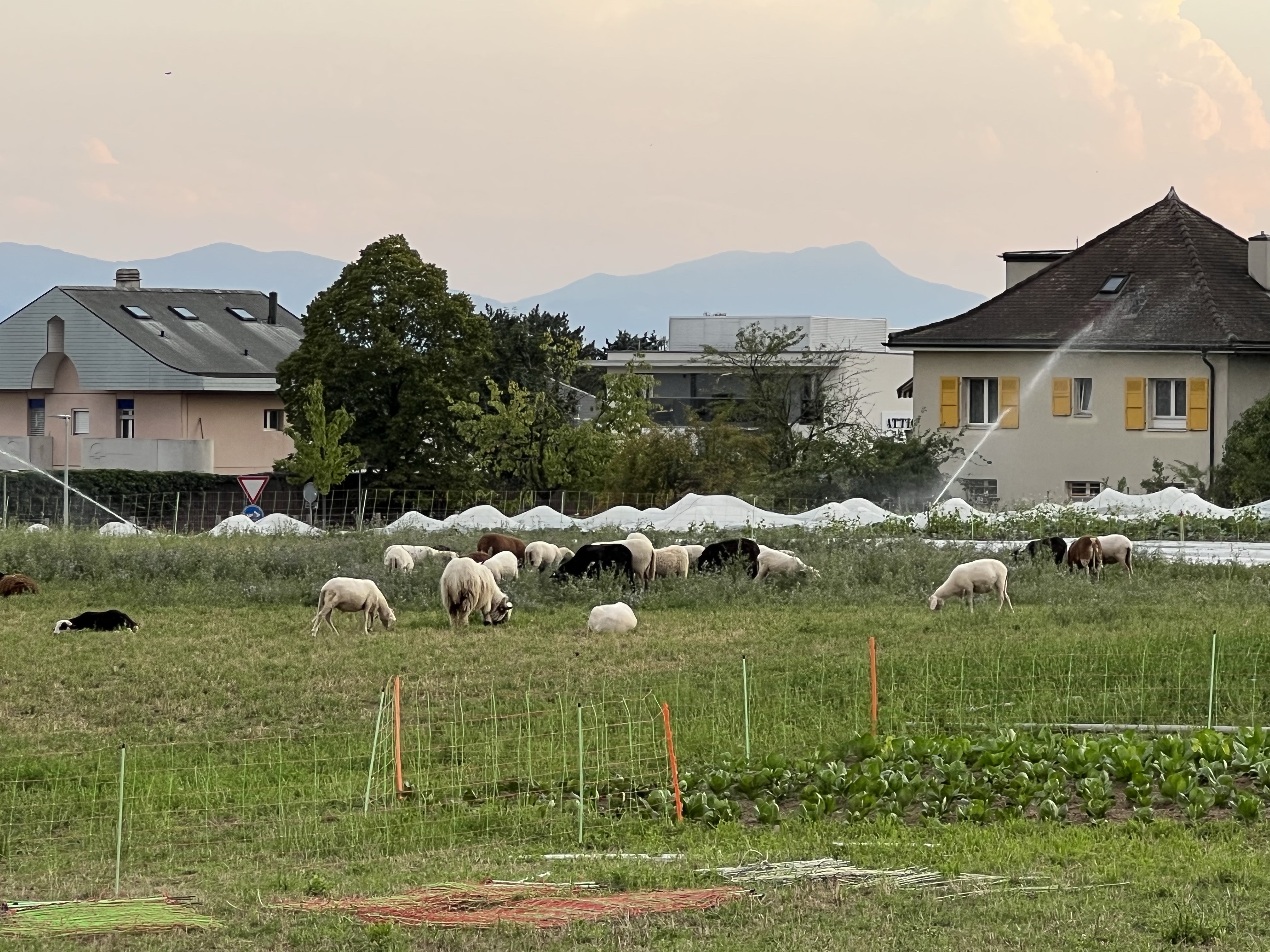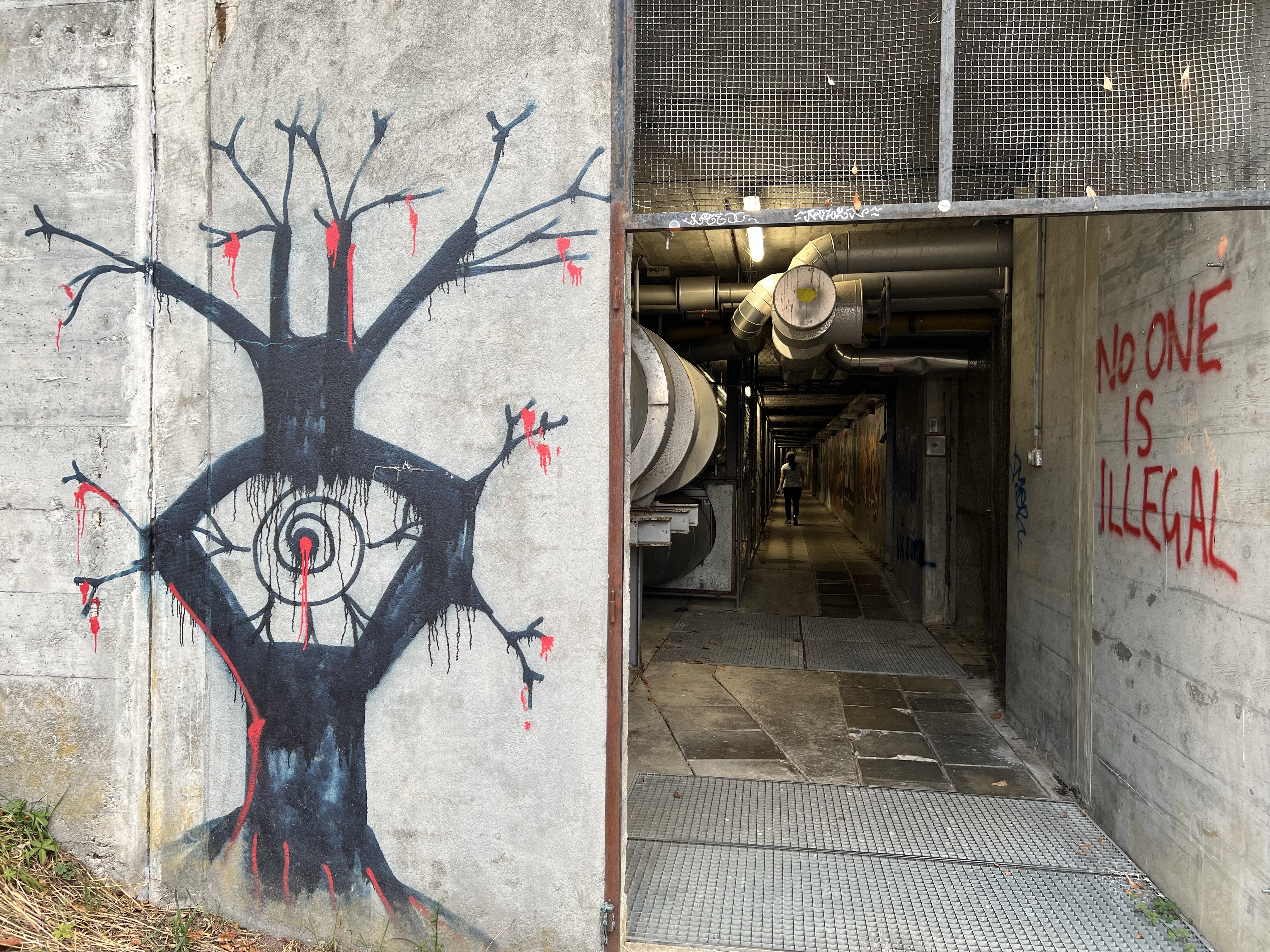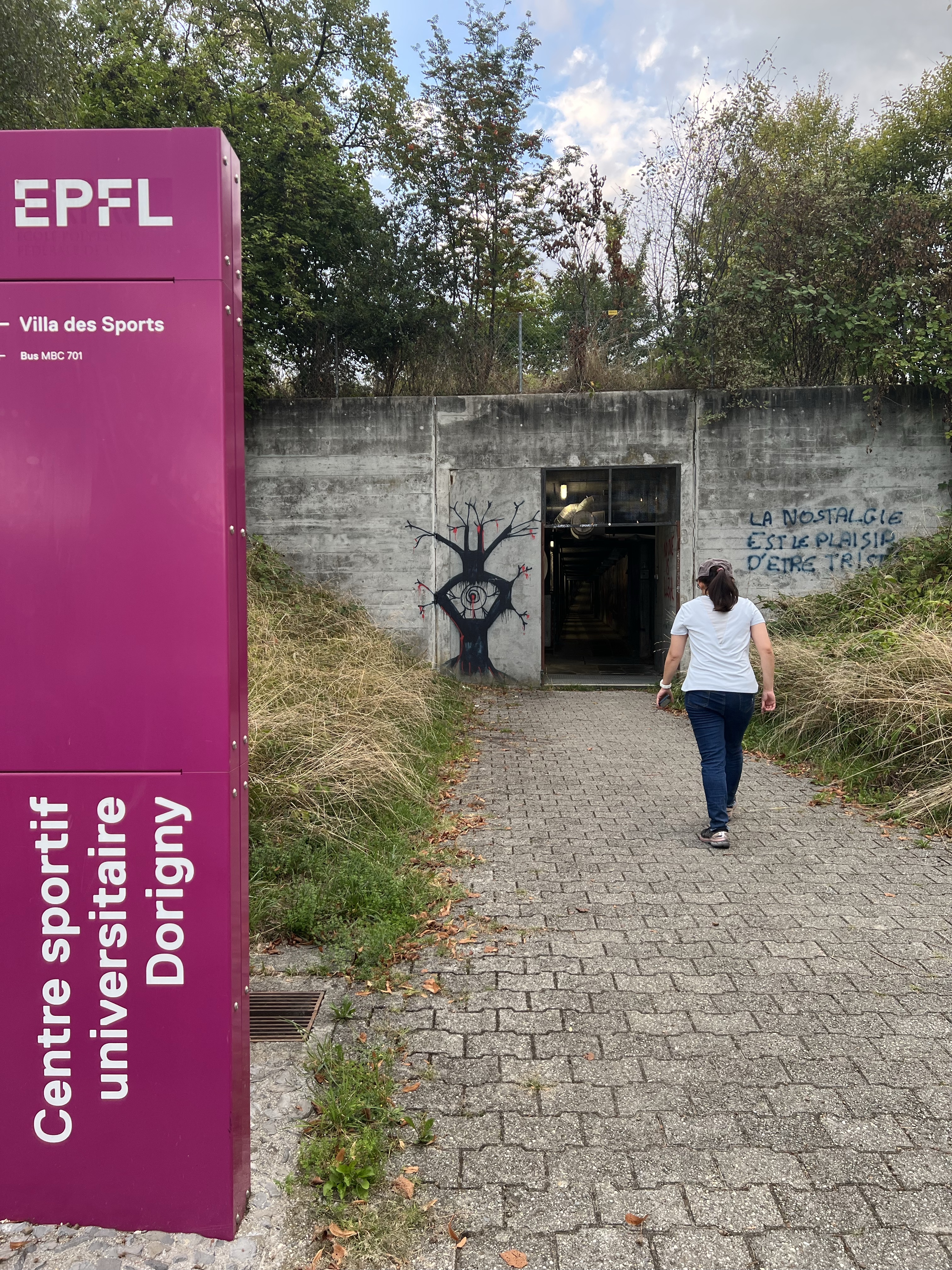 湖邊有條地道可以通回校園,洞口旁被畫了看起來很邪惡的眼睛。洞內非常涼爽,頭頂上有一條條的管道,茹茹說應該是引湖水進學校的冷卻系統,聽起來非常高級。出口在Unil的草坪邊,坐在草坪邊的長椅愜意的看看湖景,附近又有羊在吃草,聽說都是一車被載過來吃完再一車載走,不定期出現。