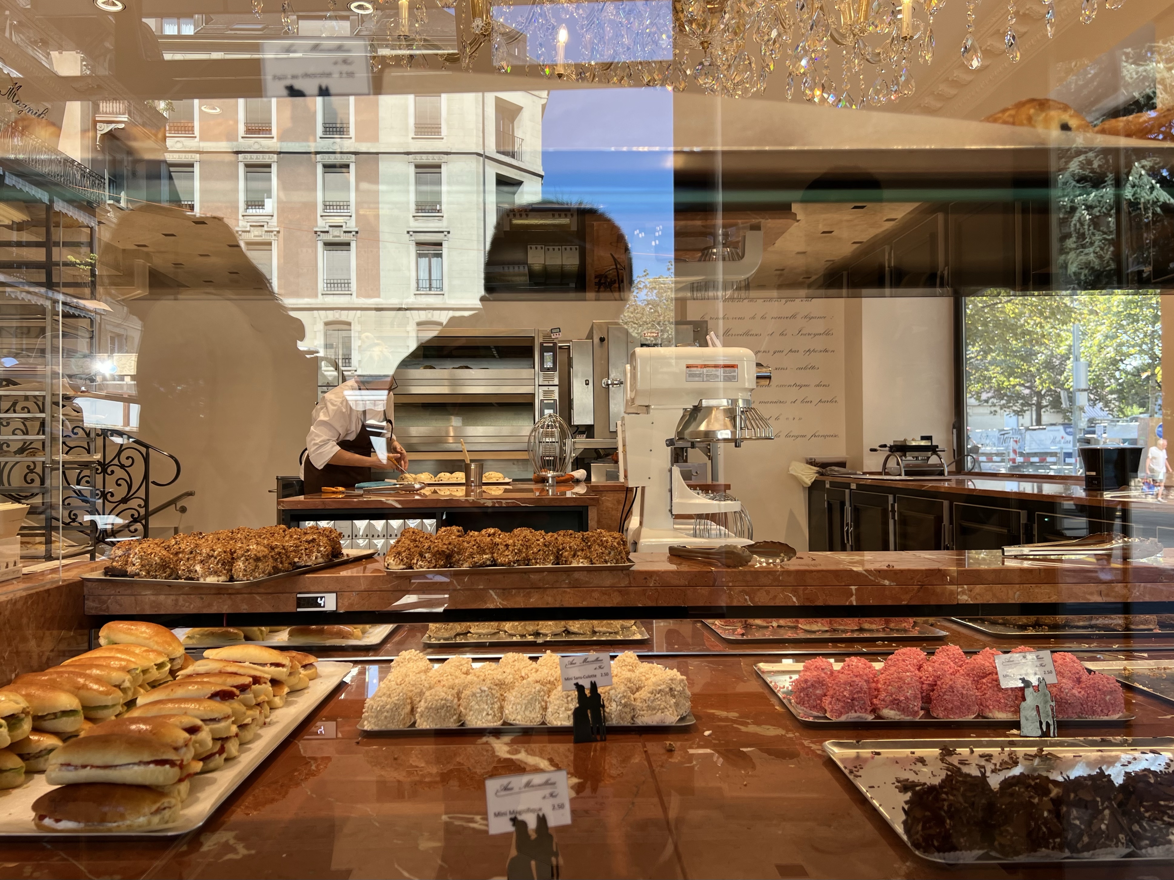 租借裝備的店在洛桑車站附近,走去的路上遇到一家新開的甜點店,專賣蛋白糖為內餡的小蛋糕,買了一個小的嚐鮮,外層是甜甜的白巧克力脆片,裡面是打發的鬆軟蛋白糖,一顆五塊錢但好吃!感覺他們烤過的蛋白糖應該也會很好吃!