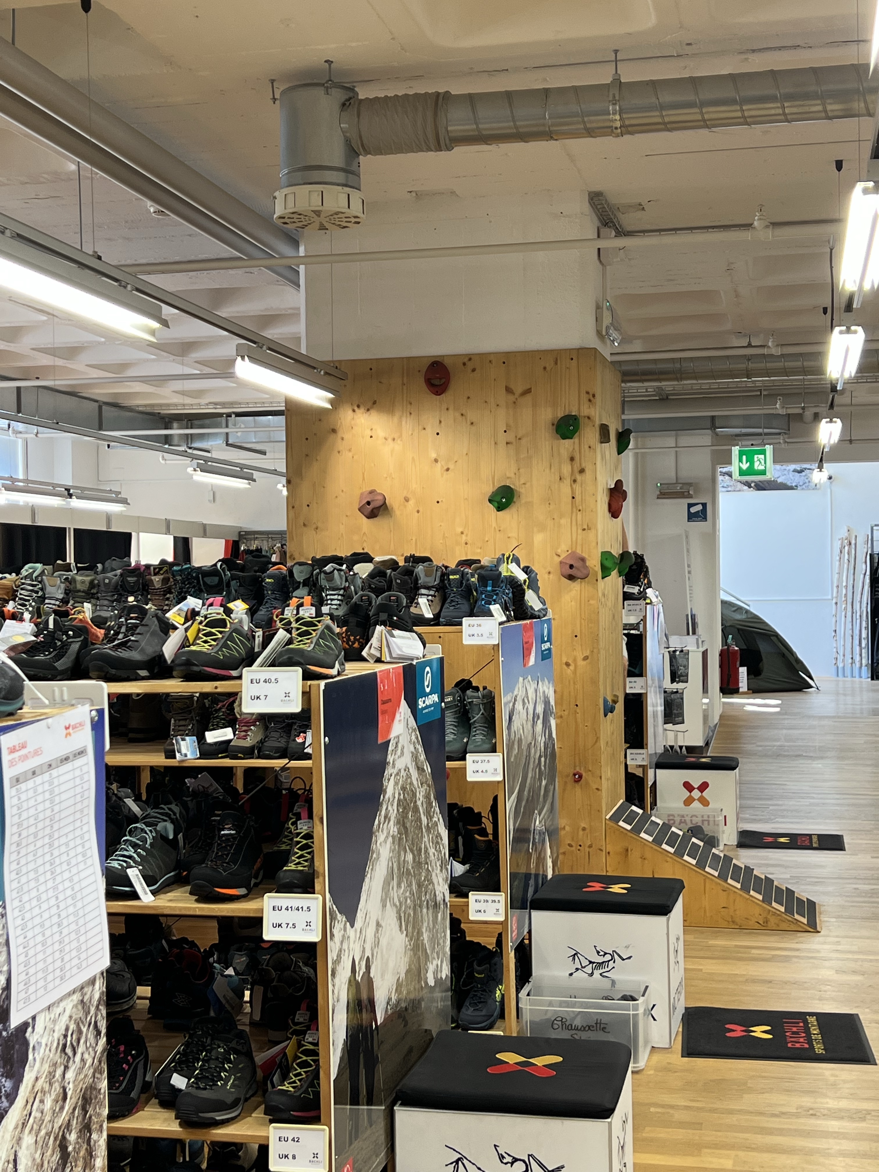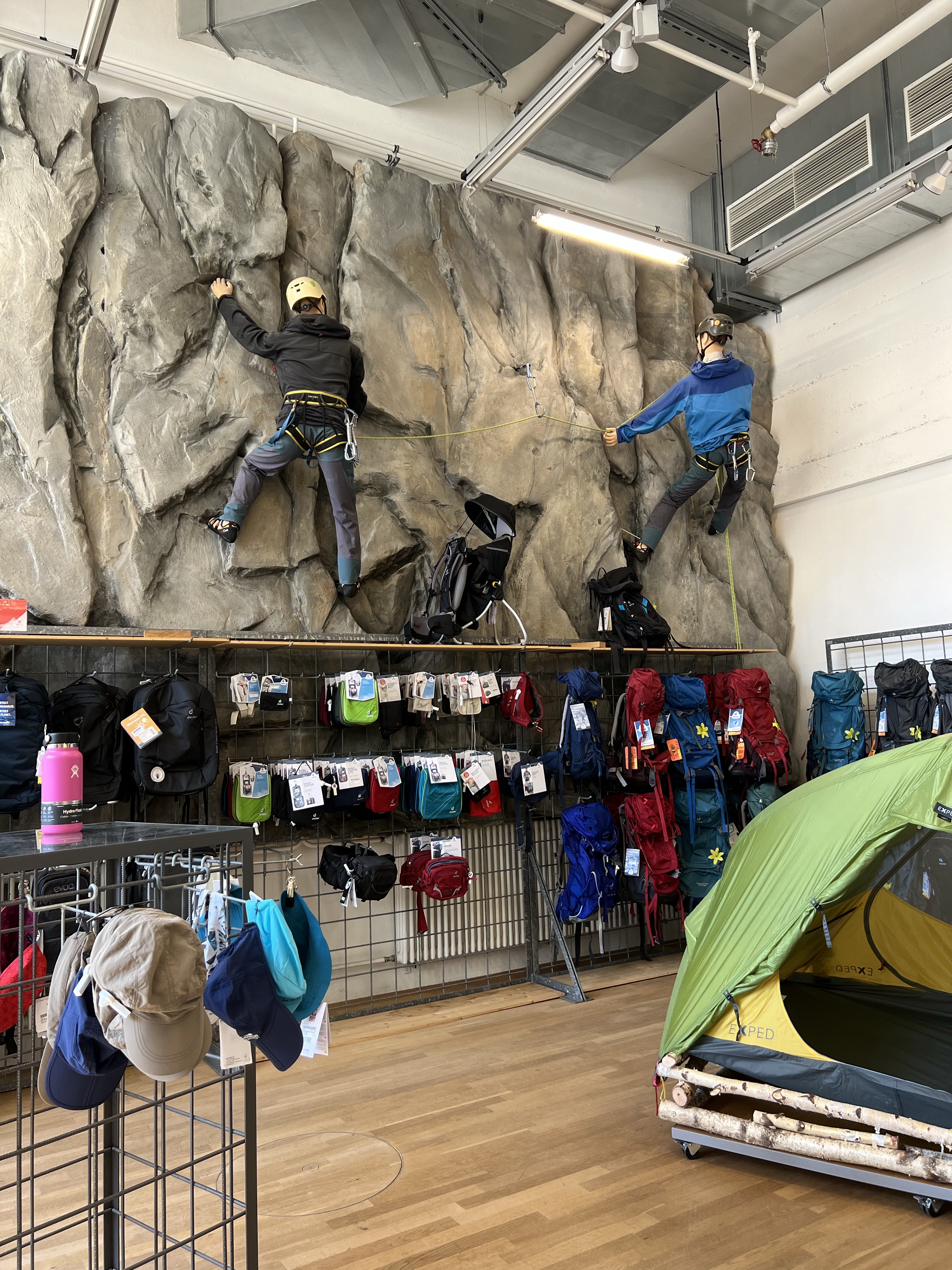 租裝備其實不花什麼時間,因為都是打包好一個一個的小背包,算人頭租借而已,但我們在地下室的特價區尋寶,很多登山的名牌衣褲都打五到七折不等,畢竟瑞士是戶外運動大國,不像台灣是小眾市場,東西很難打折。帶隊的人看我們興致高昂,帶我們去下一家也有outlet區的戶外用品店看看,店內居然還有小小攀岩場,帶小朋友來逛街還能爬上爬下放個電。