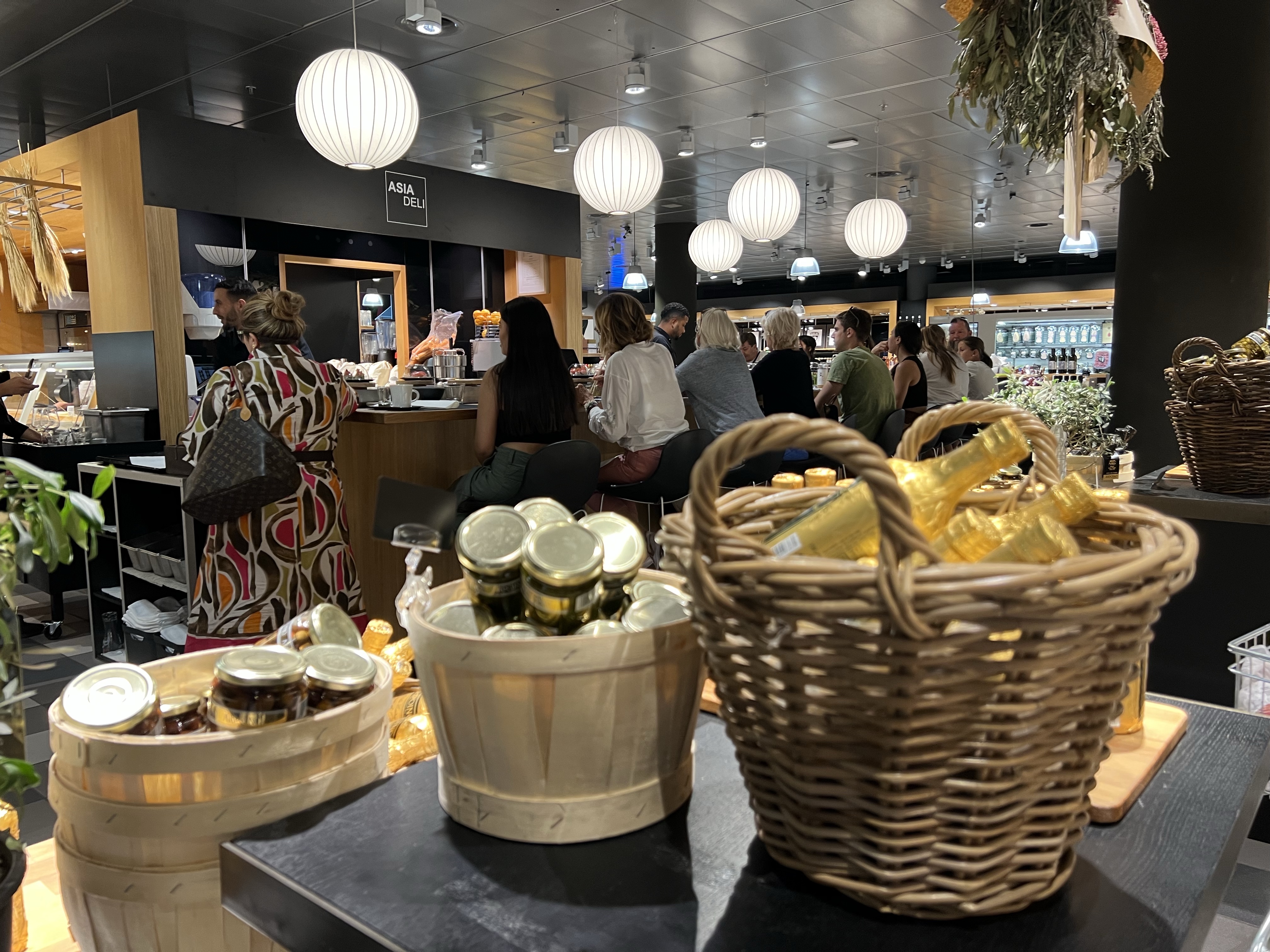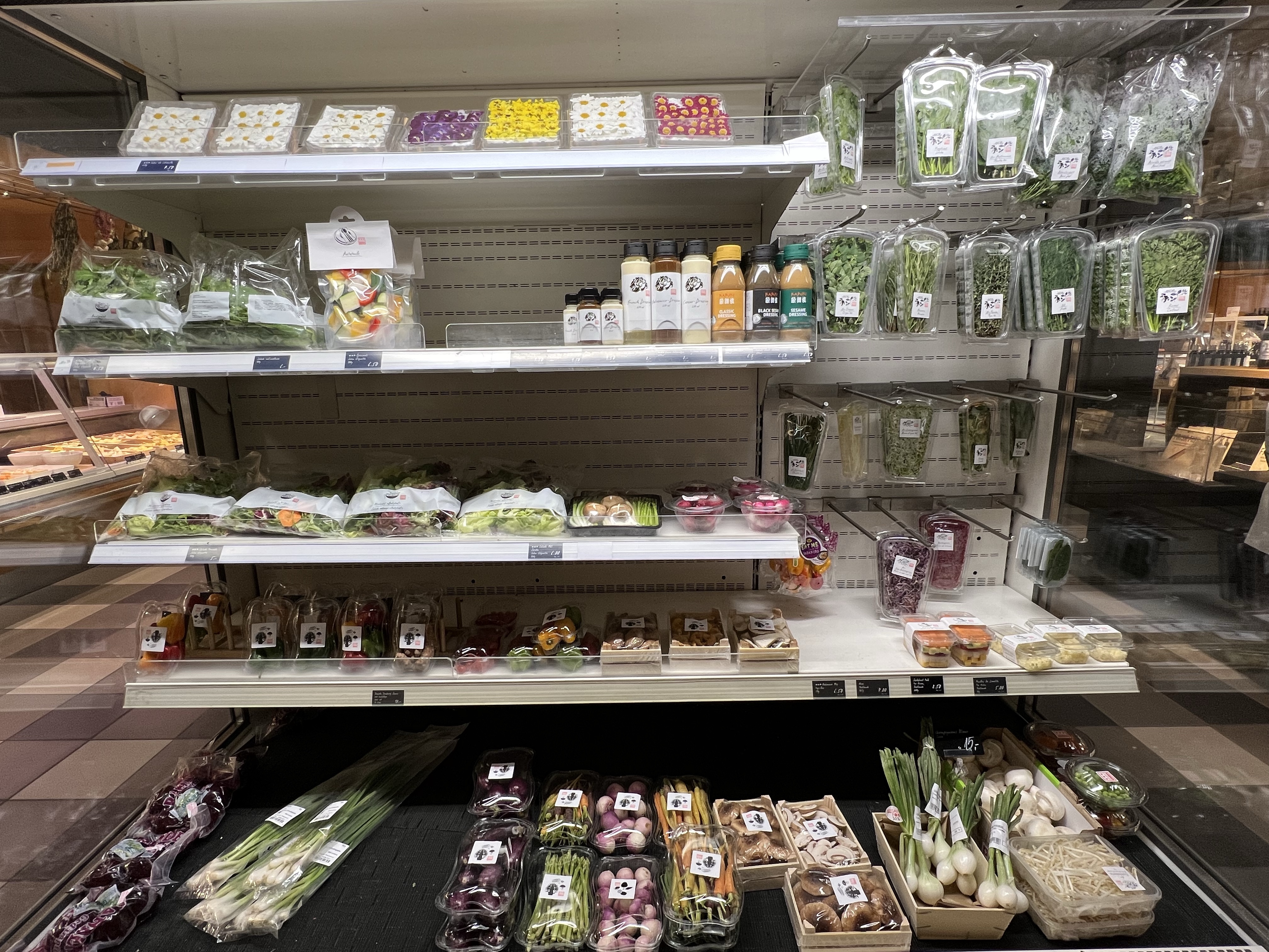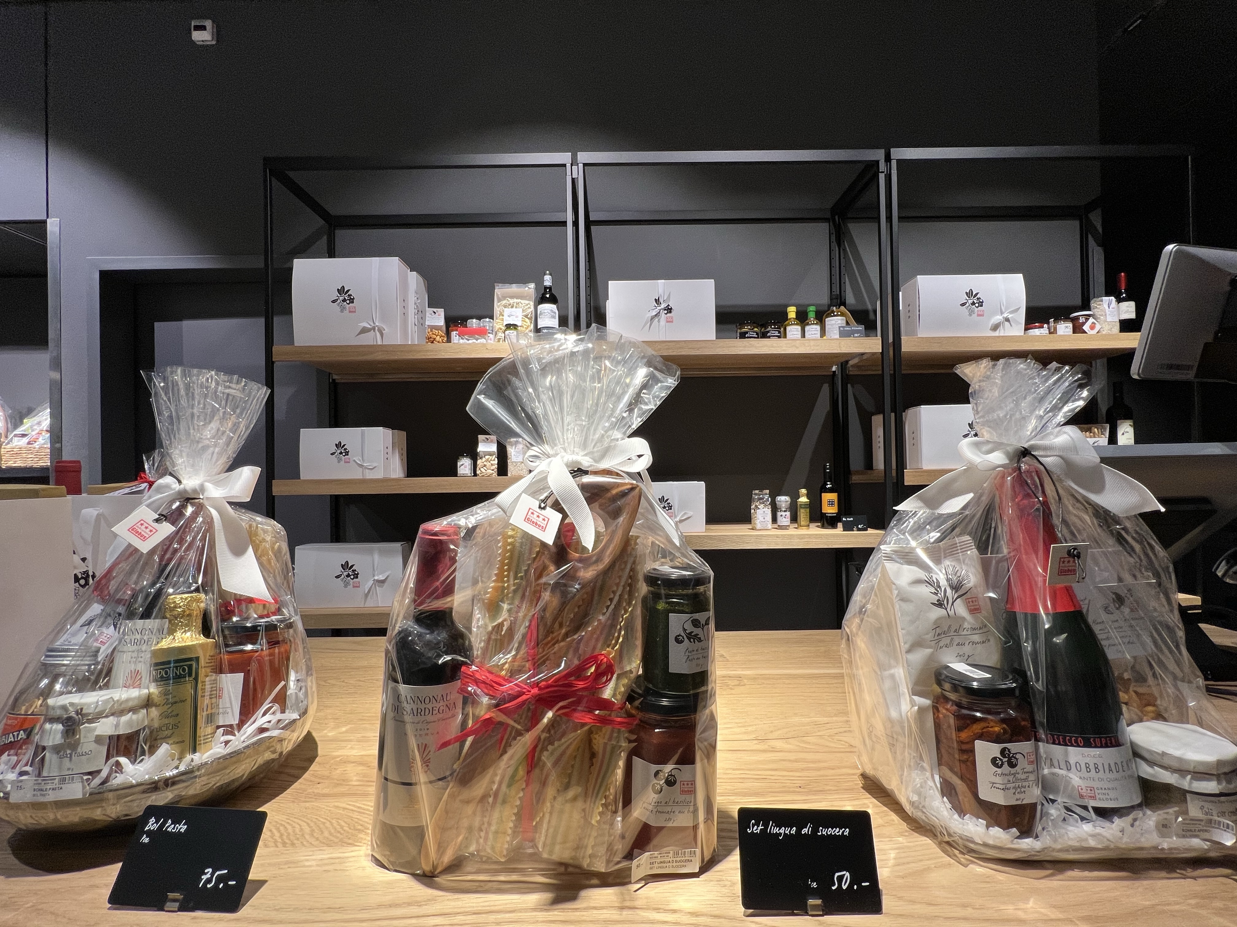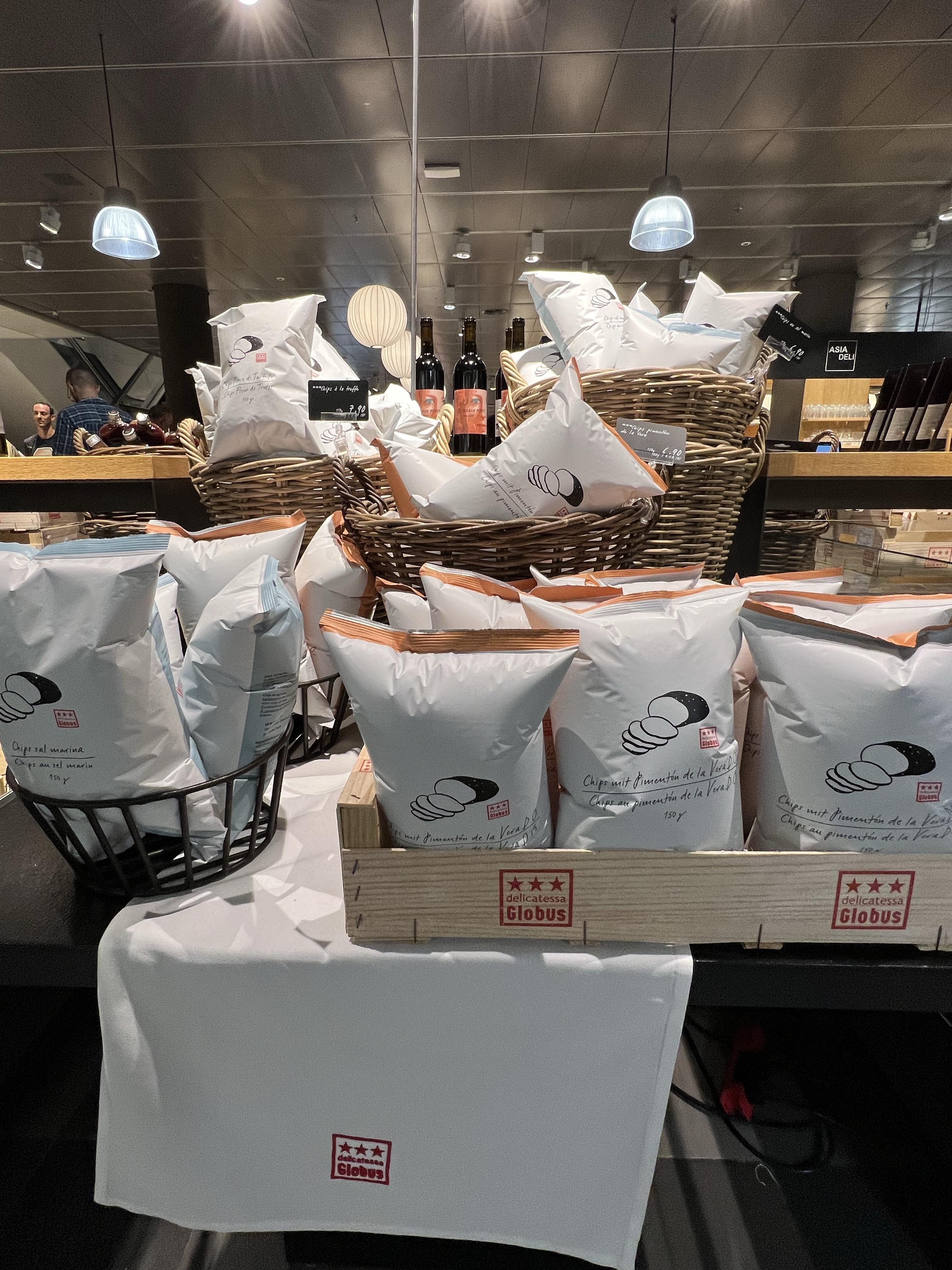走去附近的貴婦百貨Globus逛逛,路旁有禮拜三六才會出現的市集攤位,賣一些生鮮食材和可以馬上吃的派等等。百貨公司地下室是超市和一間迴轉壽司,茹茹說他之前吃過一次,是很貴的創意料理。超市賣各種高檔食材,還有各種裝得美美的食用花,零食區則有各種異國零食,我們買了巧克力鍋的材料回去當伴手禮。櫃檯旁邊還有一籃籃包起來的大禮包,裡面包括義大利麵、醬料、醃漬罐頭、紅酒等等,感覺很適合去別人家作客的時候帶去。