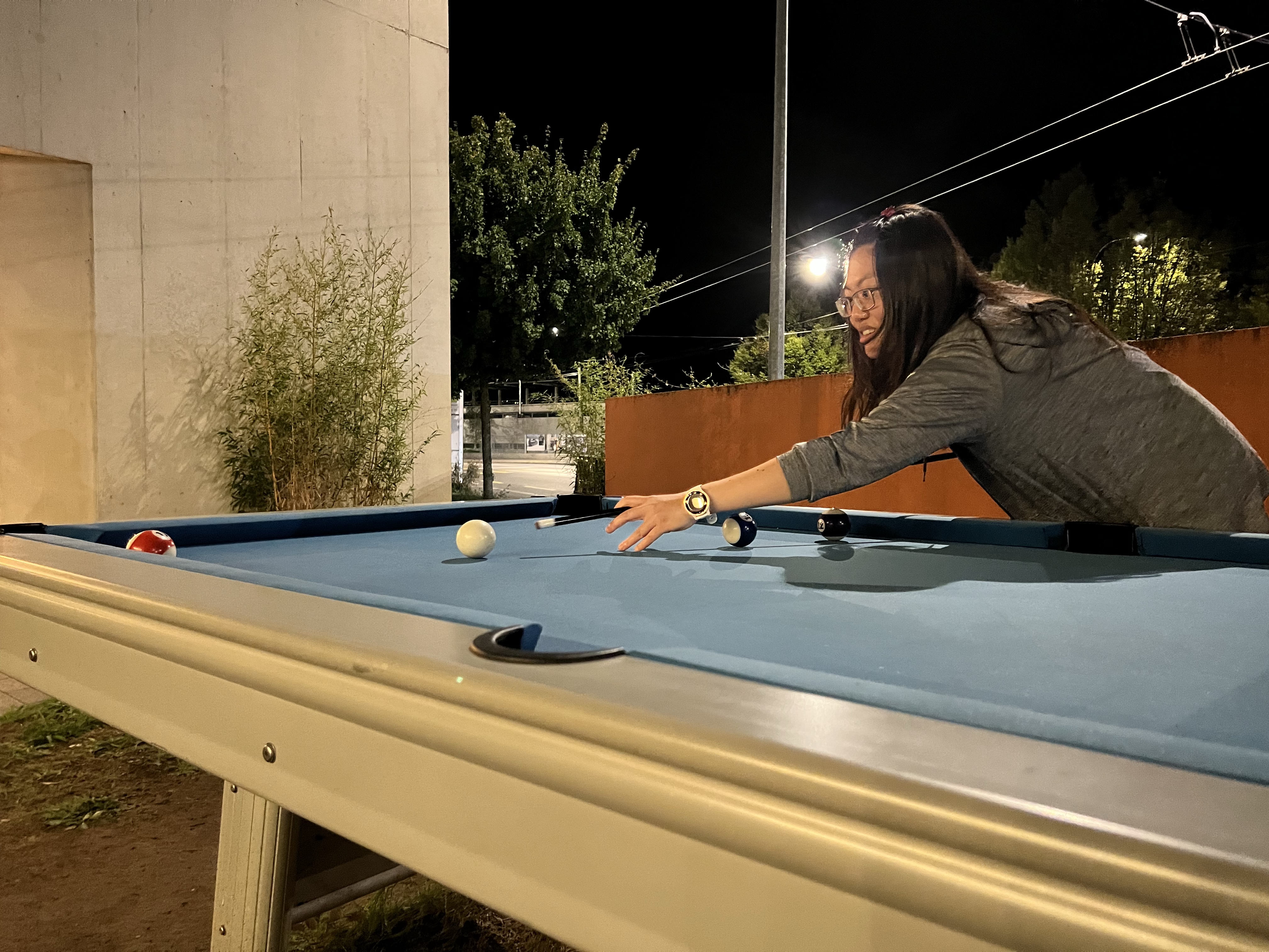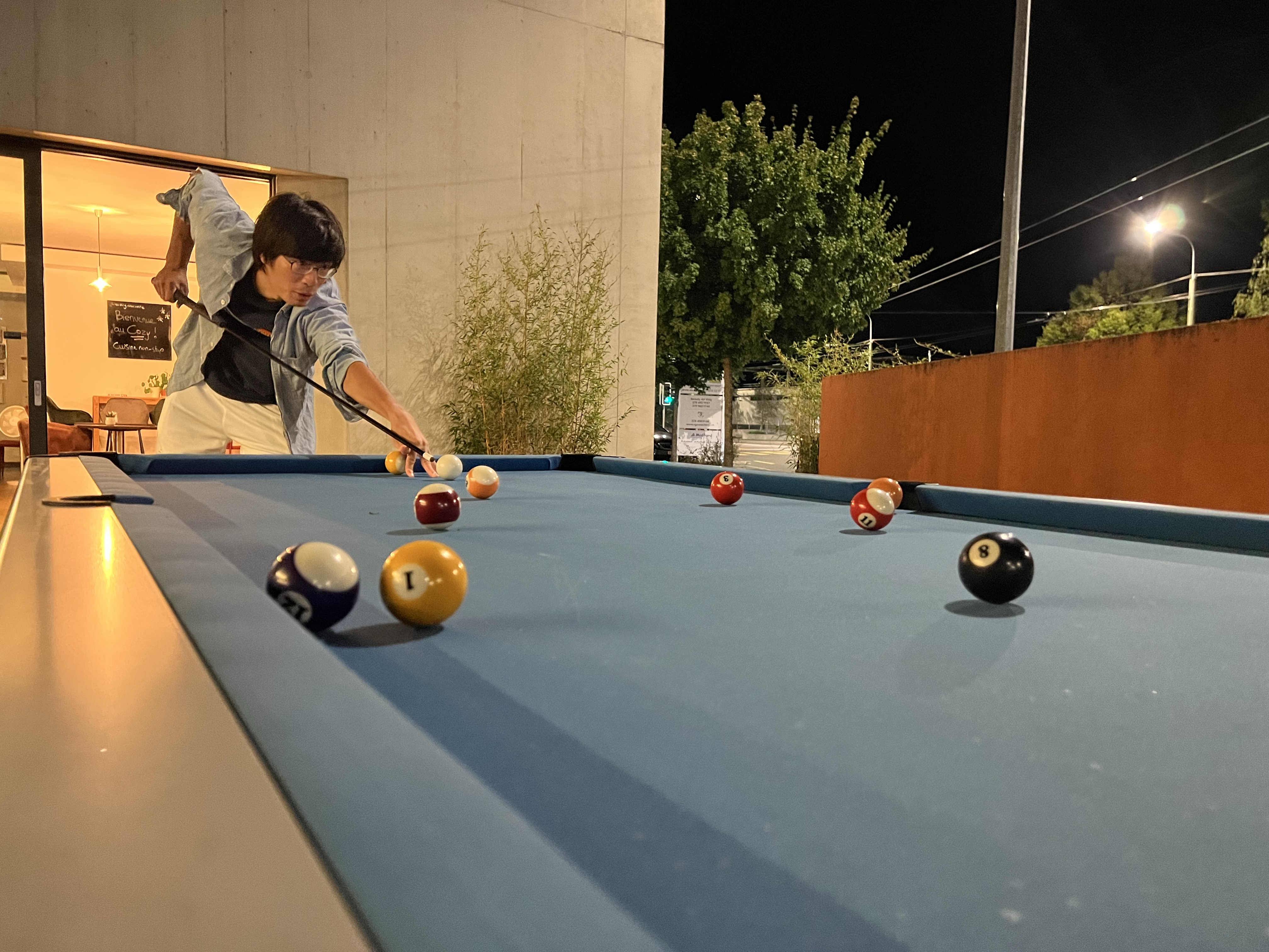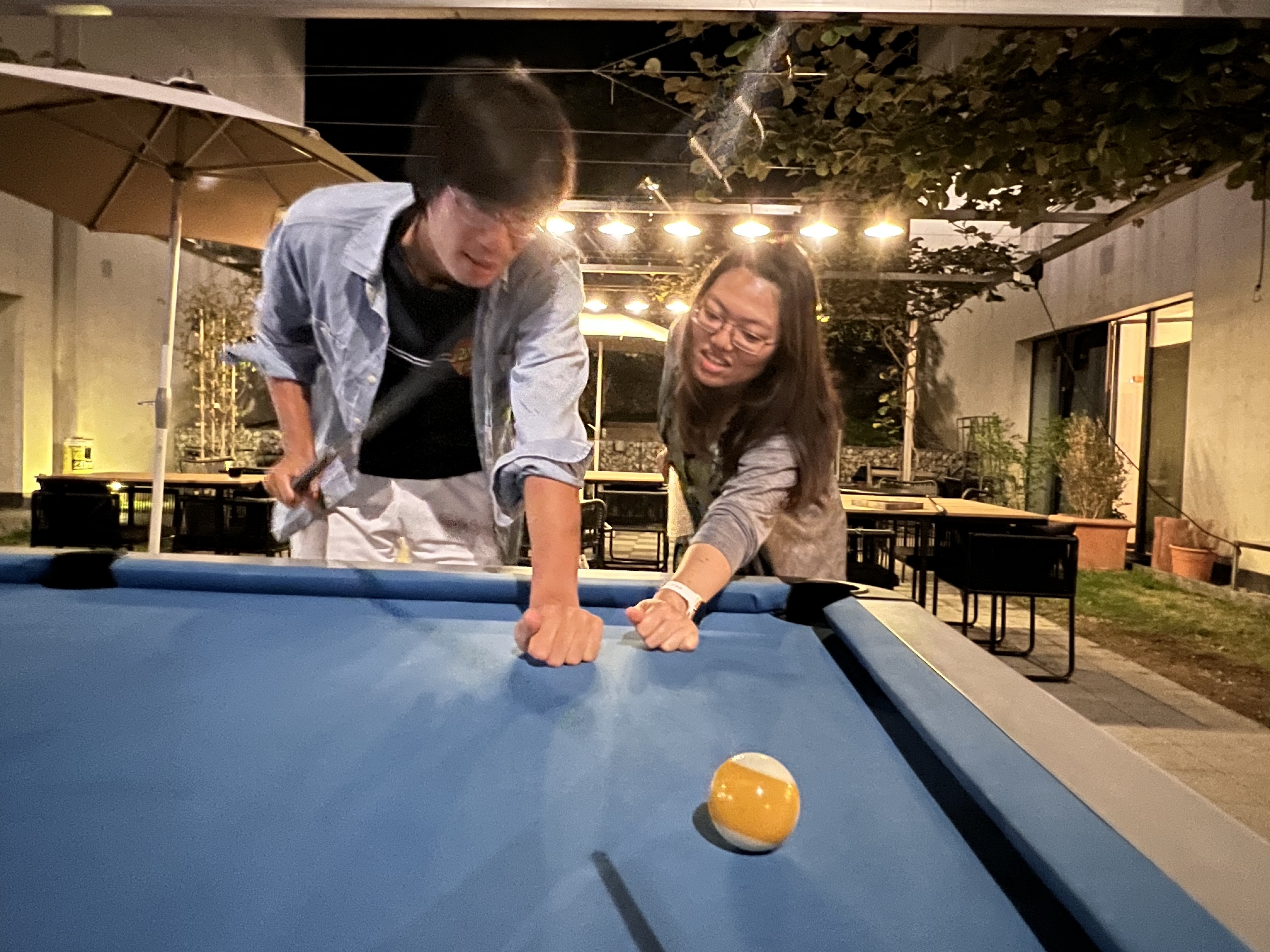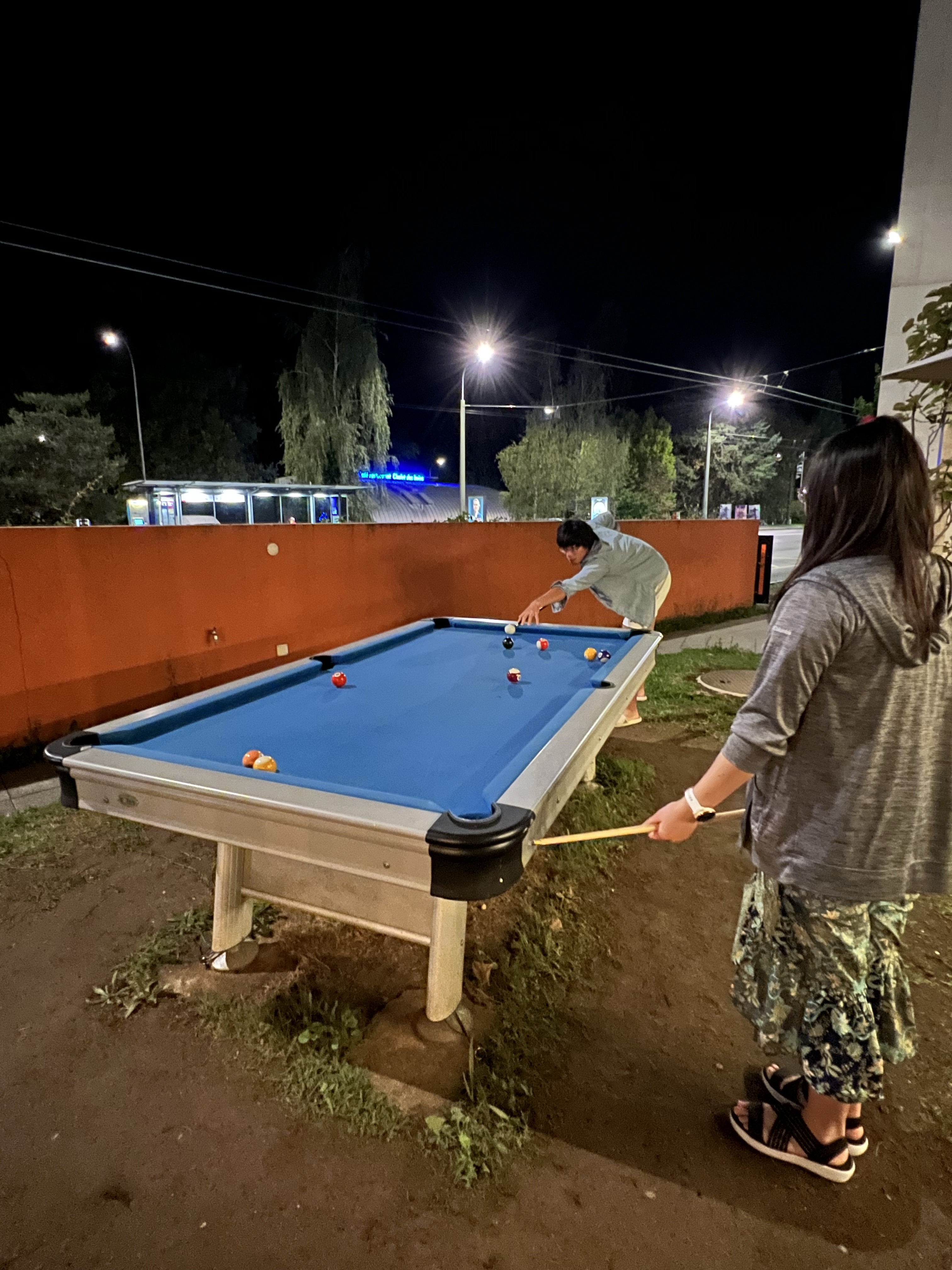 邊吃飯邊看室外庭院裡的撞球桌,看前一組人什麼時候打完,打撞球才是來這吃飯的重點!看他們好像一場接一場,只好使出「眼巴巴盯著看」的招式才終於換我們打。陳博士看起來很會打,姿勢穩定衝球強勁,還教了茹茹怎麼架桿和推桿,但茹茹初學者還是常常出桿整個滑掉或不小心就撞到球之類的,陳博士看久了最後出桿也常常滑掉,出桿滑掉好像會傳染。最好笑的是撞球桌放在室外,各種受潮之後桌布不平,某些位置放了球一定會滾走,還有一個袋口走到附近一定會掉進去,要打之前還得像高爾夫果嶺一樣蹲下來看草紋。我們打了兩局「搶8號」的玩法,我跟茹茹對抗陳博士,茹茹犯規通通不算這樣,結果還是要被慘電,可憐。打到十點多要關店了才離開,還又拿了一堆東西給陳博士帶回去,搬家好朋友棒棒。
