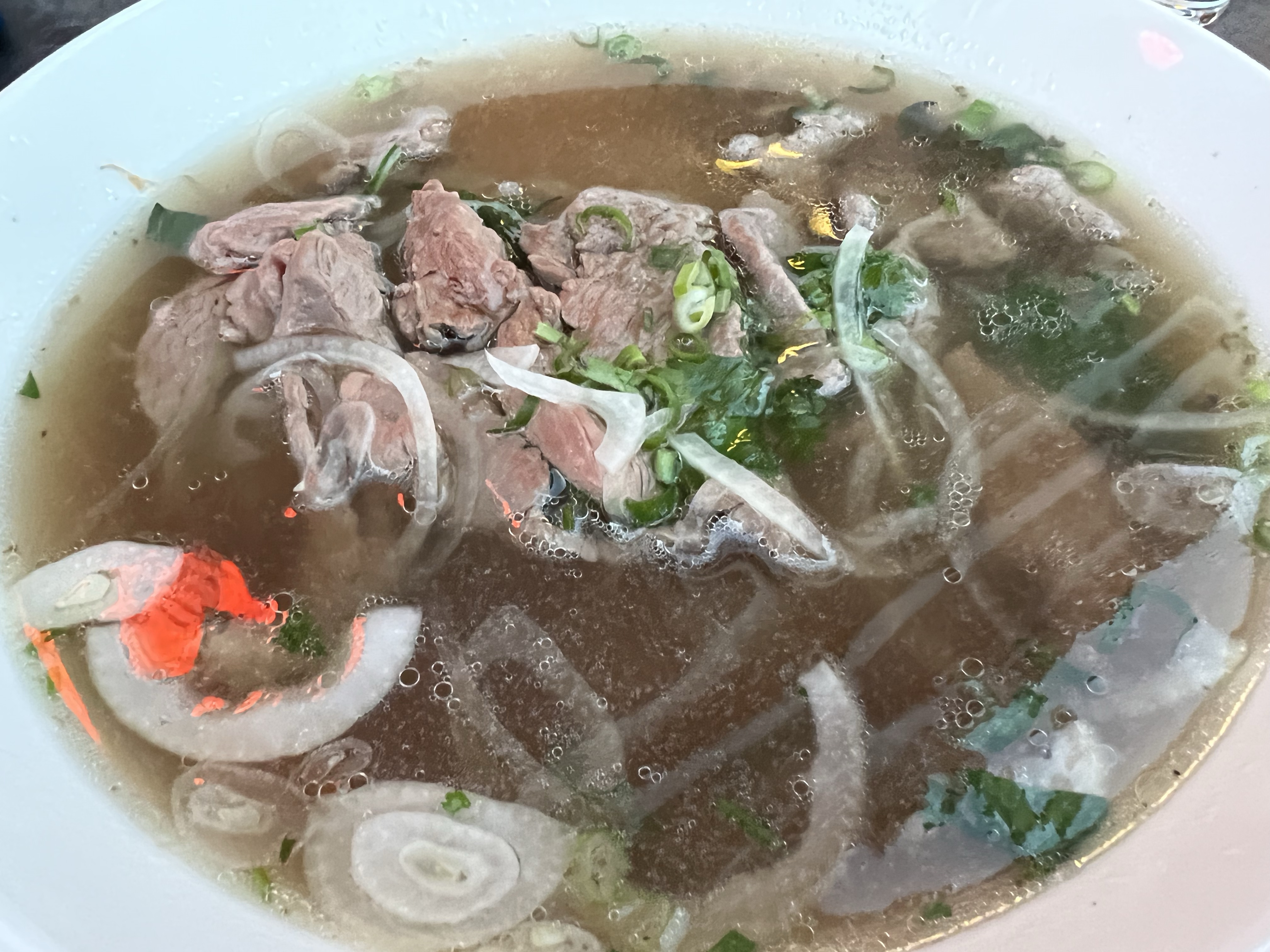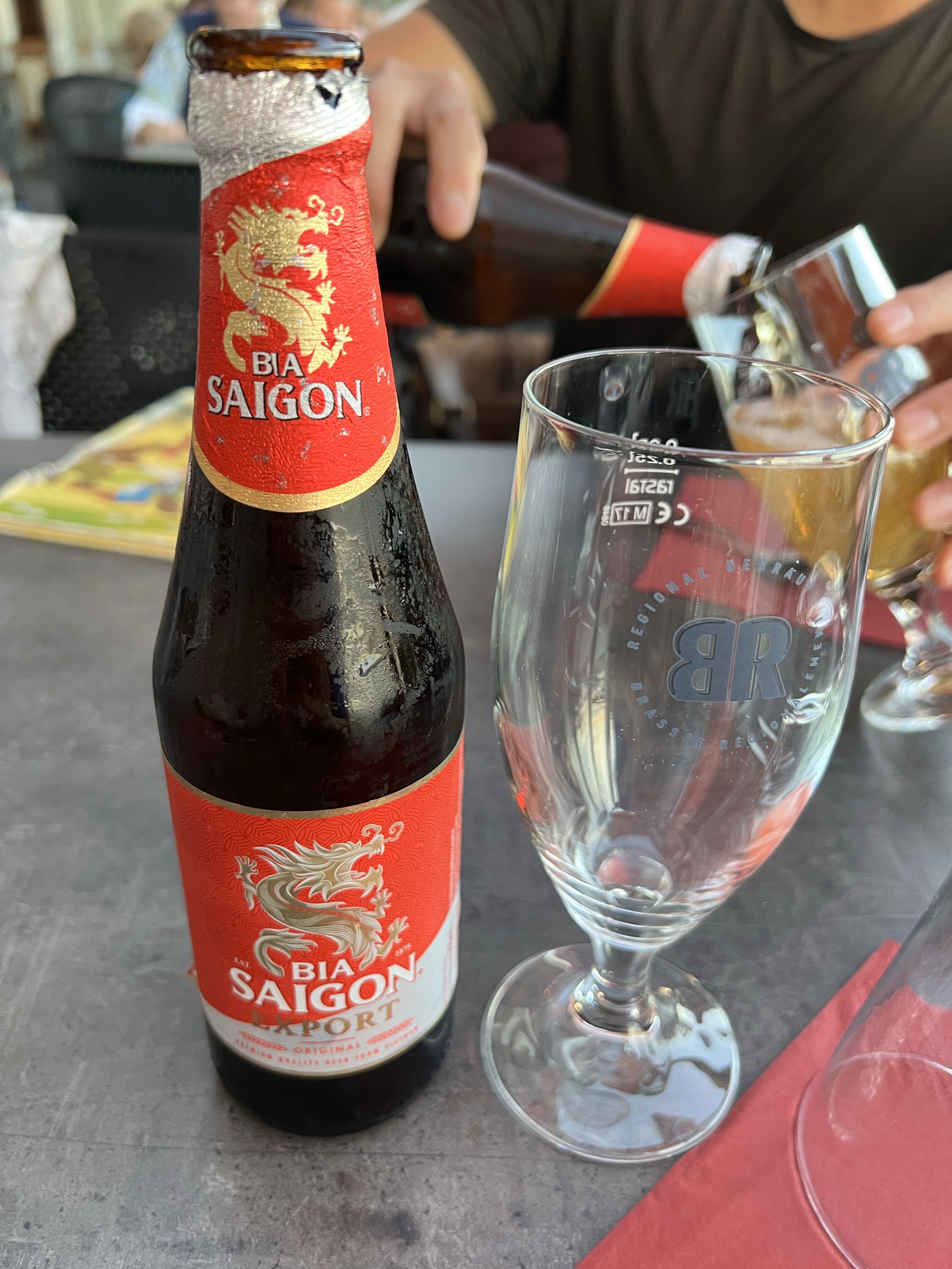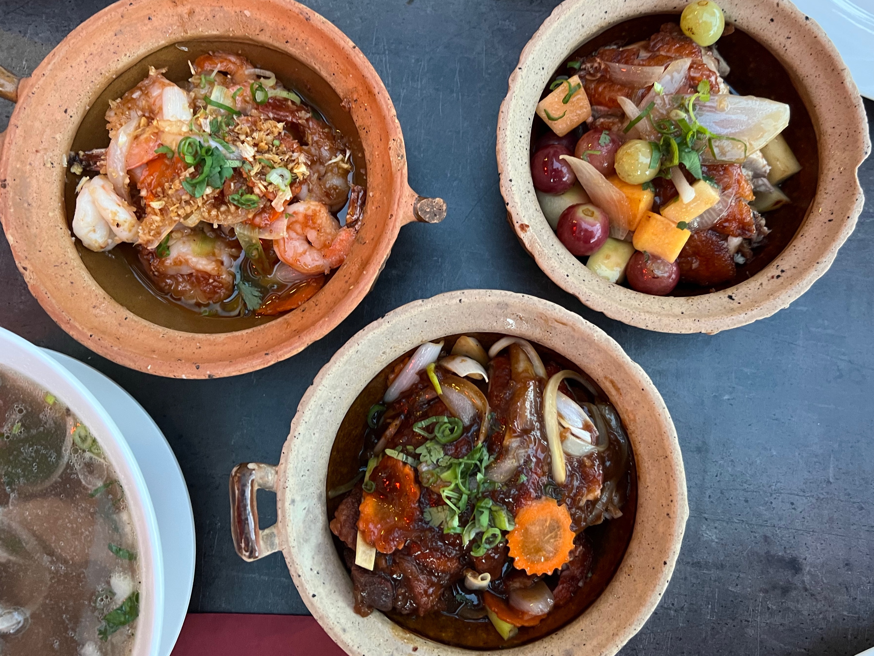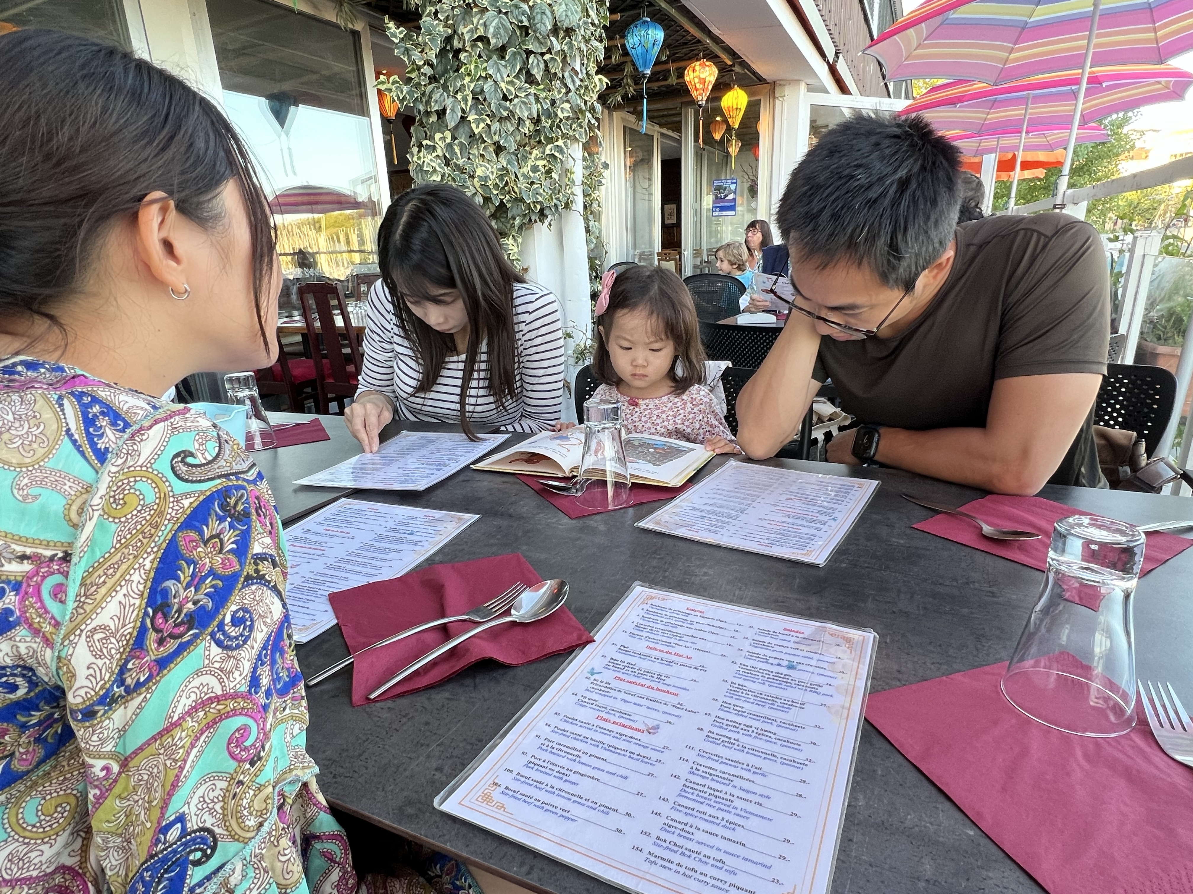 我們各點了不同的菜分食,茹茹點了牛肉河粉,我點了香料鴨,寧寧爸媽各選了水果鴨和西貢燉蝦,除了河粉外,其他的菜都是裝在熱熱的陶鍋裡,另外還有各自選的澱粉主食。我覺得蝦子有夠好吃,香料鴨也不錯,水果鴨甜甜的就有點怪,牛肉河粉就那樣。整體來說是蠻不錯的餐廳,加上風景好氣氛佳,是值得推薦給(不想吃歐洲菜的)觀光客的餐廳。