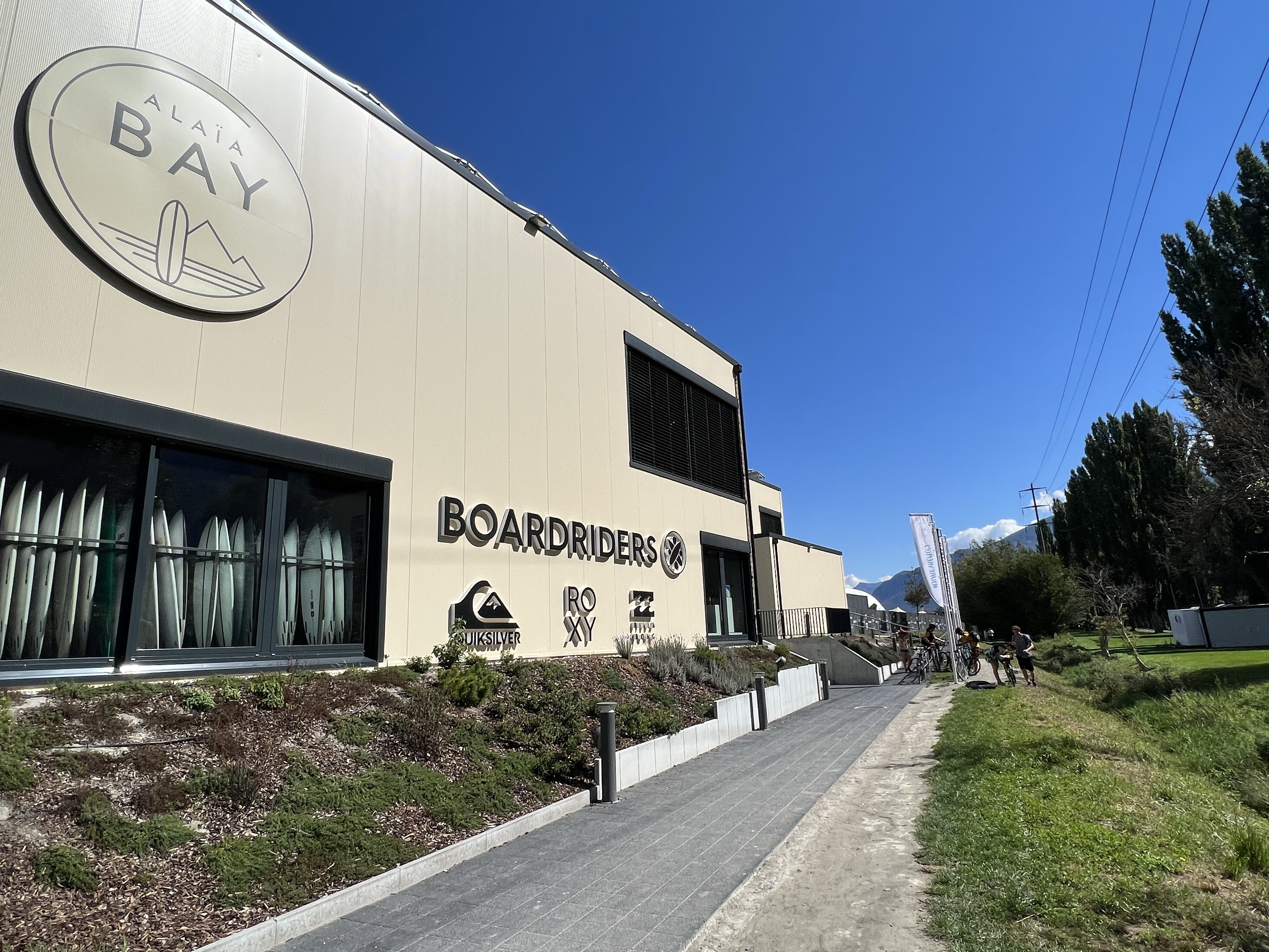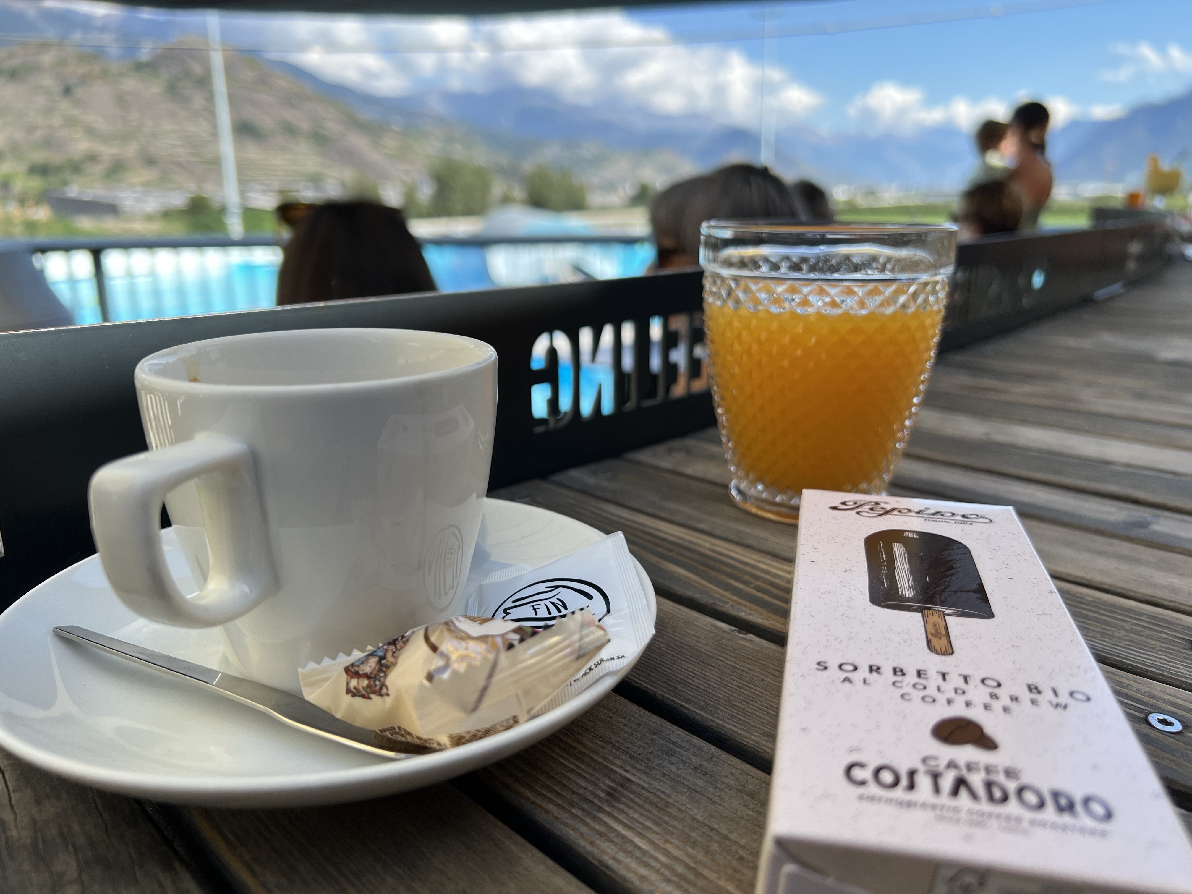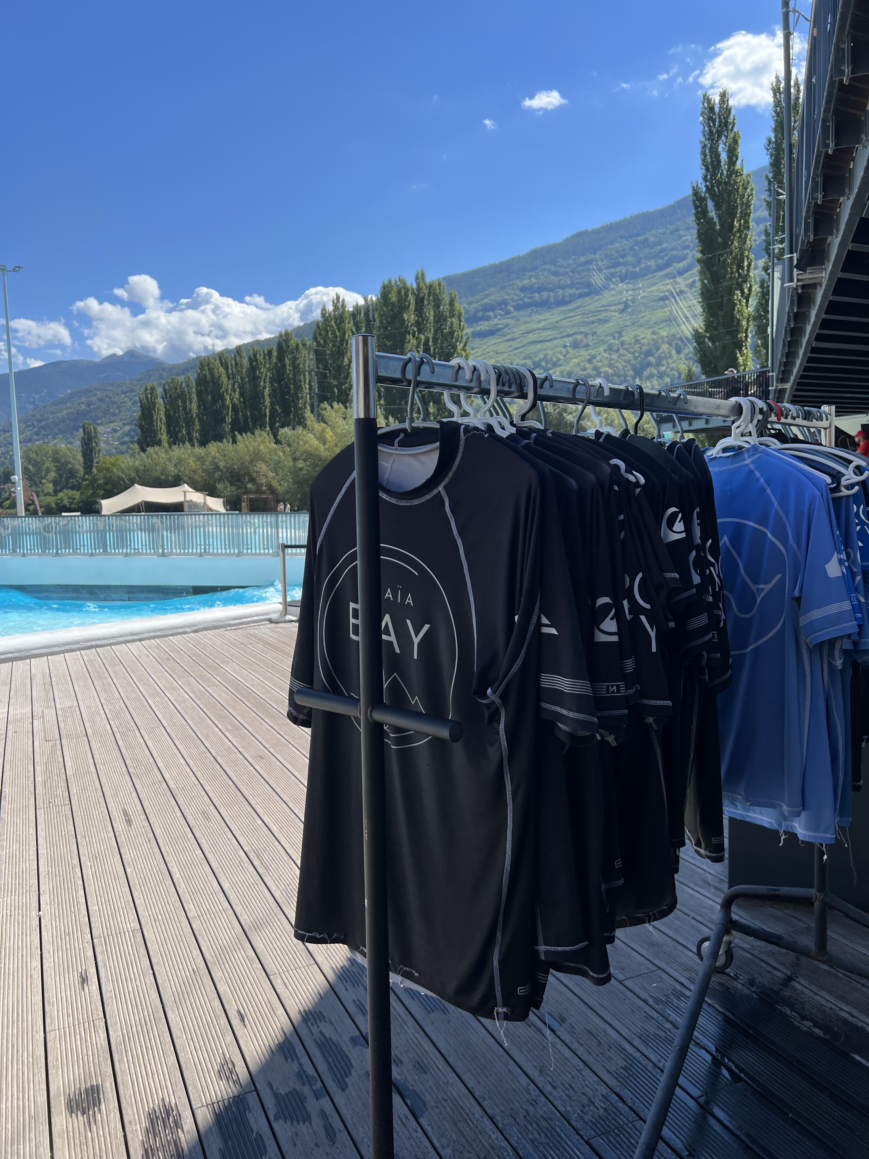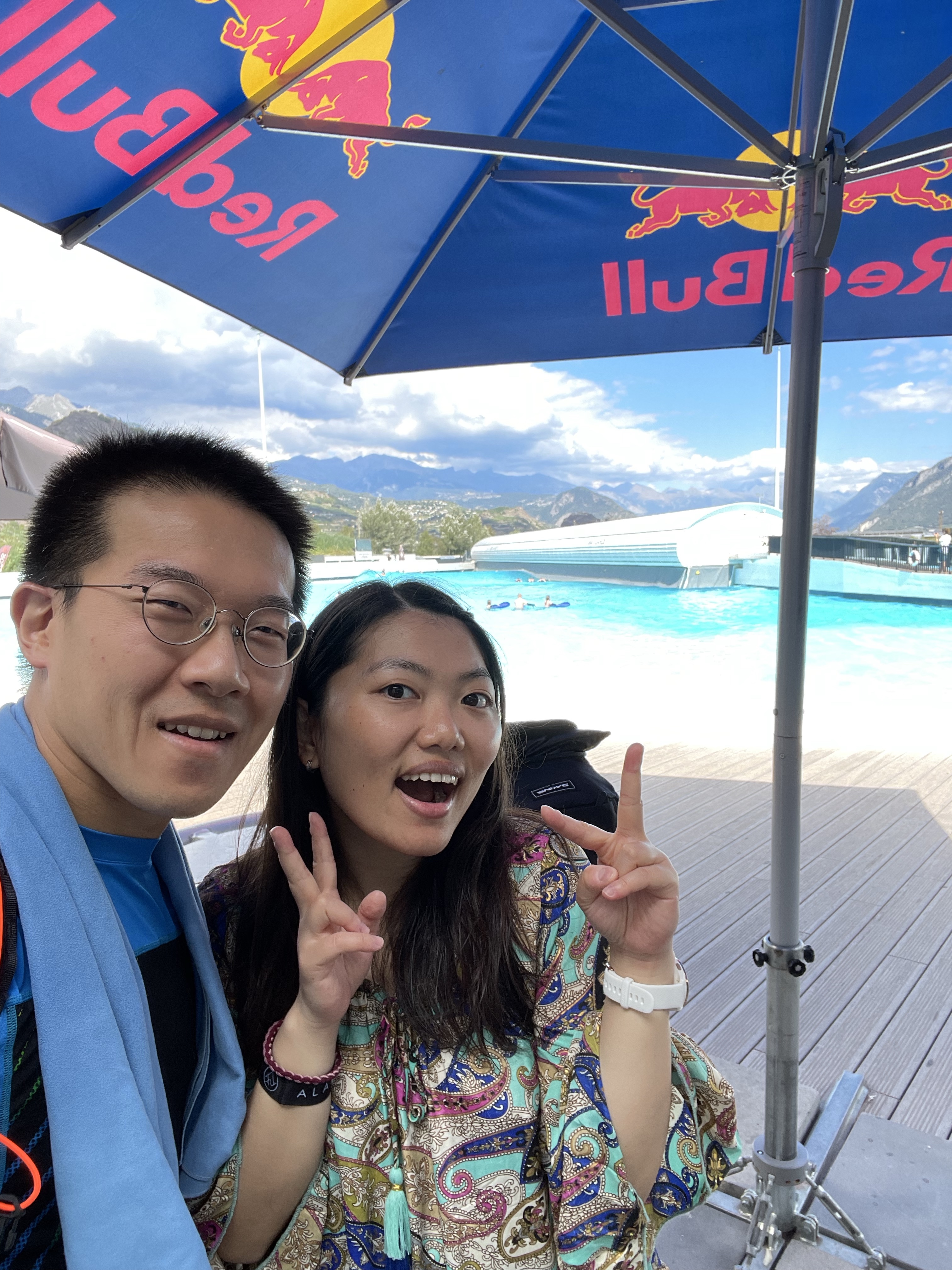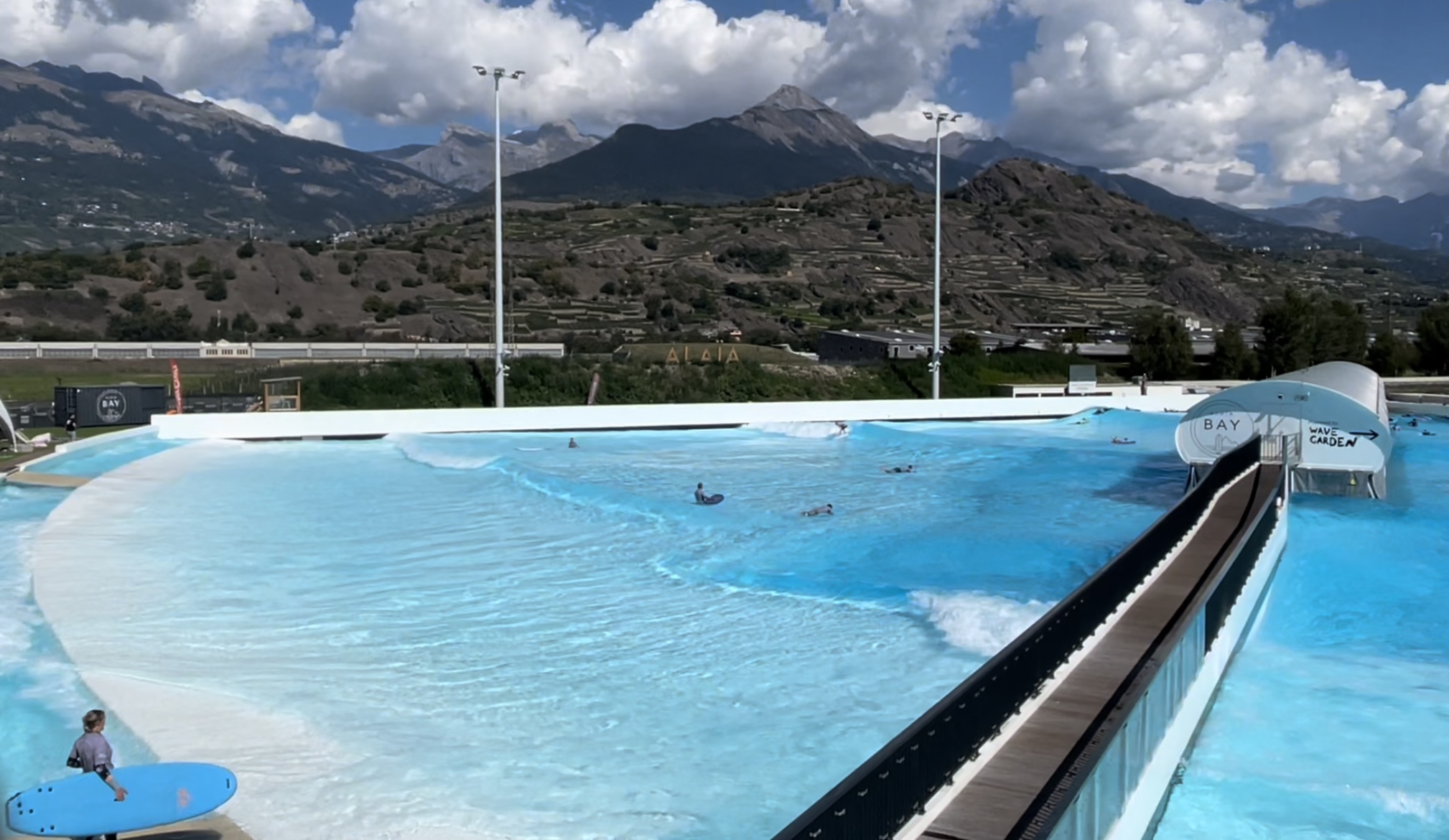 首先去櫃檯報到,因為我們提早了很多到,櫃檯只提醒我們13:15要換好衣服在池子旁等教練,拿給我們各一條感應手環,感應後就能進到浪池區內。一樓旁邊有間賣衝浪用品的店,可惜禮拜天沒開;二樓是餐廳酒吧,拿了支咖啡冰棒、點一杯現榨柳橙汁,拿到外面的陽台坐著看底下的人衝浪。這裡的風景真的好,遠方就是阿爾卑斯山脈一些比較邊緣的山峰,近一點則是Sion位在山麓的城區和小山頂上的城堡遺跡,一座人造浪池位於群山中著實魔幻。吃喝完還有一些時間,茹茹覺得在法語區大家網站都會標名有英文教學,但還是先預習比較保險,所以選了個衝浪初學的影片預習,教練教得很細,第一部是滑水的動作,第二部是教如何從板子上站起來,非常實用(但教練示範的表情很猥褻)。
