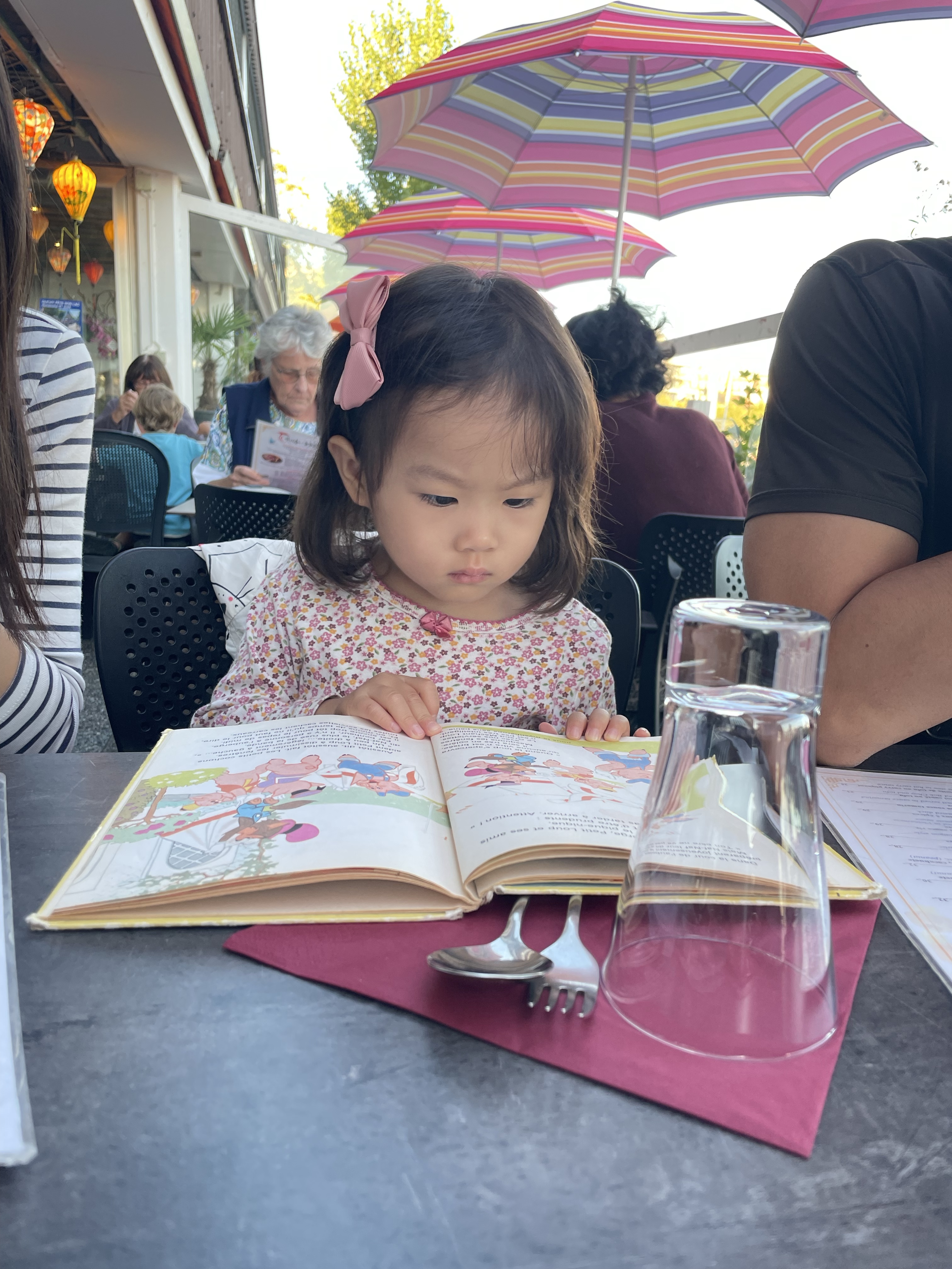吃飯前寧寧就抱著茹茹從櫃檯拿來的繪本狂看,茶不思飯不想,直到上菜了才乖乖放下書;等我們吃到一個段落,寧寧就抱著繪本跑過來,坐在茹茹腿上要茹茹唸故事給她聽!茹茹不愧是說故事大師,就算整本書都是法文,看圖說故事一點都沒問題。不過寧寧是個問問題大師,常常提出很有見地的問題,像是問三隻小豬的爸爸想要做什麼,之後再出現一樣的角色時,她都會記得你之前說的話,還會挑出矛盾的地方問你,非常需要臨機應變!