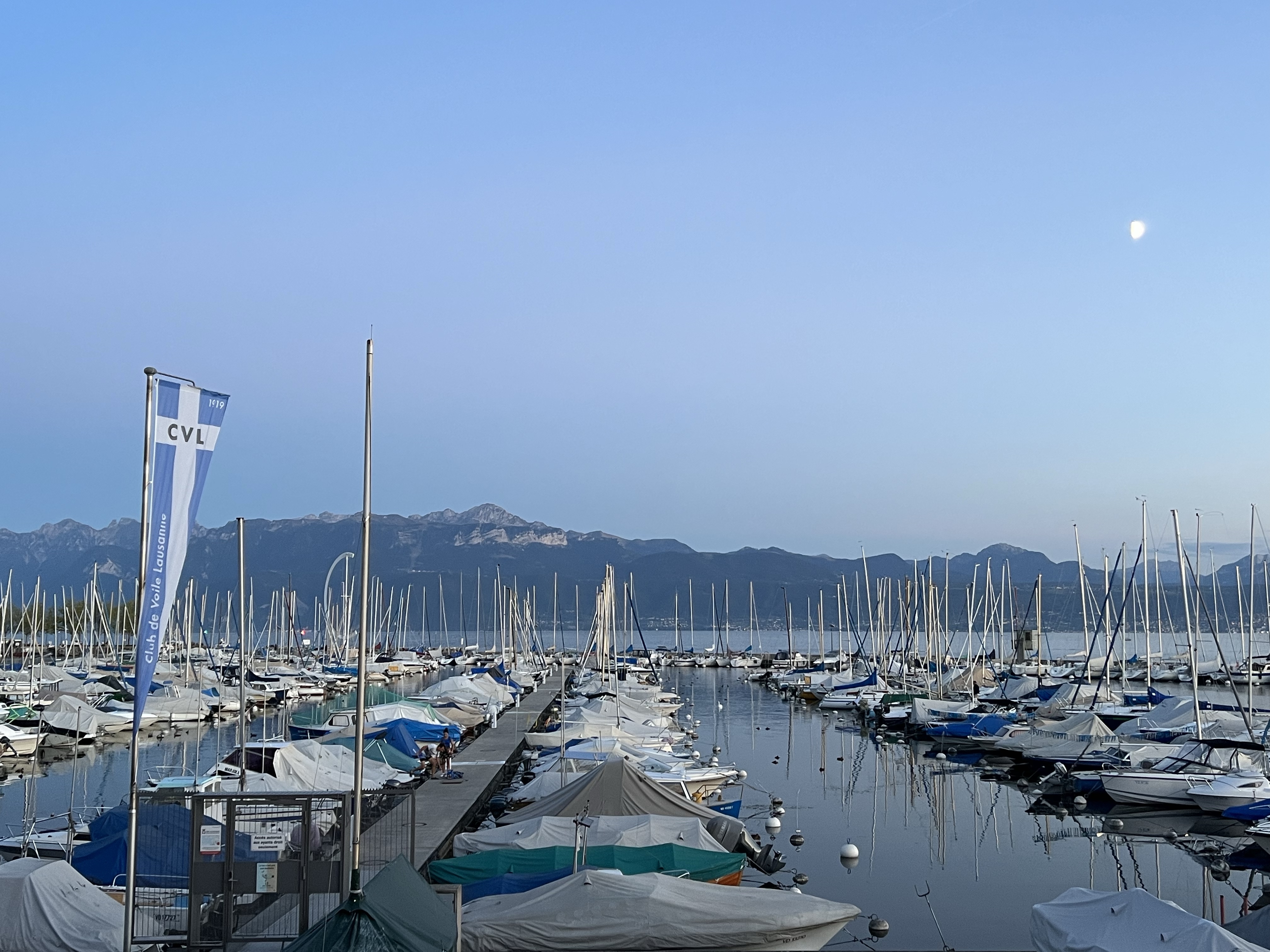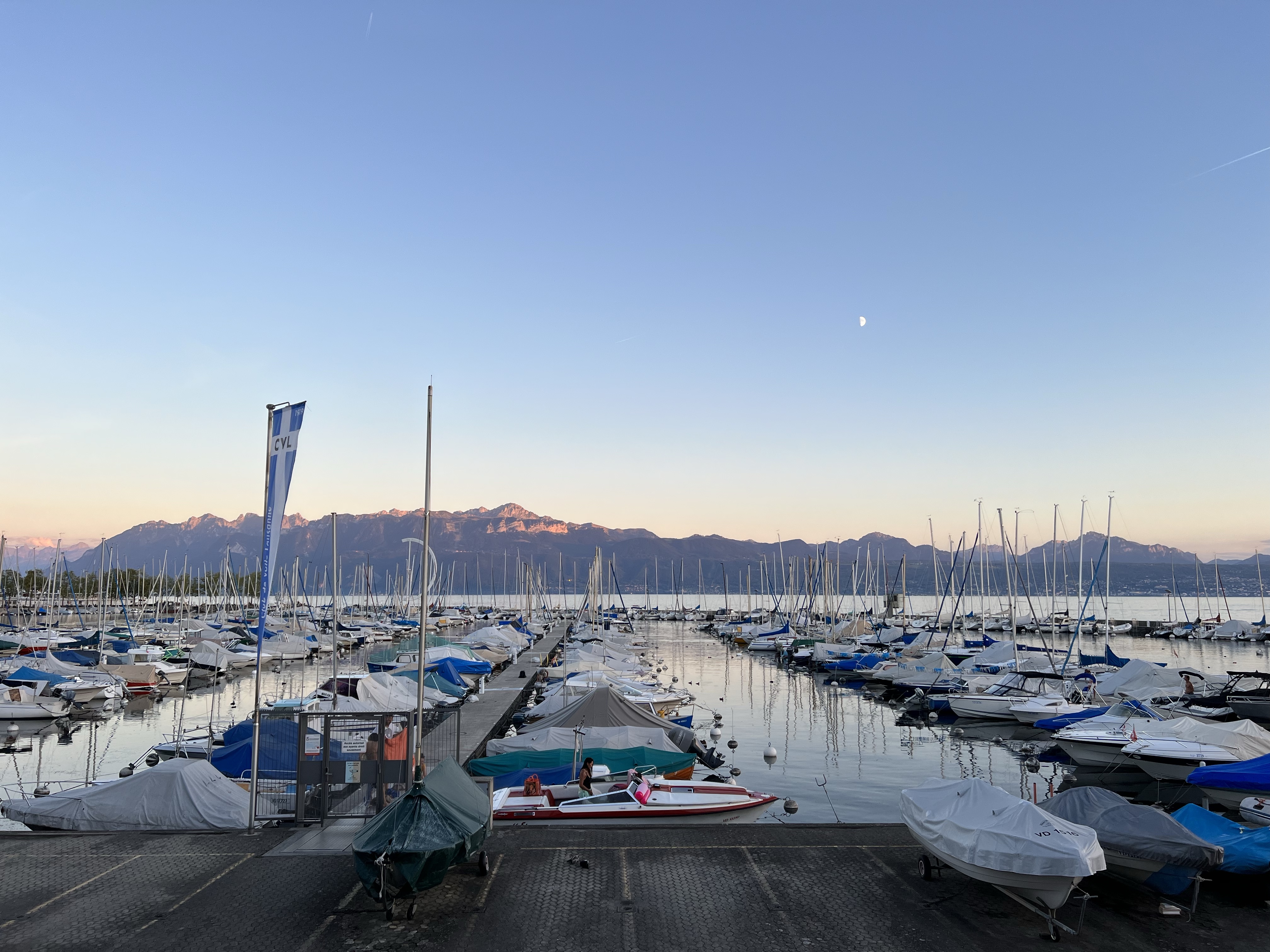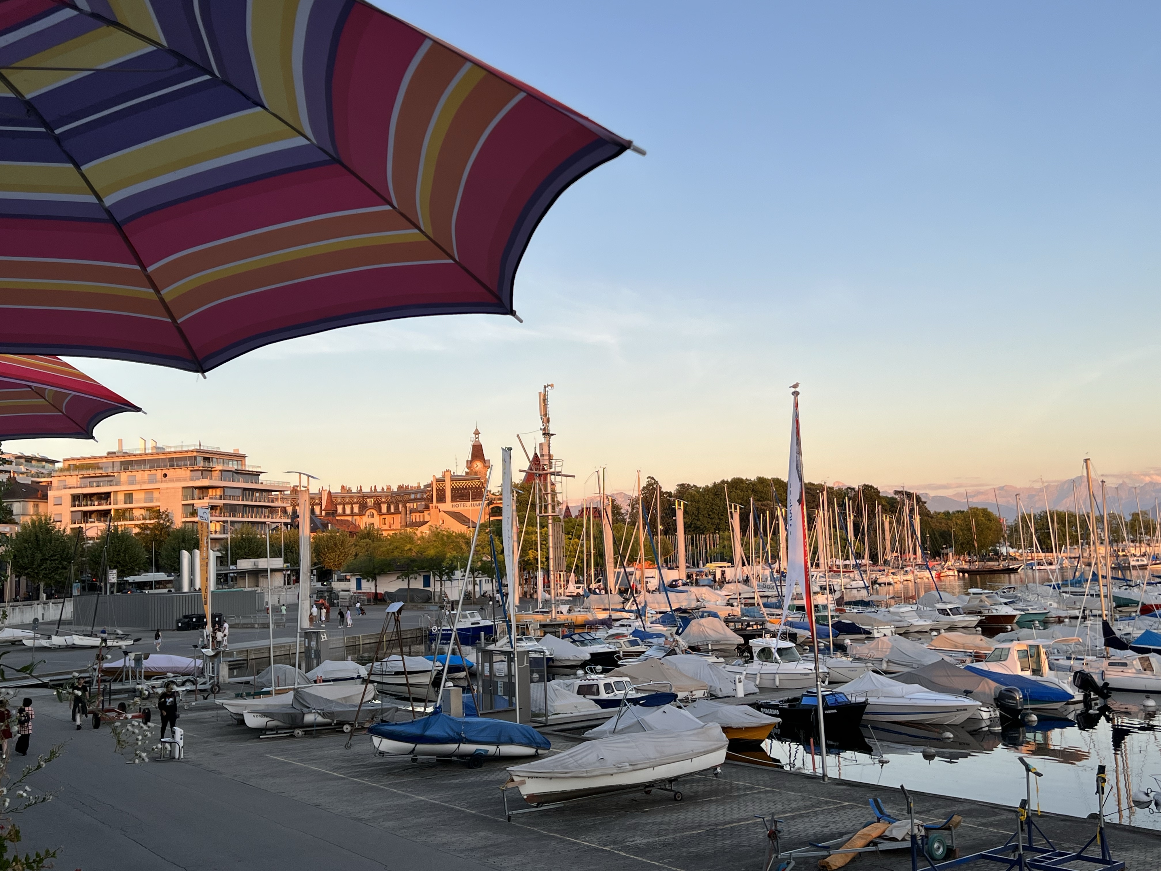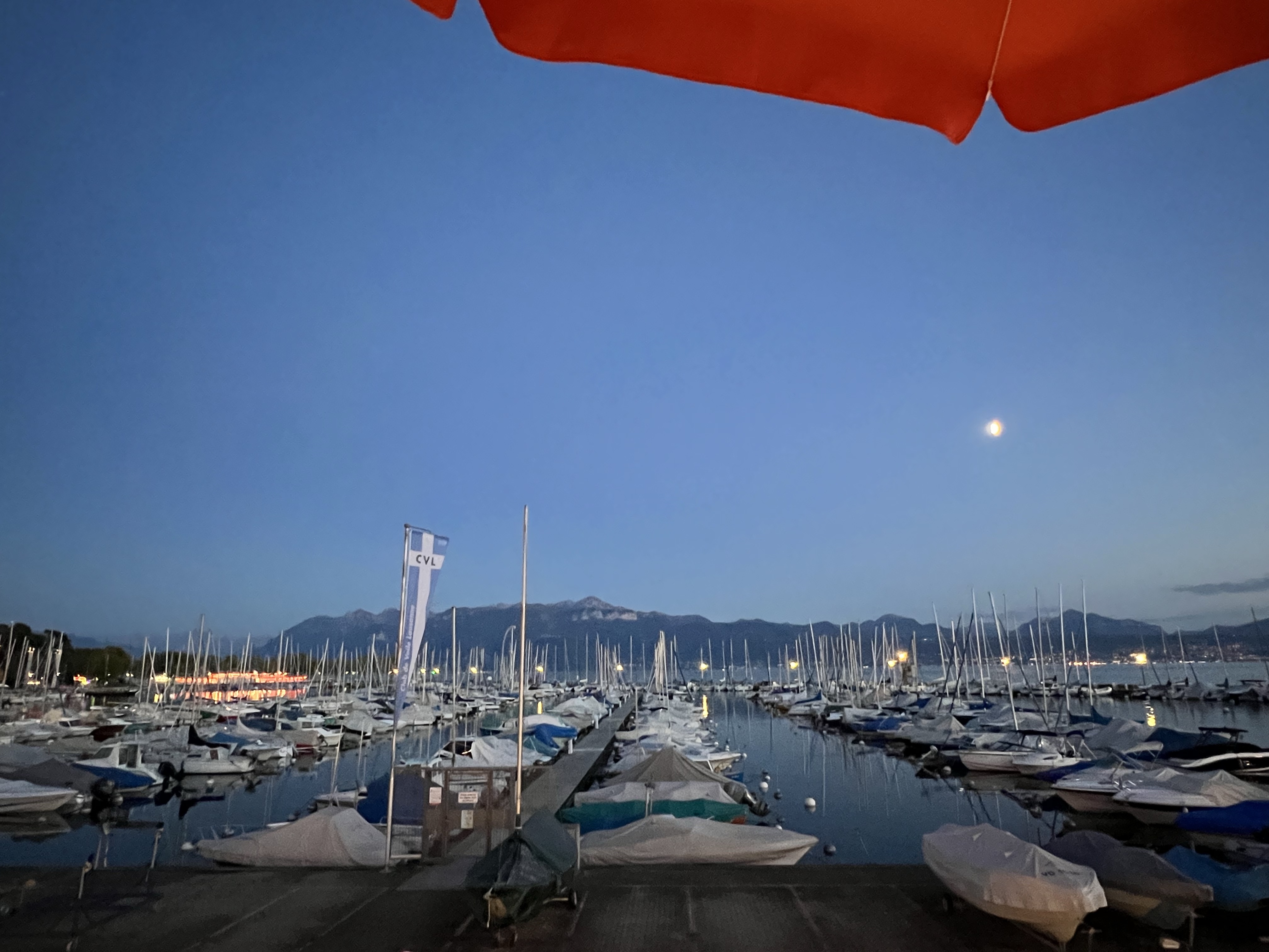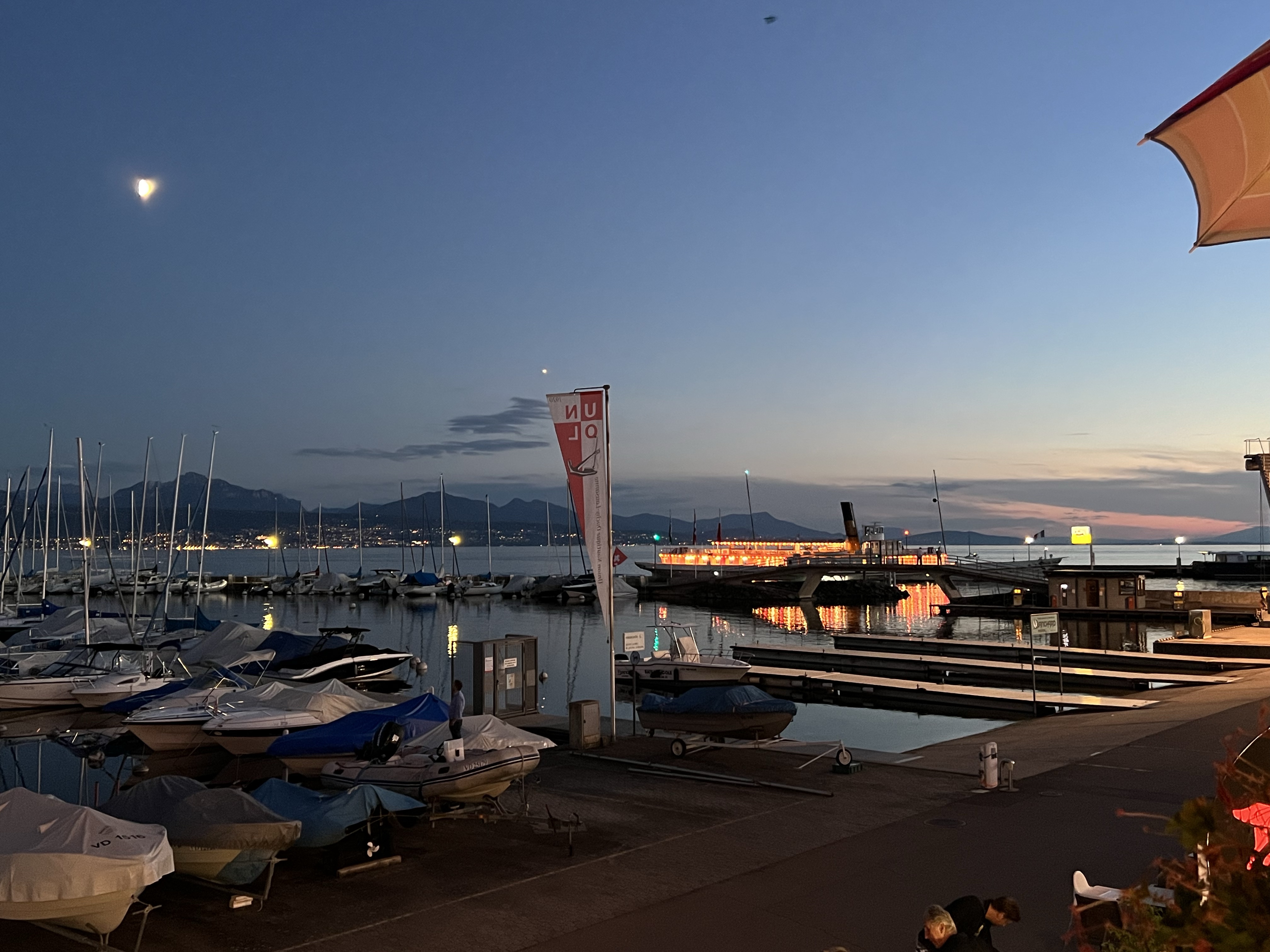 回到旅館放個東西,就走路去Ouchy港口邊的餐廳,晚上要跟最愛茹茹的小女孩寧寧及她爸媽吃飯!是一間面向港口的越南餐廳,在二樓視野很好,能看到整個港口停靠的帆船和倒映著遠山的湖,還有正好在山頭的月亮。寧寧一來就興奮的跟茹茹打招呼,然後看到我就縮起來表示害羞。茹茹拿出要給寧寧的一大袋禮物,有買健達出奇蛋送的白熊、Anna和Olaf,還有各種色鉛筆和印泥等等小文具,寧寧雖然顧及我在場有所矜持,但喜悅之情都寫在臉上了!