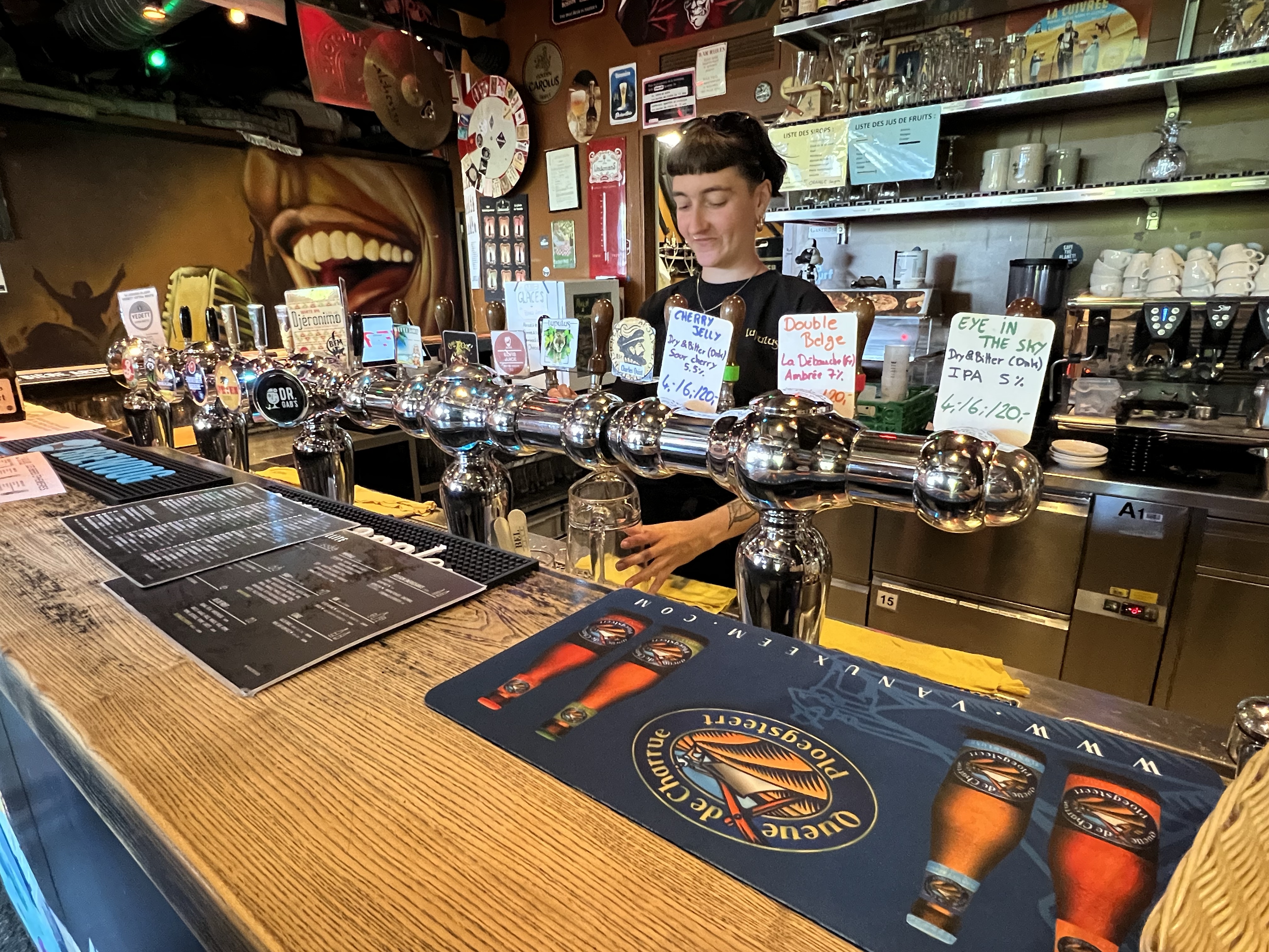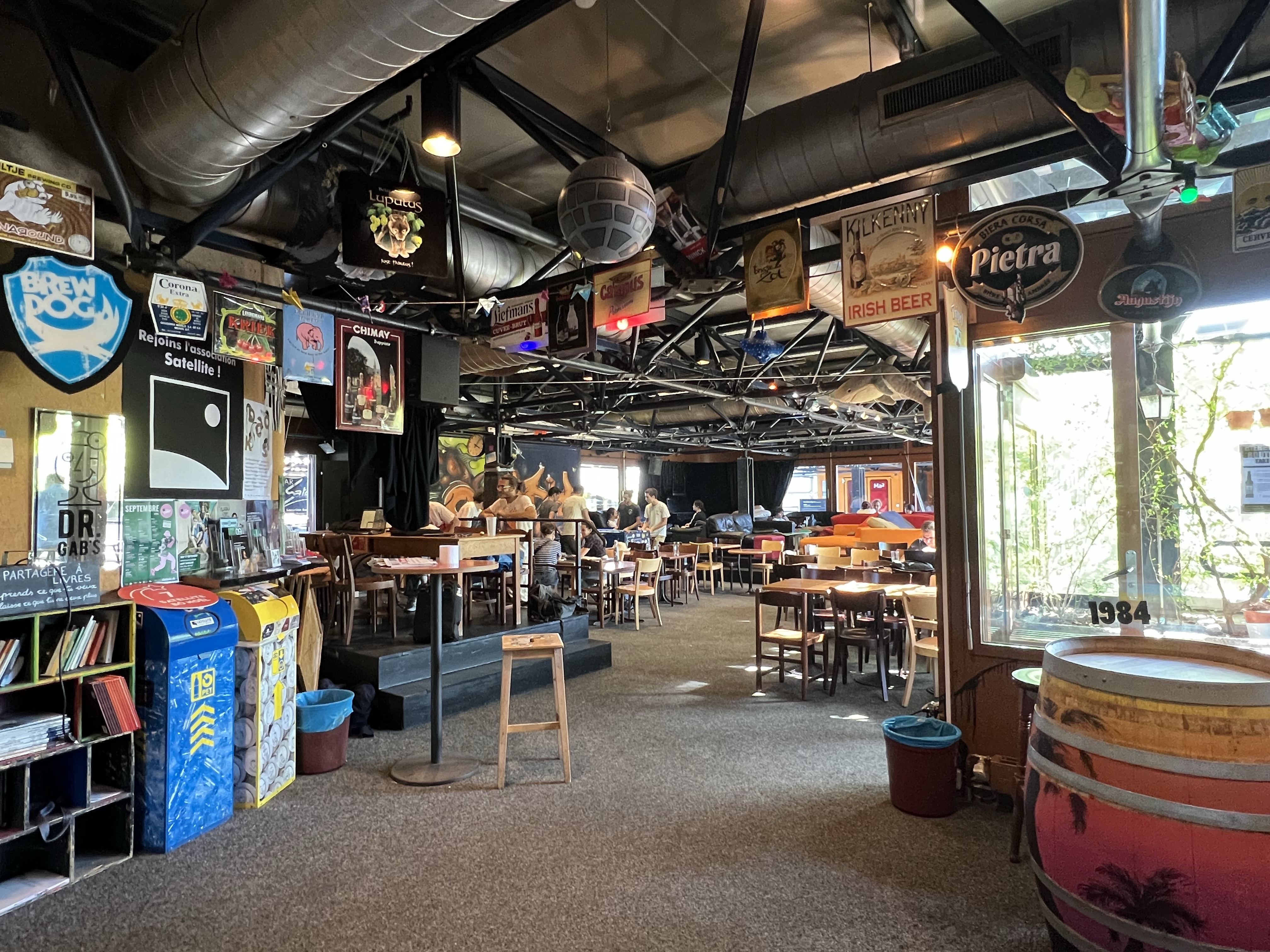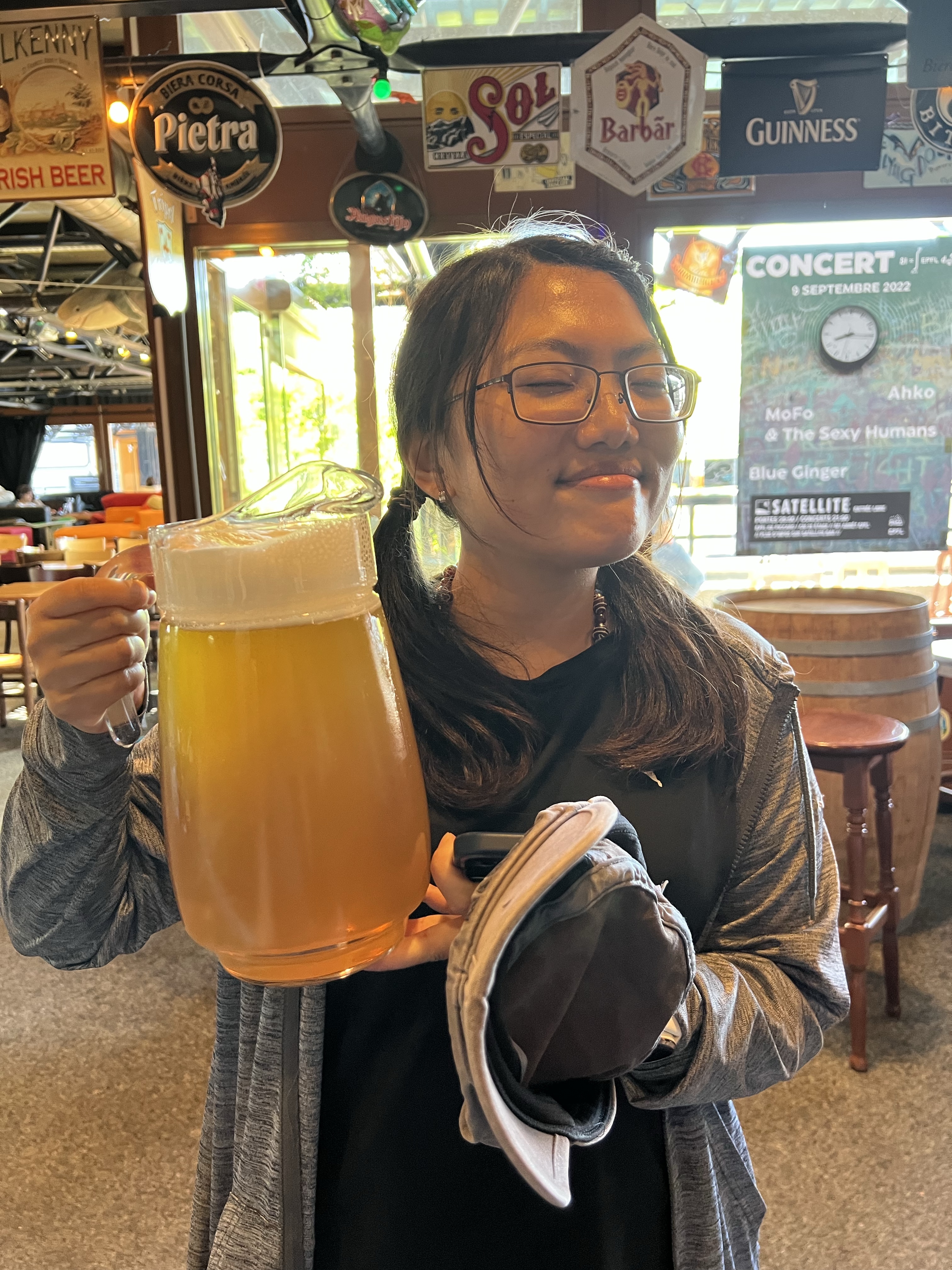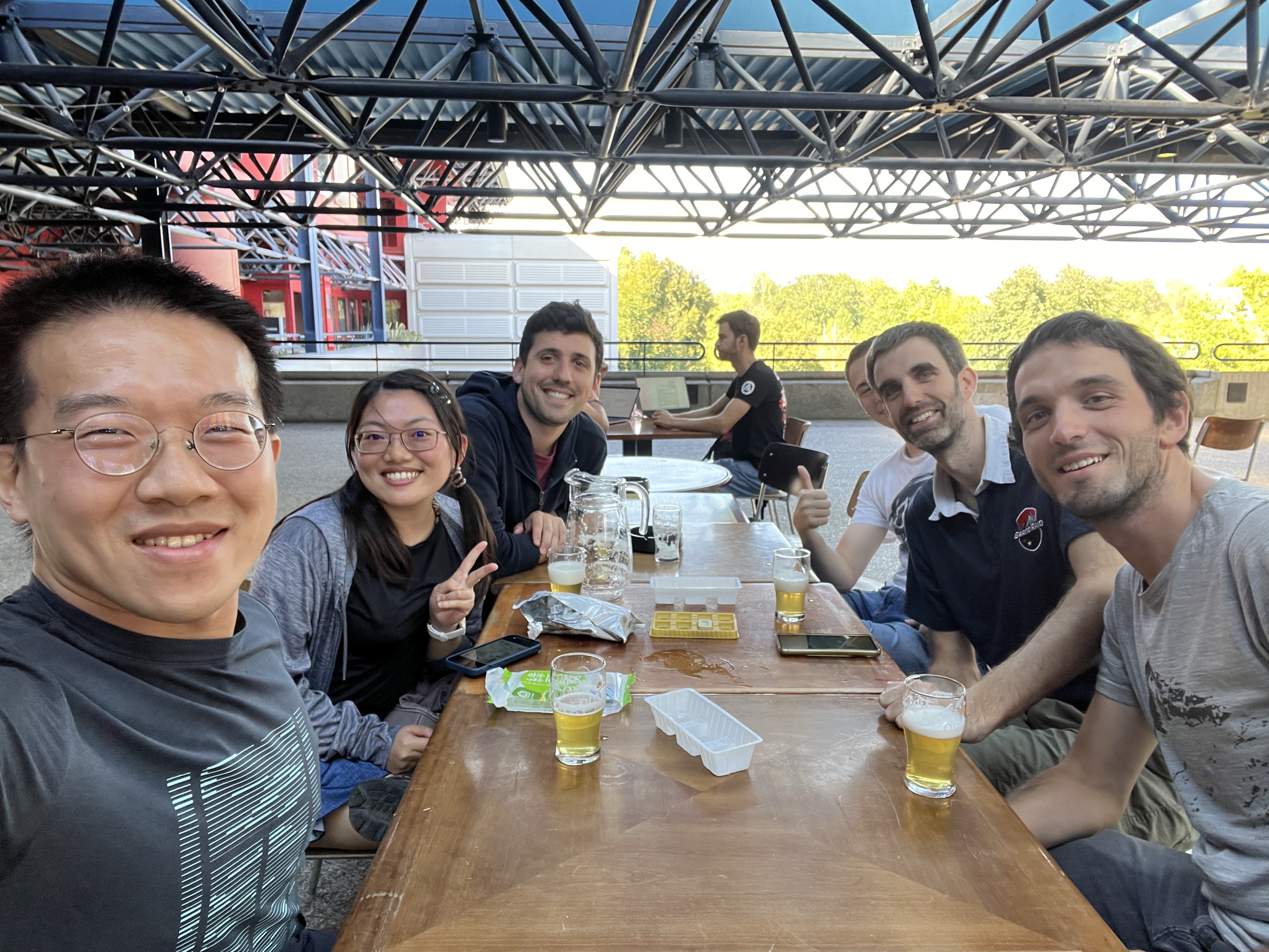 酒吧就在研究室大樓的頂樓,有些人是來喝酒放空,有些人是來喝酒做事的。吧台提供超級多種啤酒,茹茹隨意選了一款長相看起來清爽的,沒想到是裡面酒精濃度最高的。我們點了一大壺大概三公升一起分著喝,還拿出我帶來的綠豆糕和鹹蛋黃捲心酥,大家意外的很喜歡綠豆糕,而且居然跟啤酒很搭。大家跟我們聊天用英文,但彼此聊天就變成法文,如果有兩個人聊起勁了就根本插不上話,也是微妙。