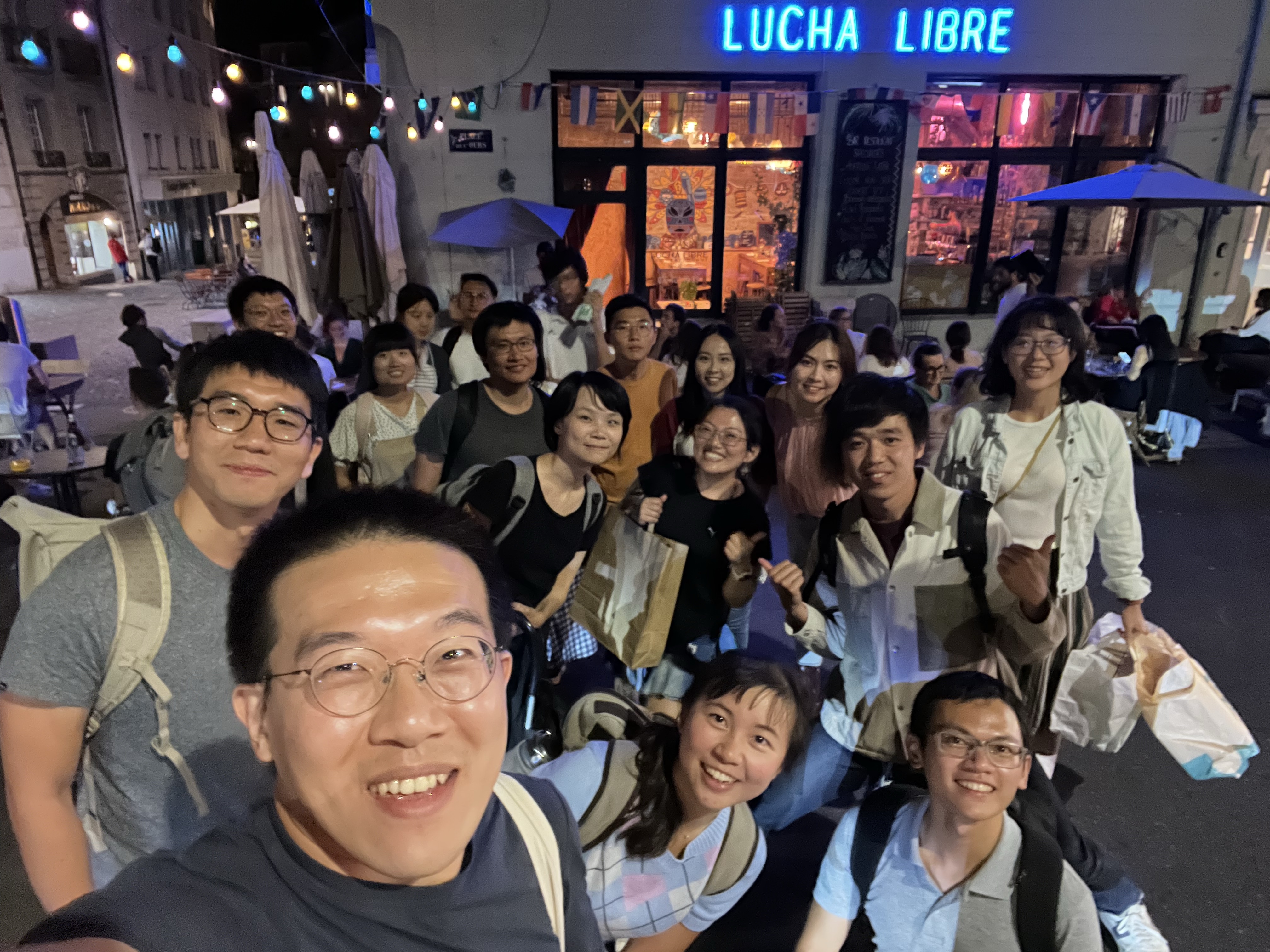 後來大家就各自群聚聊天,但店內音樂有夠大聲,不大聲講話根本聽不到;店員還不會主動上白開水,去要也只拿到一罐一人一口就喝完的量,導致最後大家喉嚨都超痛。最後大家大合照了一波,又去外面合照一波就各自解散,只有沈院士因為要拿瑜珈墊練柔軟度,揪他的麻吉陳博士跟我們一起回旅館。