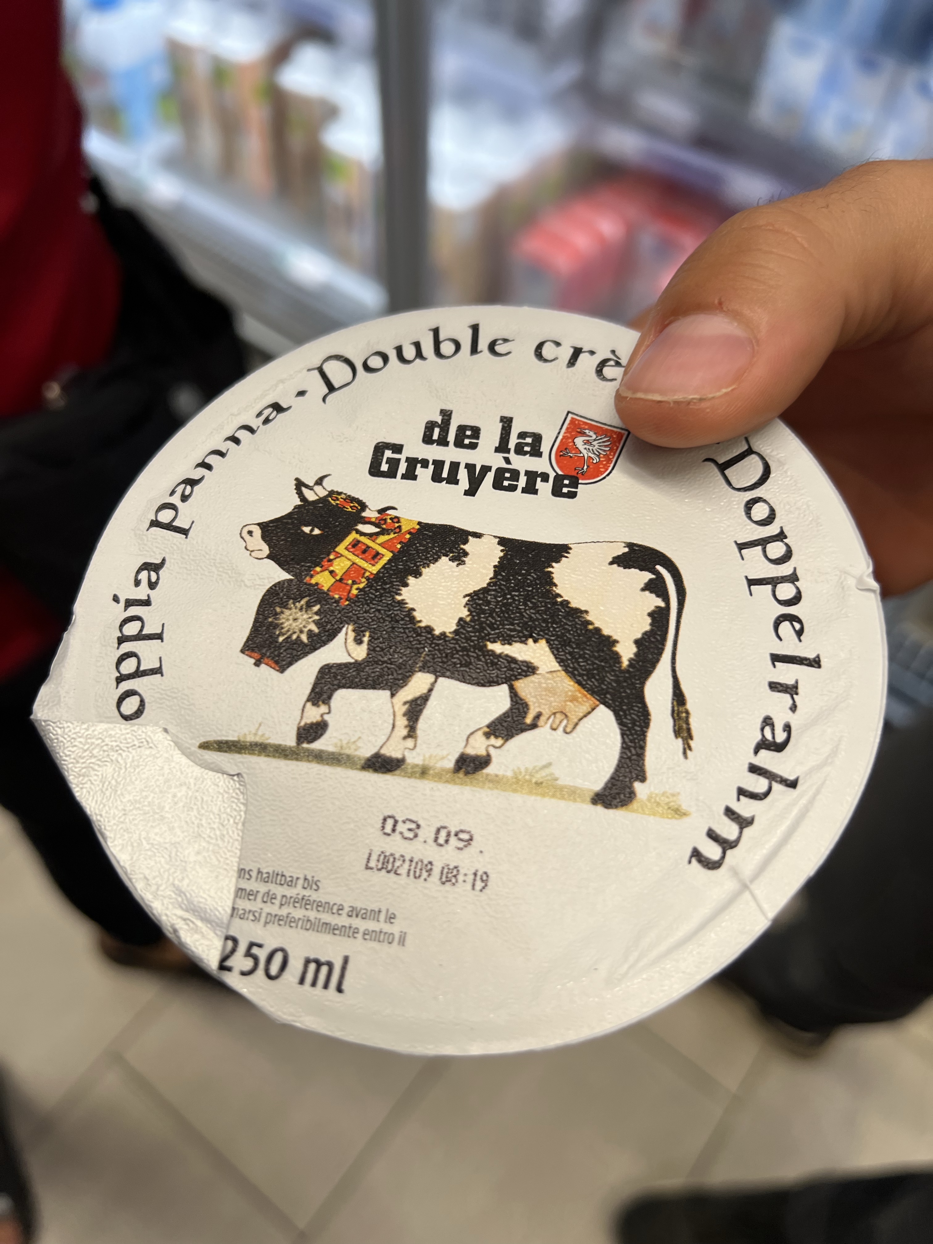 吃完飯後,法國人帶我們去附近超市買他超級推薦的double creme,感覺就是某種特肥的鮮奶油,然後不知道為何只有瑞士的這個區域才有賣,超級限定款!!再買一盒蛋白糖和莓果沾著吃,真的是單純的美味!!而且雖然是超高脂肪的鮮奶油,口感非常滑順外居然一點也不膩口,我一口氣就配著吃掉了三大個蛋白糖,真是差點肥死。
