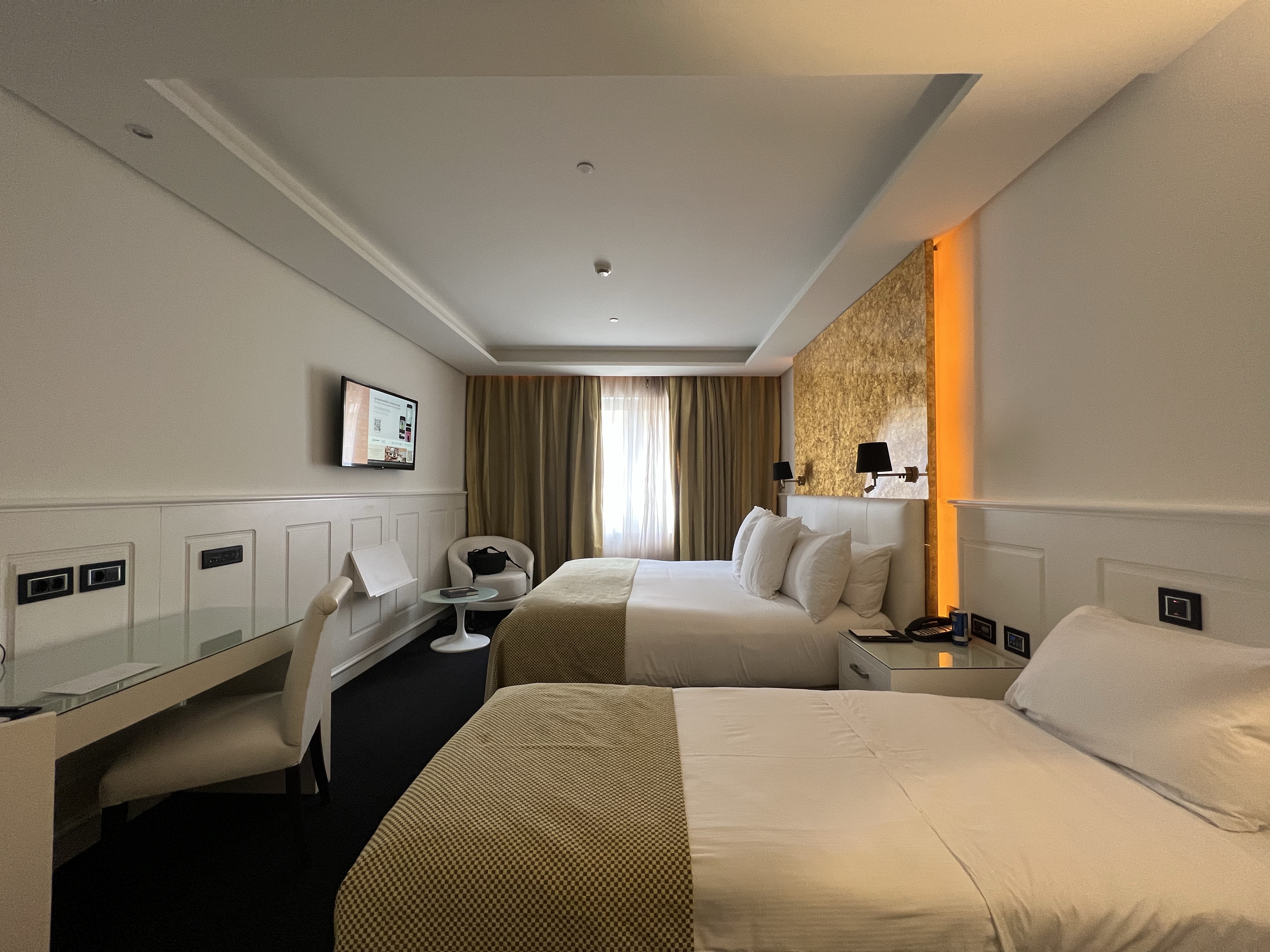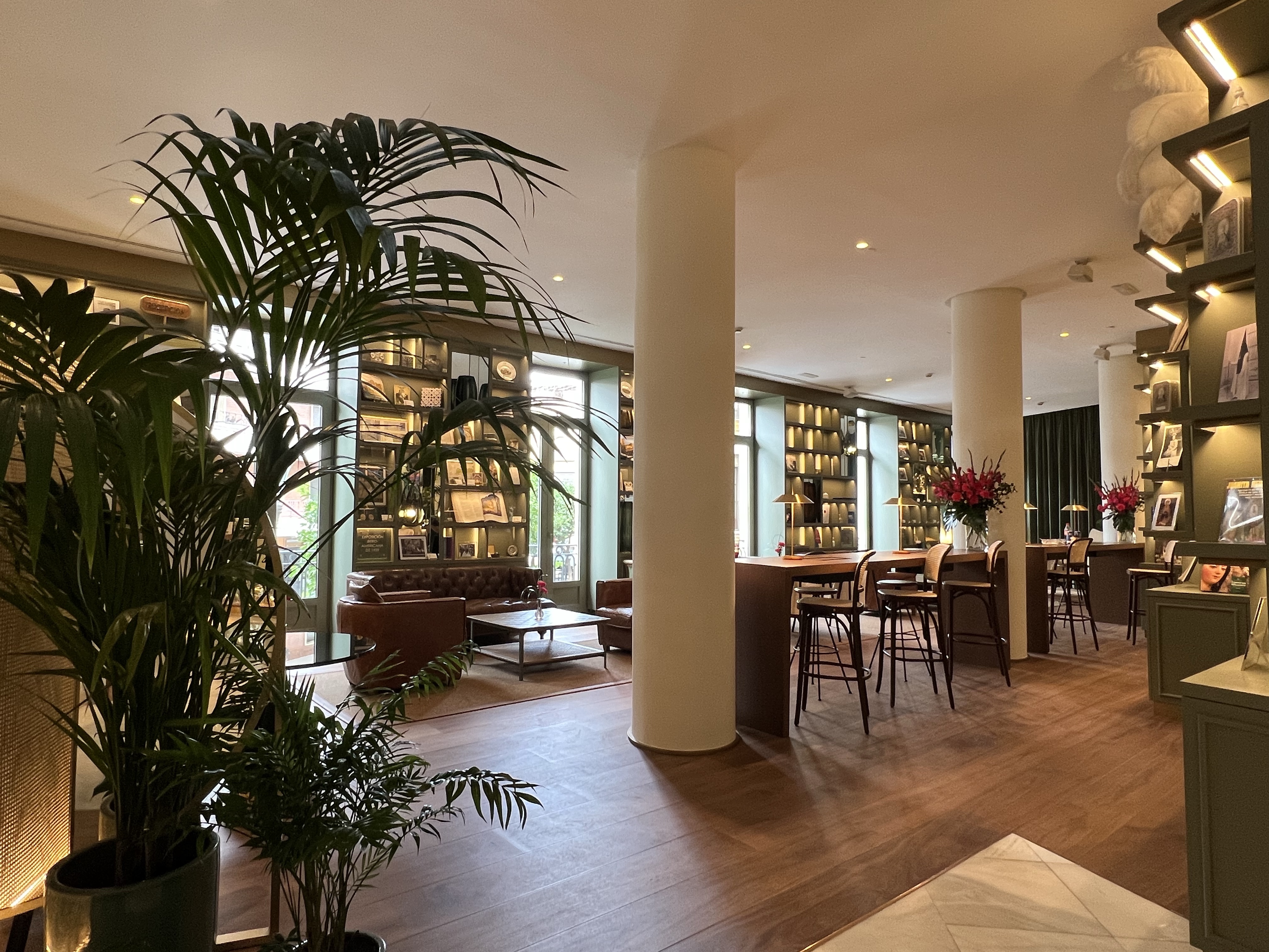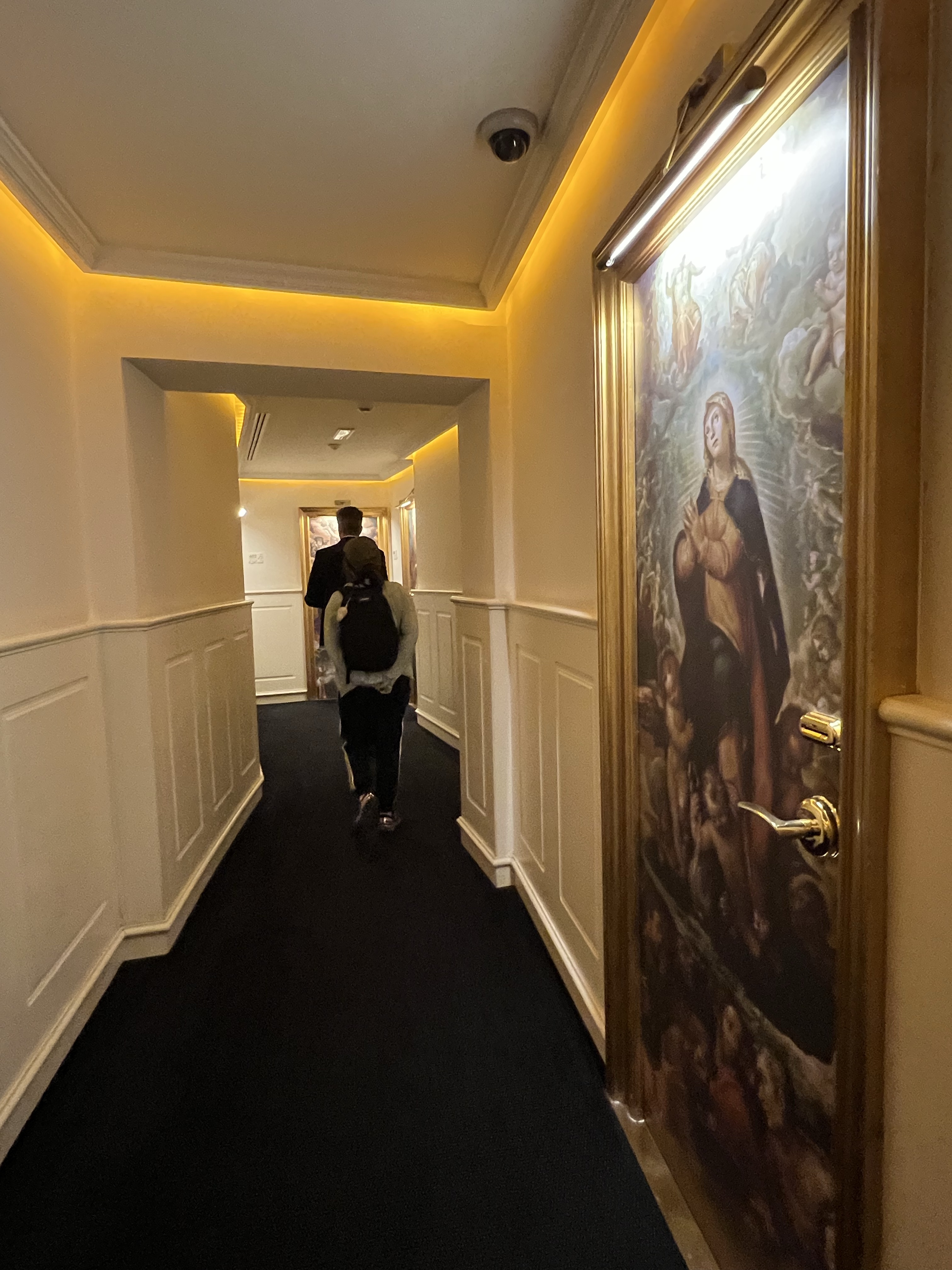 進到飯店門口,侍者拿了我們的超級重行李,領我們到報到櫃台前,櫃檯的接待小哥問我們是不是第一次來西班牙,我想了一下說不是,幾年前去過巴塞隆那,然後就沒有然後了。茹茹後來跟我說,她每次聽到這個問題都一定會說第一次來,這樣接待人員就可以照著基本接待流程講下去,就不會產生一些很難回應的分支話題,也同時可以獲得一些新手資訊等等。後來有另一位接待人員帶我們上樓,沿路還介紹了飯店內的各種藝術設計,還有每扇門上面的畫都是某某名家的作品等等,但其實我們兩個都超想直接進房間,只能禮貌性回應,還好他沒有講太久。