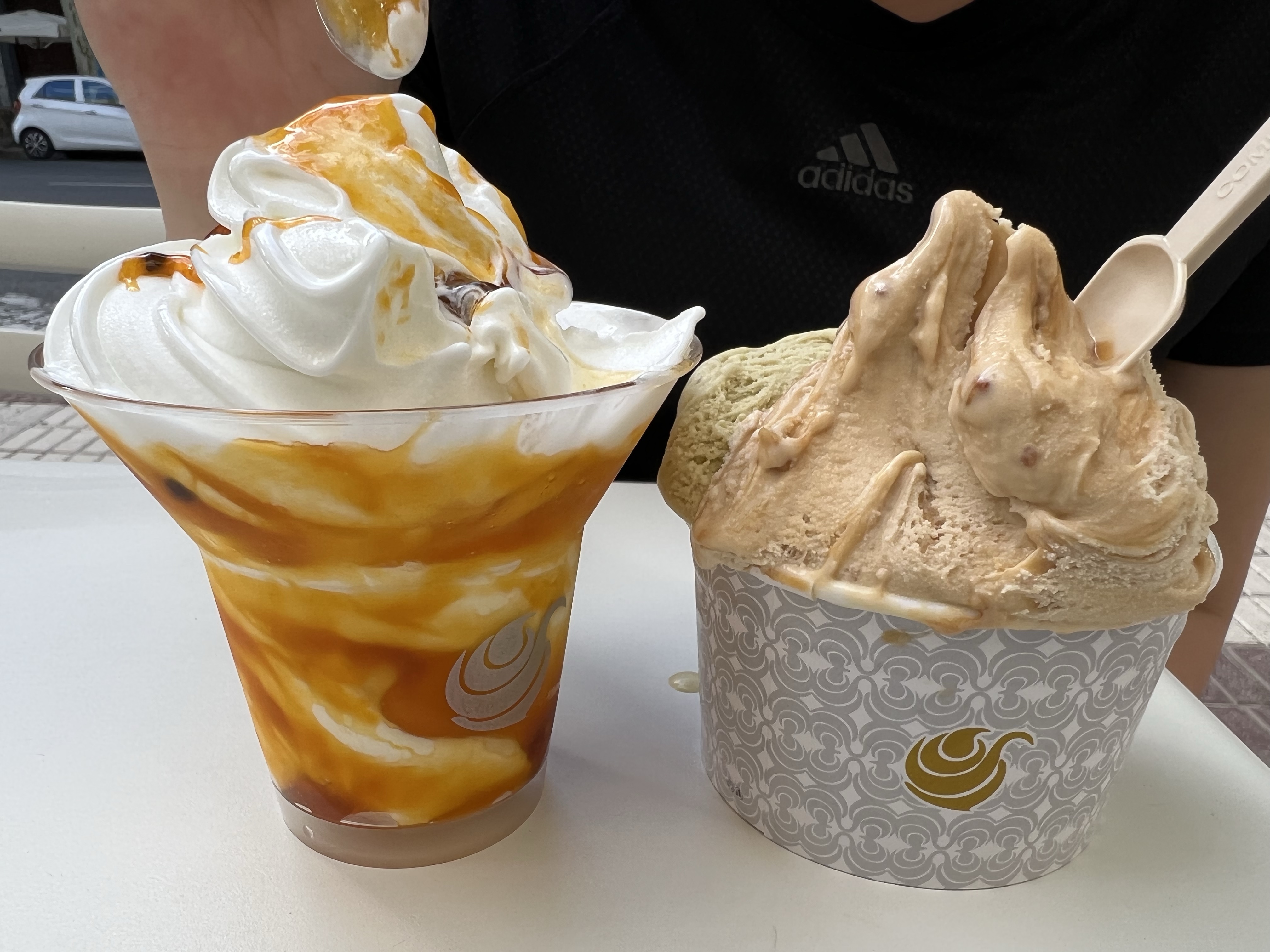在房間稍微休息到傍晚,往河邊的方向走去。路上經過之前在馬德里吃過的超好吃冰店,進去點了冰淇淋和frozen yogurt,冰淇淋還是一樣好吃,但優格被加了大量超甜的百香果糖漿,整個毀掉。吃到一半,旁邊馬路上有個人騎著機車過去,掉了一包東西在路上,他回頭把東西撿一撿,獨留半個法國麵包躺在馬路上就走了。我看著車子一台台經過,麵包被壓過了一兩次,最後決定趁機把麵包撿起來,待會沿路偷偷掉麵包屑餵鳥(不當言論)。