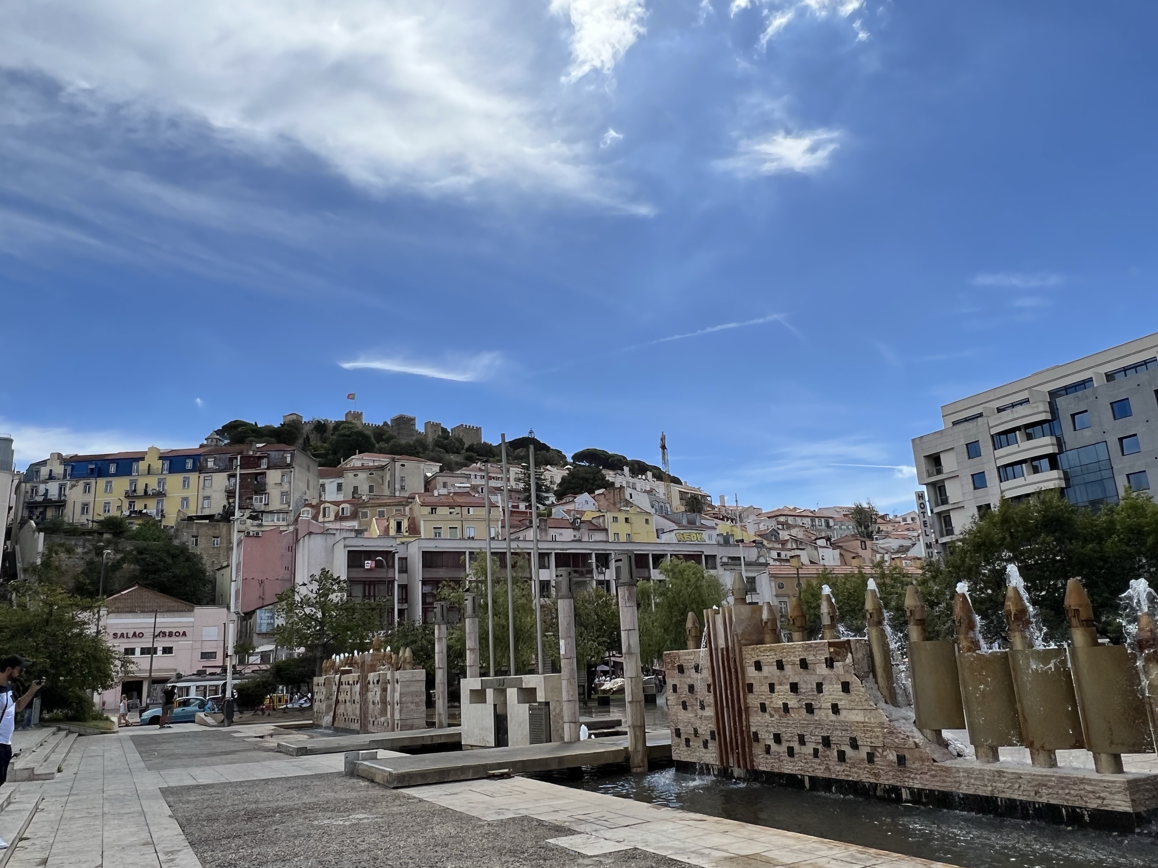 回旅館茹茹已經起床了,先讓她準備好出門,我又要回去洗衣店把衣服換去烘。這次就熟門熟路的上坡拿出衣服丟進去烘衣機,計個時就走了。經過底下廣場時發現另一邊的Alfama區丘陵上有很多五顏六色的房子,在更上面有一座城堡,中午的陽光映照下十分漂亮。