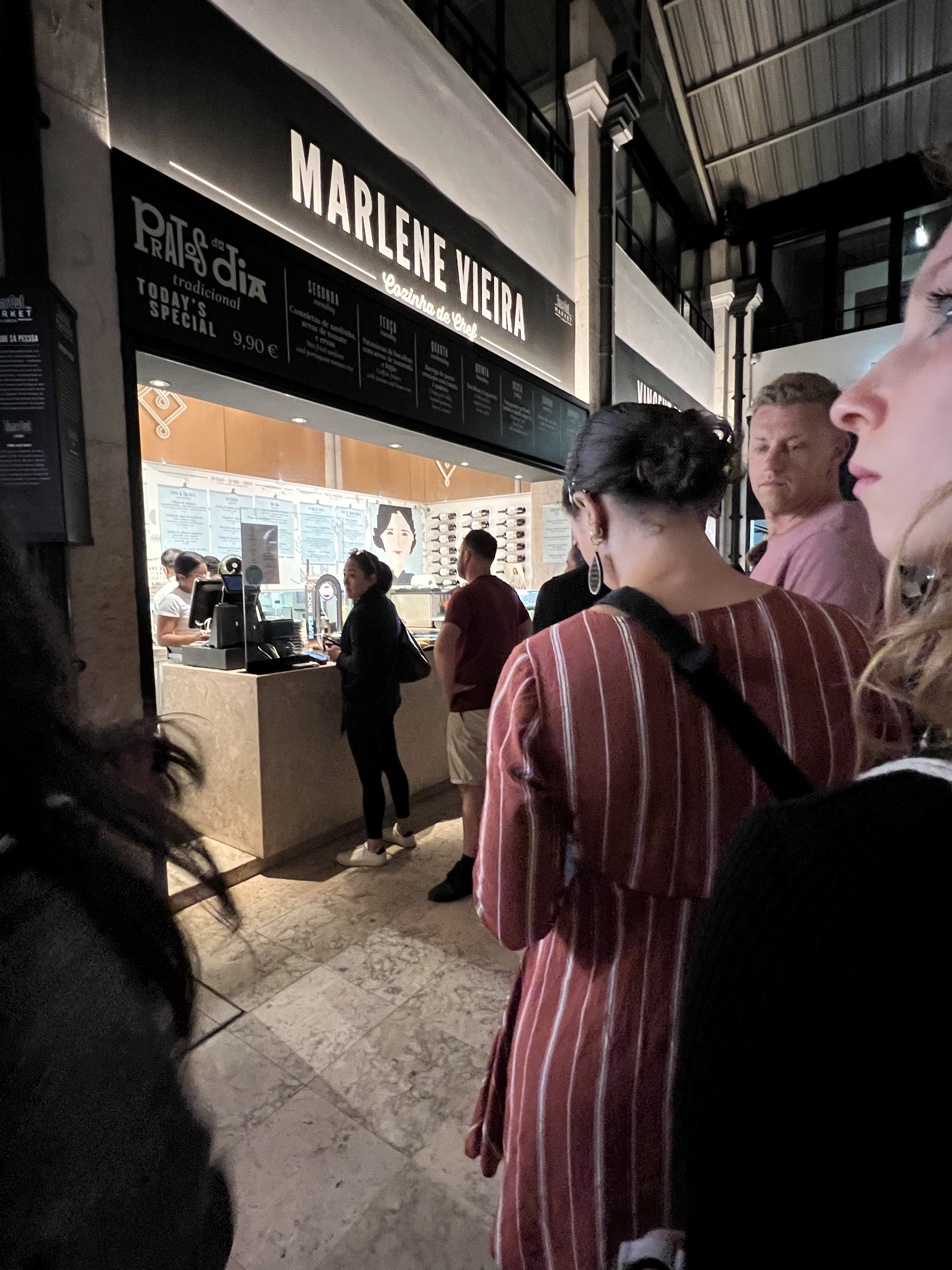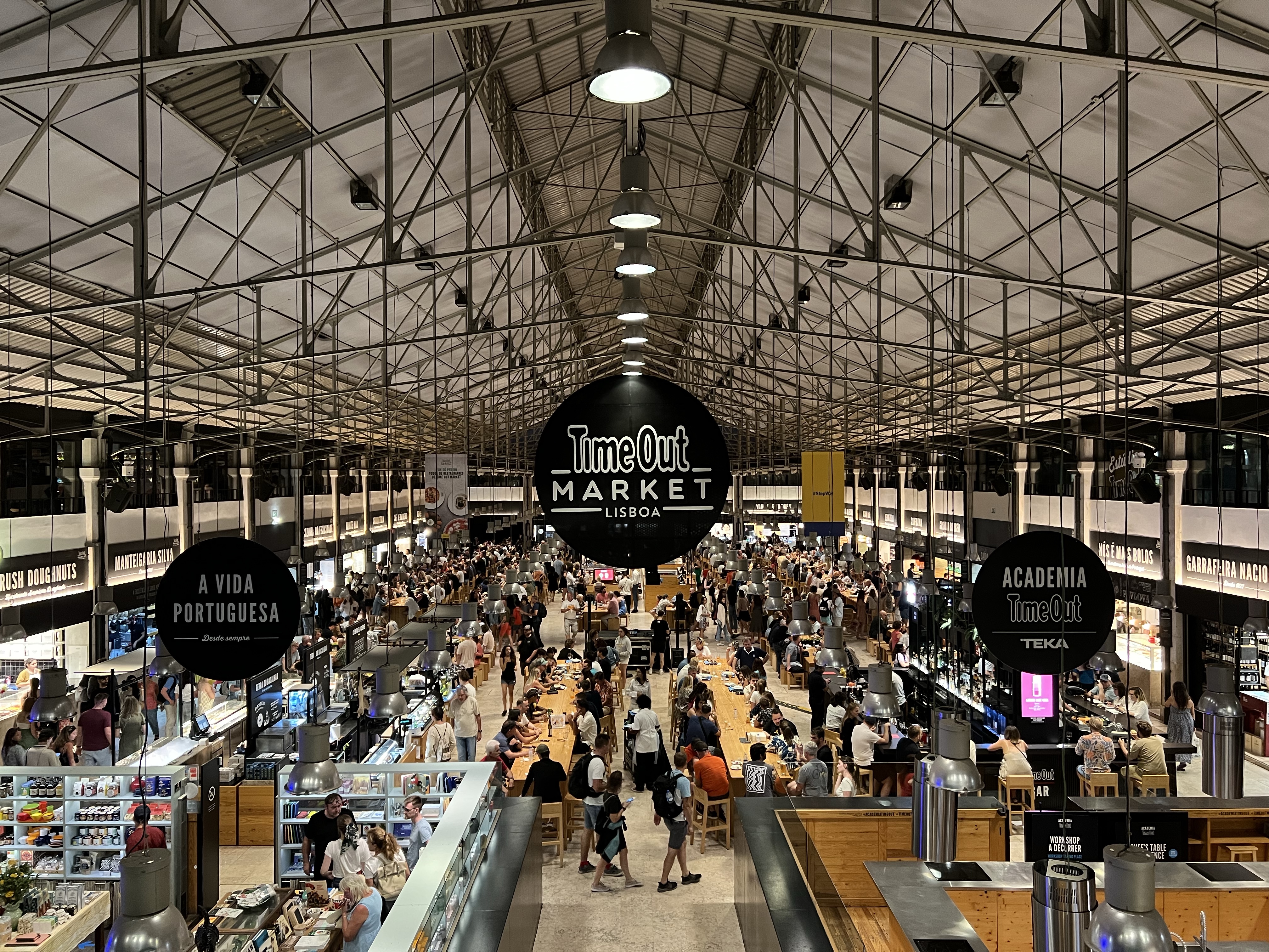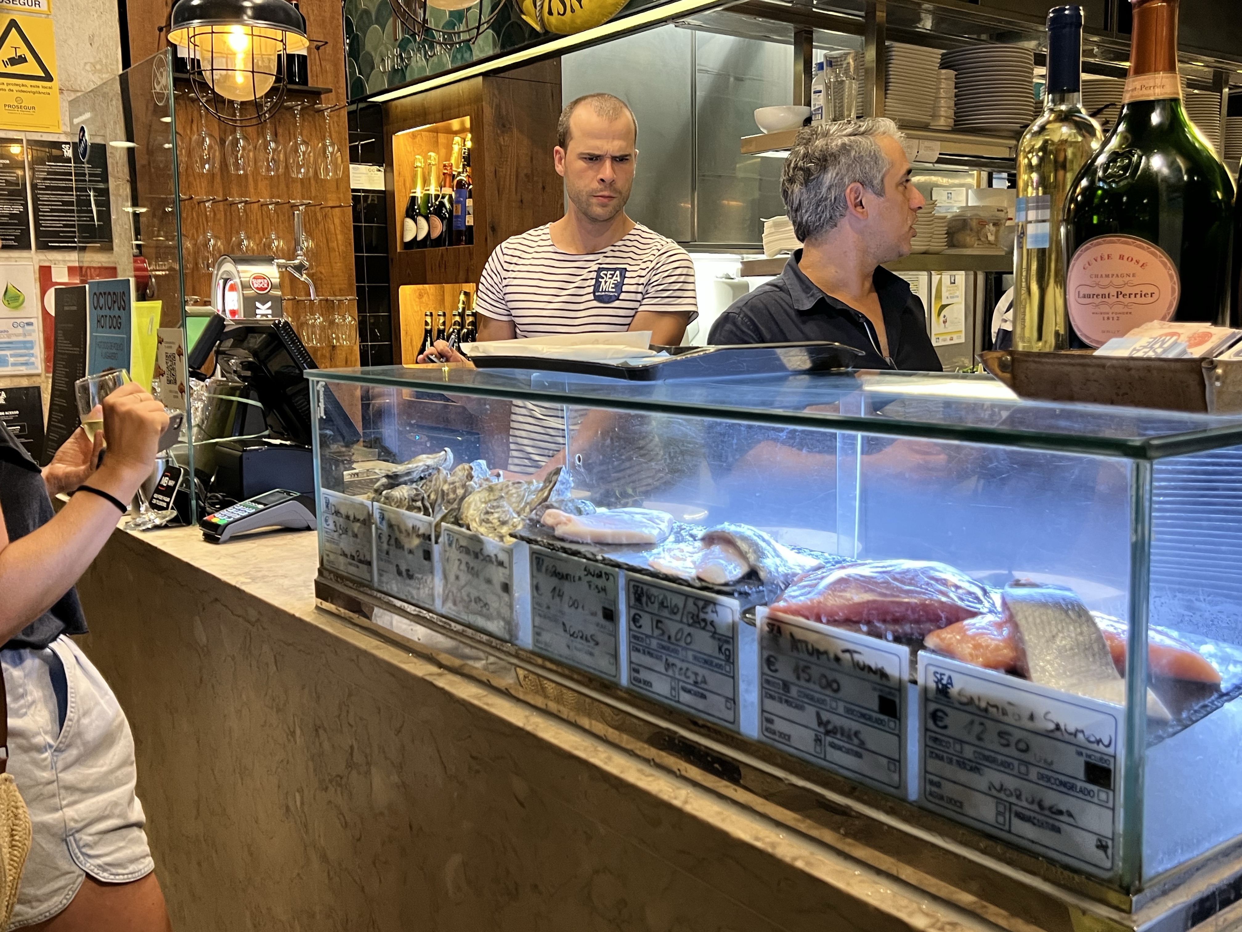 TimeOut美食廣場是一個類似上引水產的地方,外圍是生鮮市場,在我們到的時候已經通通關門了;中間美食廣場的部分則是人聲鼎沸,一整圈大概有五六十家以上的餐廳,有點像是百貨公司美食街,點完菜自己找中間的位子坐,等手上的發信器逼逼叫去領餐。餐廳的選擇也很多元,有當地的現烤海鮮、生切火腿、生蠔、tapas小點、壽司、pizza,我居然還看到刈包和魯三層肉!甜食的部分則有蛋撻、傳統糕點、冰淇淋名店等,中間還有賣調酒啤酒果汁等等的中島。