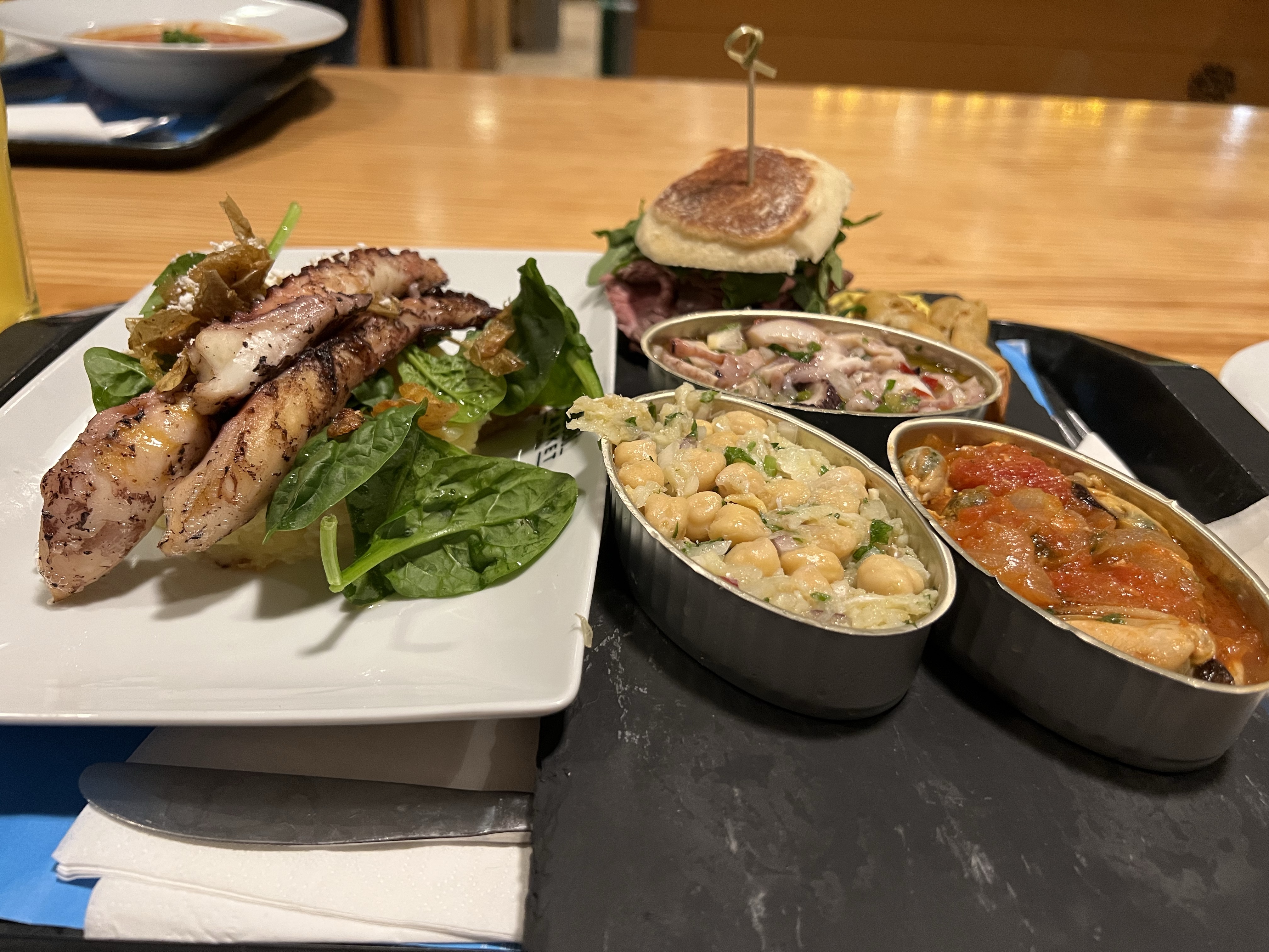 我們點了三個罐頭前菜配春捲炸蝦和牛肉小漢堡的主廚精選組合,和一份烤章魚腳配馬鈴薯泥。前菜分別是微酸的豆子、番茄淡菜、醃章魚腳,吃起來普普通通,只有番茄淡菜覺得不錯;春捲炸蝦就是蝦子外面包炸春捲皮,沒什麼記憶點;小漢堡的肉汁很多,麵包皮是微甜的瑪芬,蠻令人驚喜的。章魚則是不枉各家旅遊書推薦,充滿炭烤香氣但肉質十分柔軟,末端的部分則是富有嚼勁又極香!