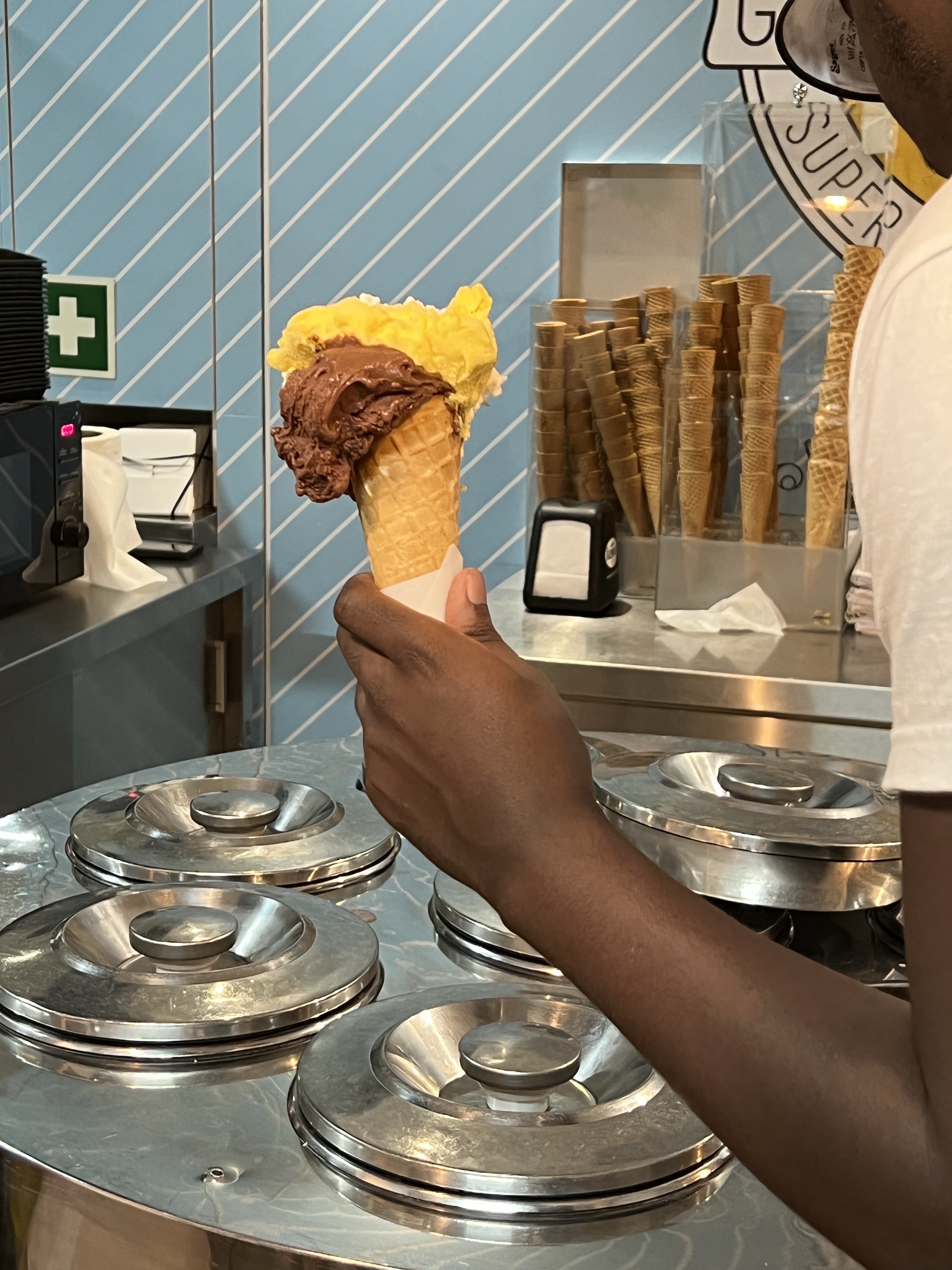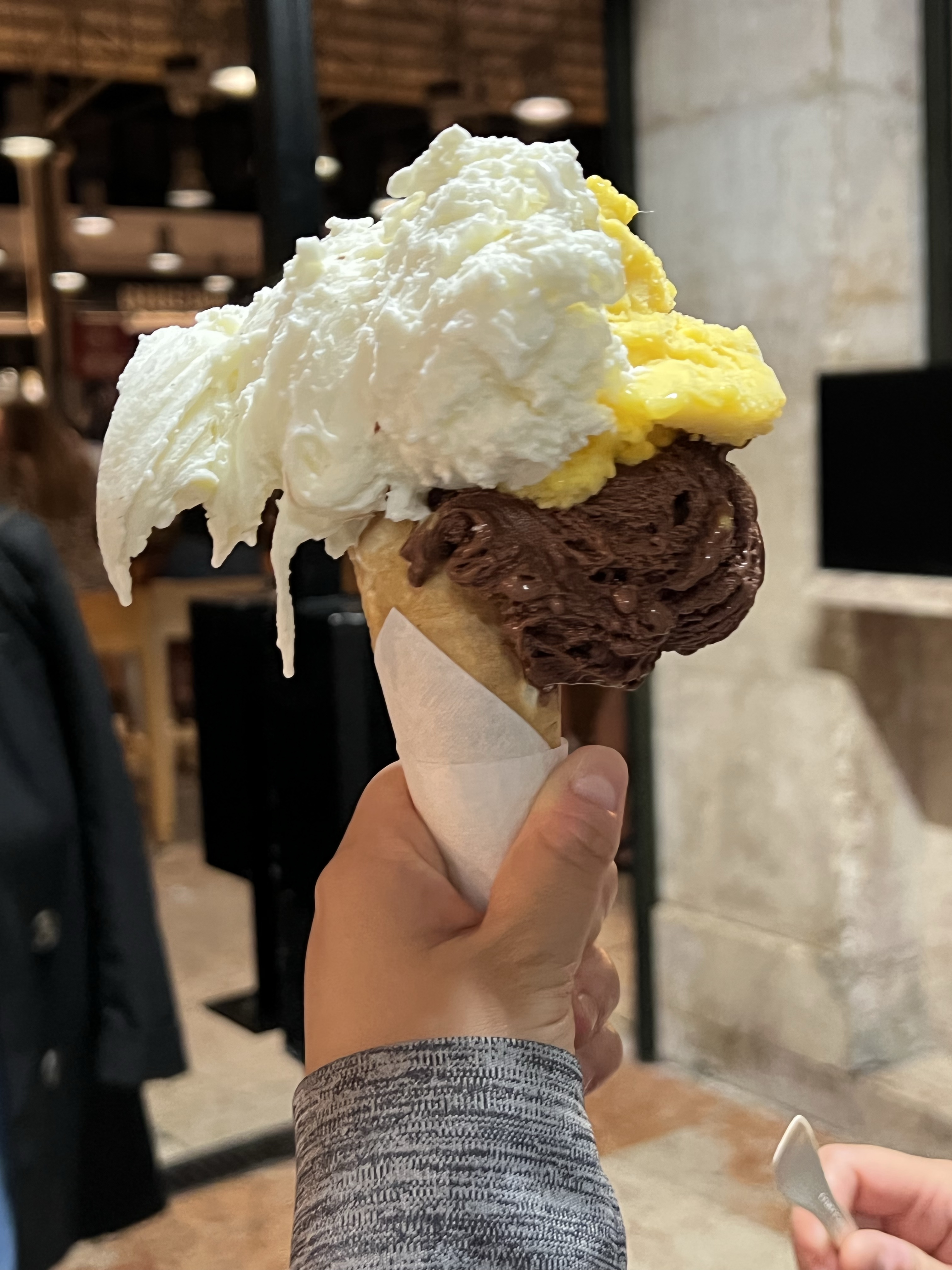 吃完飯就去買了冰淇淋,我們事後才知道這間是里斯本有名的冰淇淋店Davvero!選了甜筒裝四種口味,巧克力、椰子、芒果和香草,看他裝到第二球就覺得根本放不下了,沒想到他繼續把第三和第四球黏上去,拿給我們的瞬間幾乎都快要掉下來了!但真不愧是好的冰淇淋,儘管黏度很高(因為從頭到尾都沒真的掉下來),吃起來卻仍然入口即化,口味上則是水果口味特別出色,椰子還帶了一點椰肉,十分爽口。