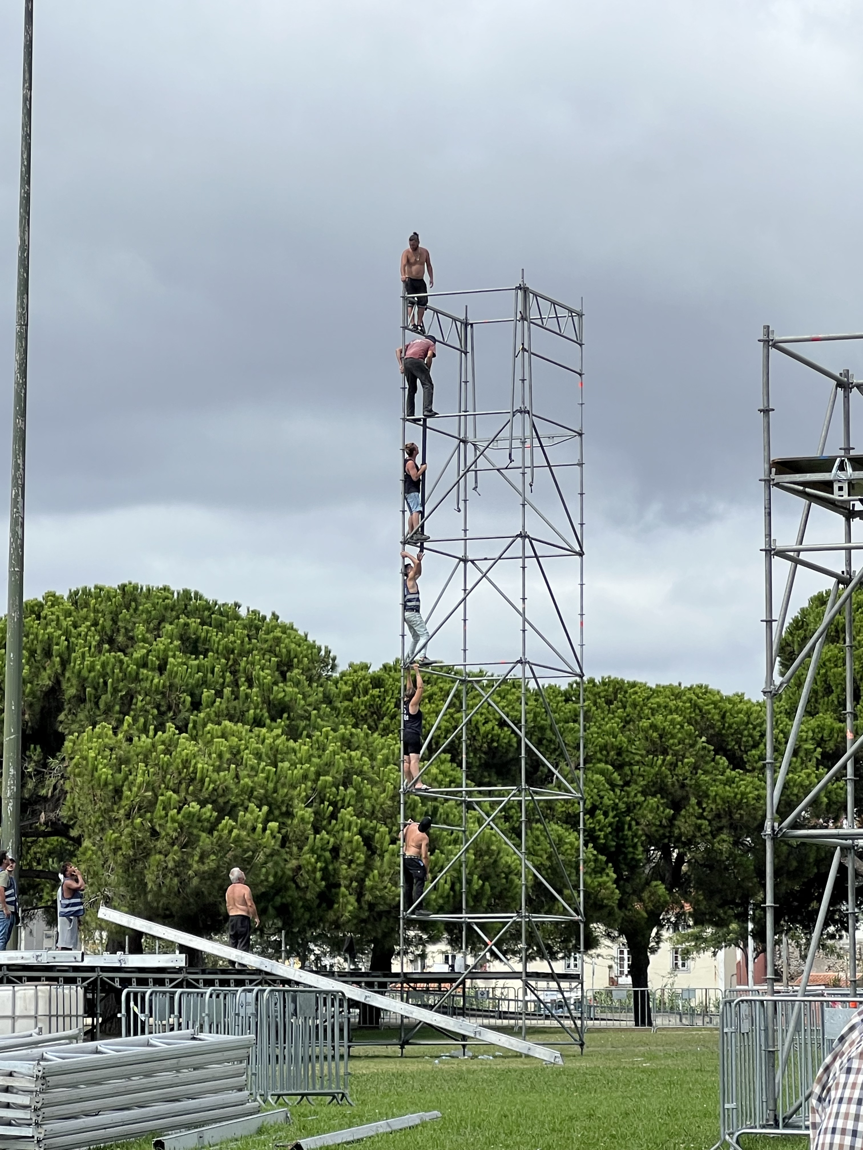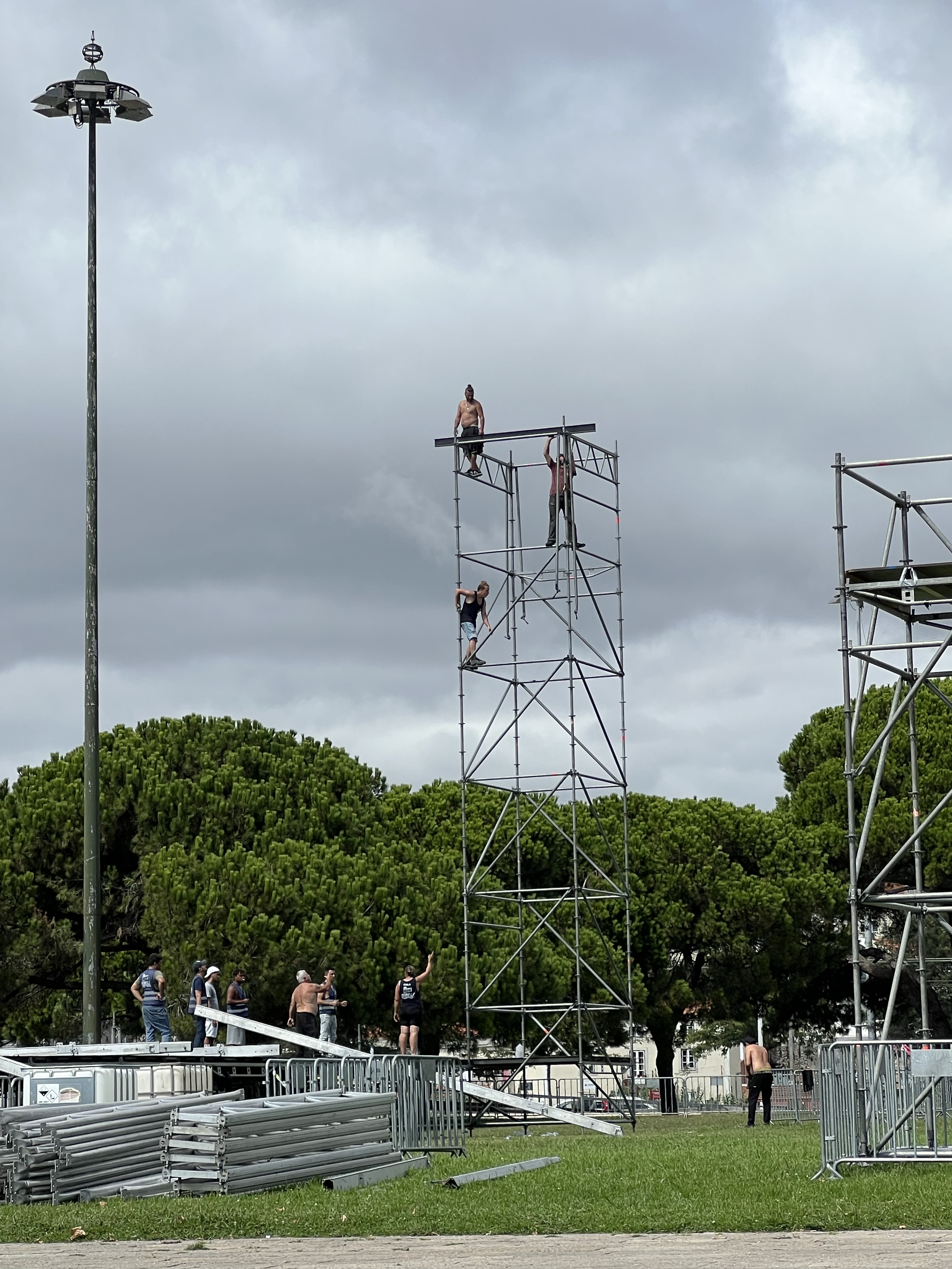 近看貝倫塔反而讓我們覺得有點小,就是個離岸一點點的碉堡,外型倒是蠻精緻的。貝倫塔跟岸邊還有木棧道連接,很多買票要入內參觀的人在排隊,但我們只對外觀有興趣,在各個角度拍了美照就算完事了。最酷的反而是旁邊有一群人正在拆舞台的鷹架,大概六層樓高的鋼架,一人站一層,完全無防護,由站最上面的人(站在六層樓高的鋼管上)拆下鋼管,一個接一個往下傳,真是有夠勞力密集的。