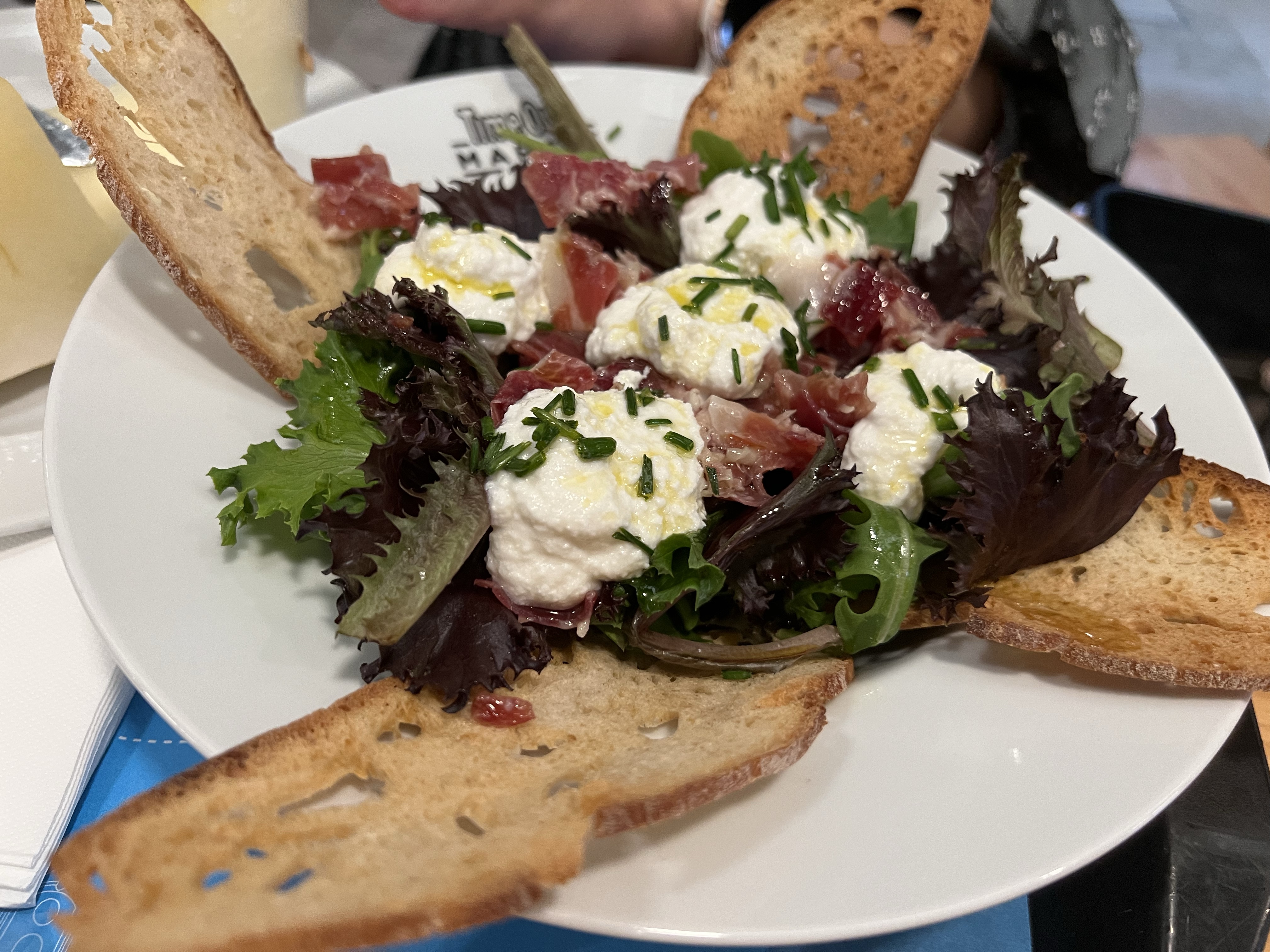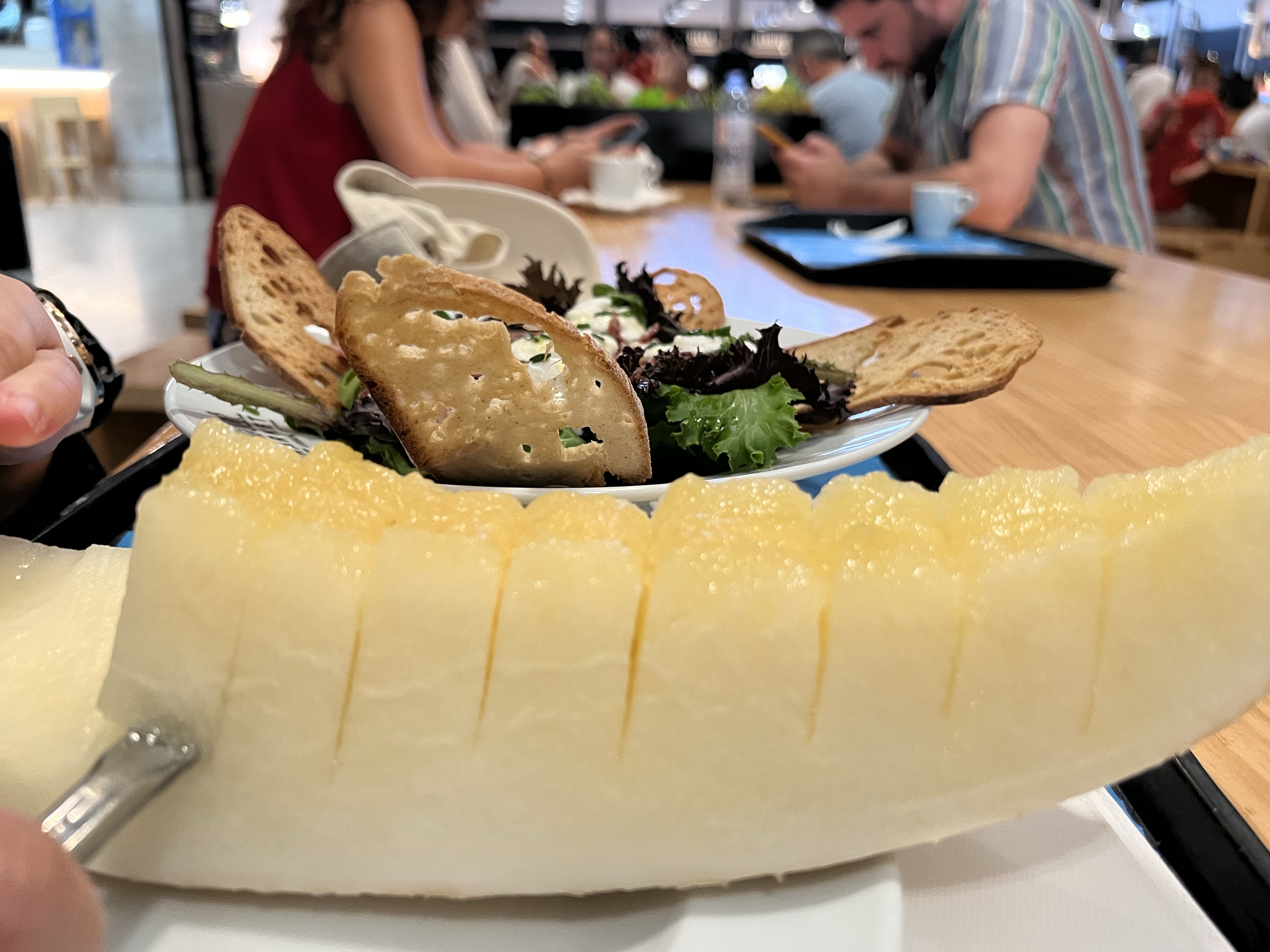 茹茹還在專賣火腿和起司的店買了一份沙拉,上面有碎火腿和比較軟的mozzarella起司,還點了一片2.5歐的香瓜,原本想說香瓜一片很貴,吃下去驚為天人,真的是高級香瓜,貴是貴了點,但神美味!我另外去甜點店買了兩種傳統甜點,跟香瓜比起來竟完全失色了。