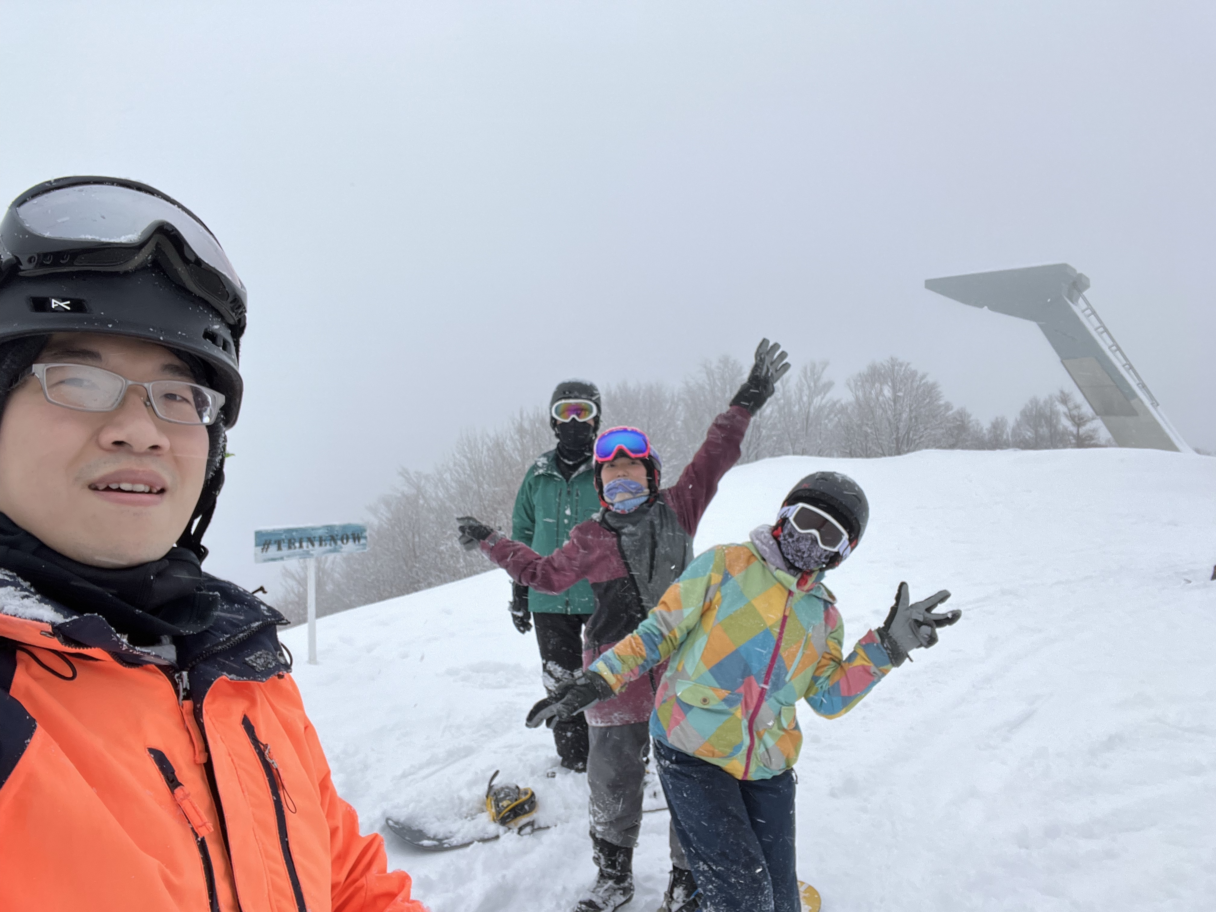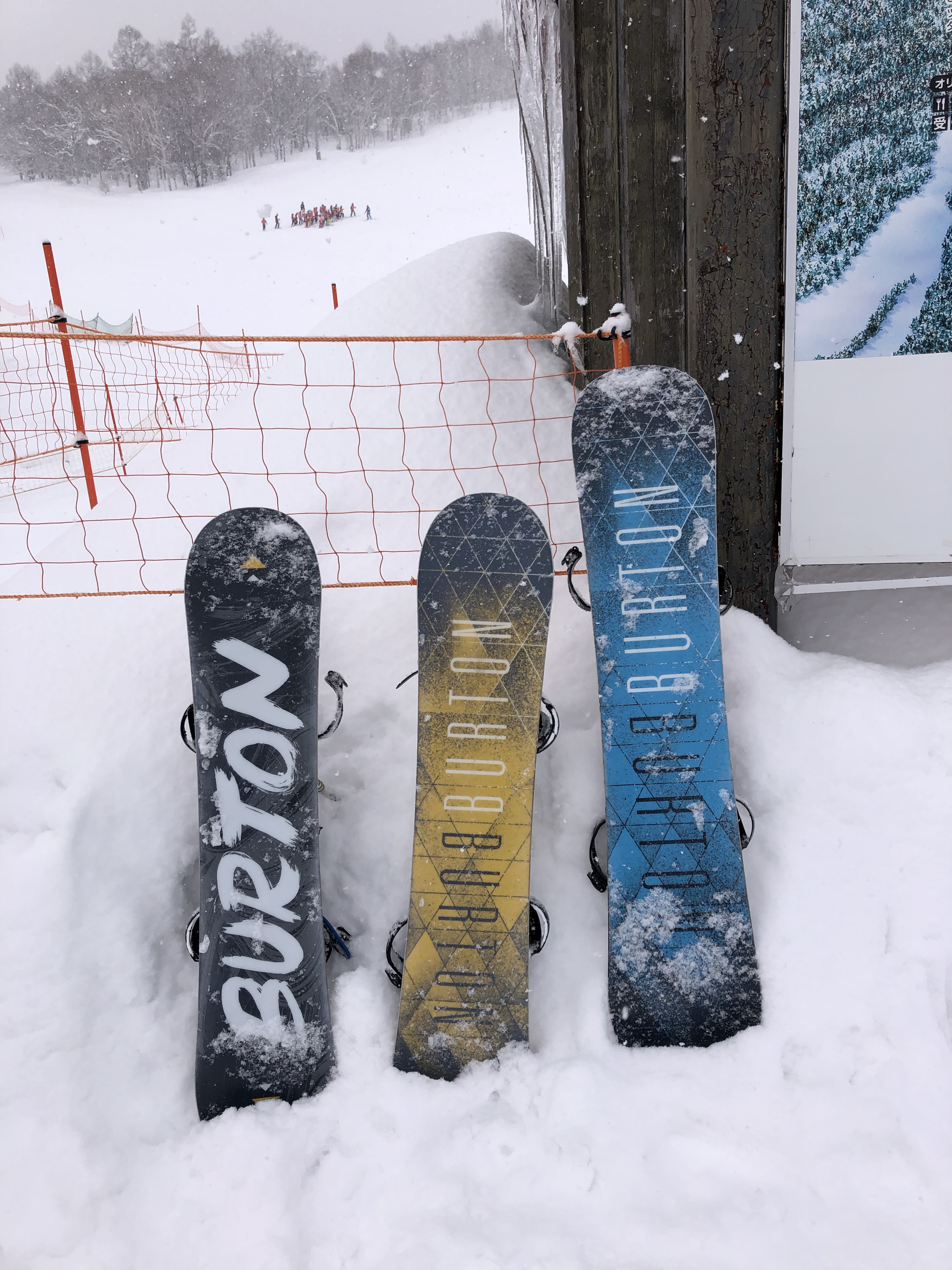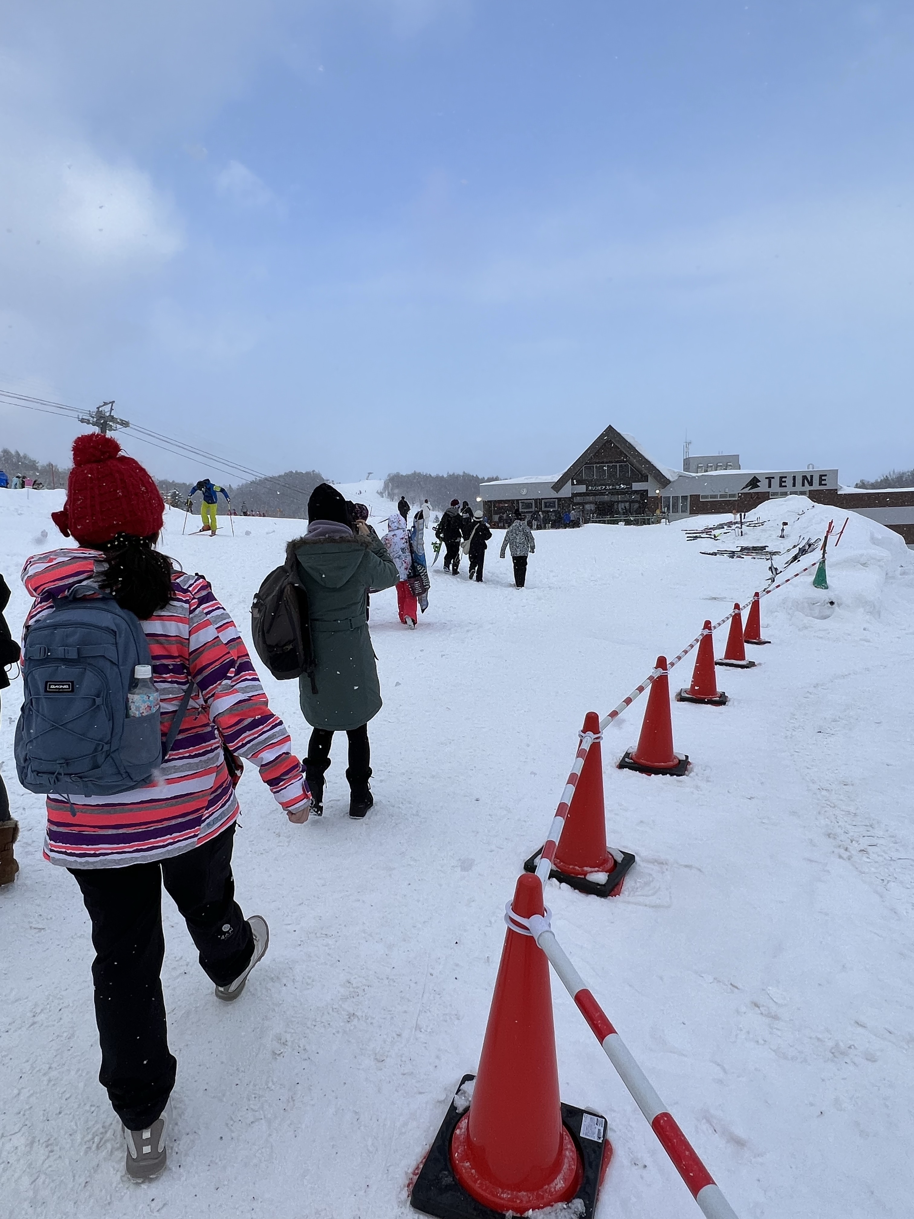 手稻滑雪場分為上下兩個區塊,上面叫做High land,是五十年前辦過冬奧的場地,高階的紅線跟黑線都在上面;下面是Olympia center,大多數是寬廣的綠線,還有輸送帶型的初級練習區;最下面還有一個需要搭接駁車才能到達的兒童樂園。我們事先線上預約了Olympia center的單板裝備+衣物的套裝,現場只要掃QR code就能直接排隊領裝備,但沒想到居然沒有包括頭盔!只好馬上加錢租頭盔!雪板都是Burton的高級板子,雪衣雪褲倒是良莠不齊、大小也差距很大。