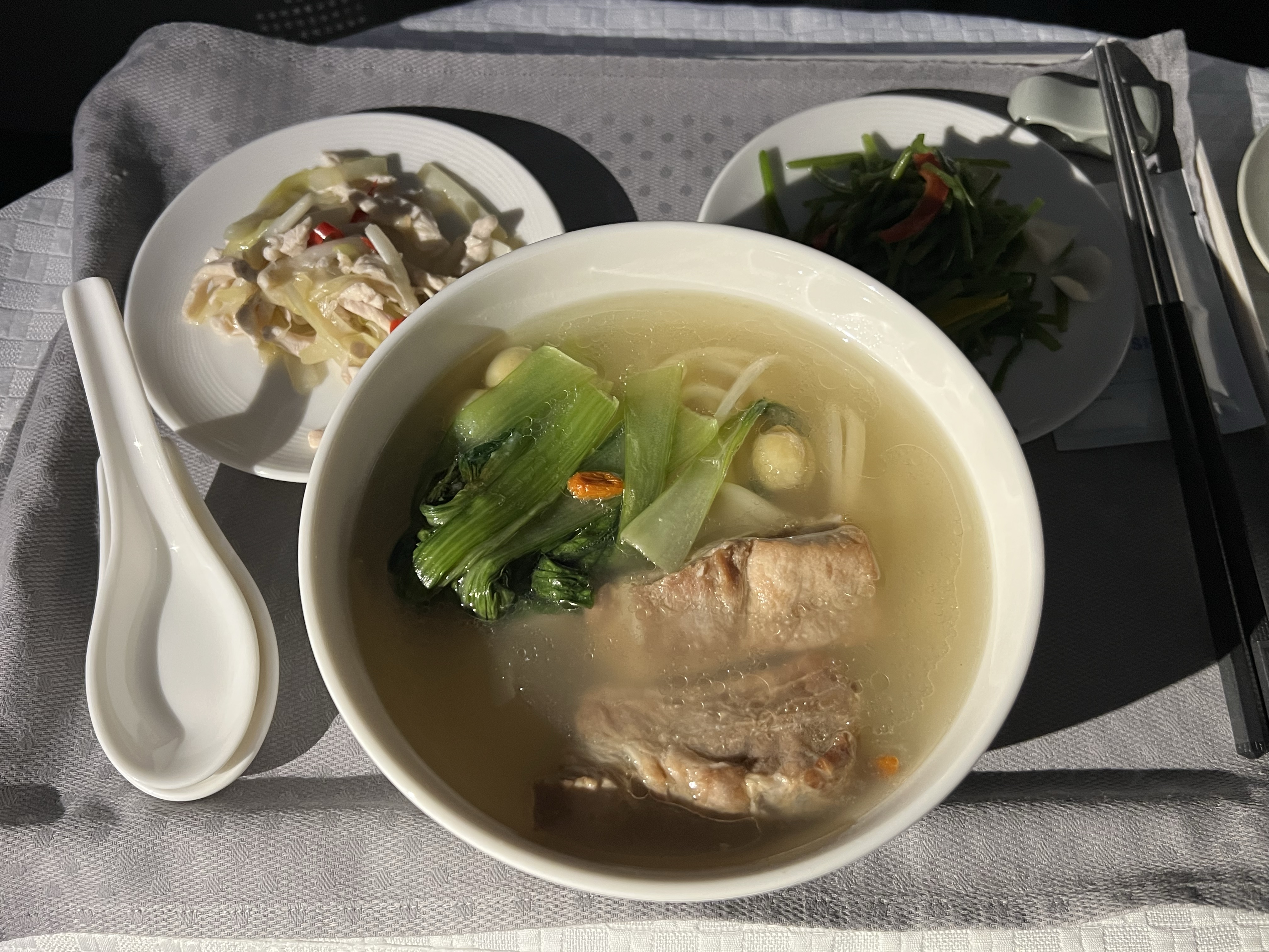 早餐吃了沒吃過的蓮子排骨麵,熱湯蓮子和排骨都夠水準,只有麵快爛了,還好我不太介意。另外有兩盤小菜是肉末筍絲和炒水蓮,都很好吃,只可惜實在有點冰涼。距離降落還有兩個小時,把之前拖很久沒追完的動畫看一看就差不多時間了。