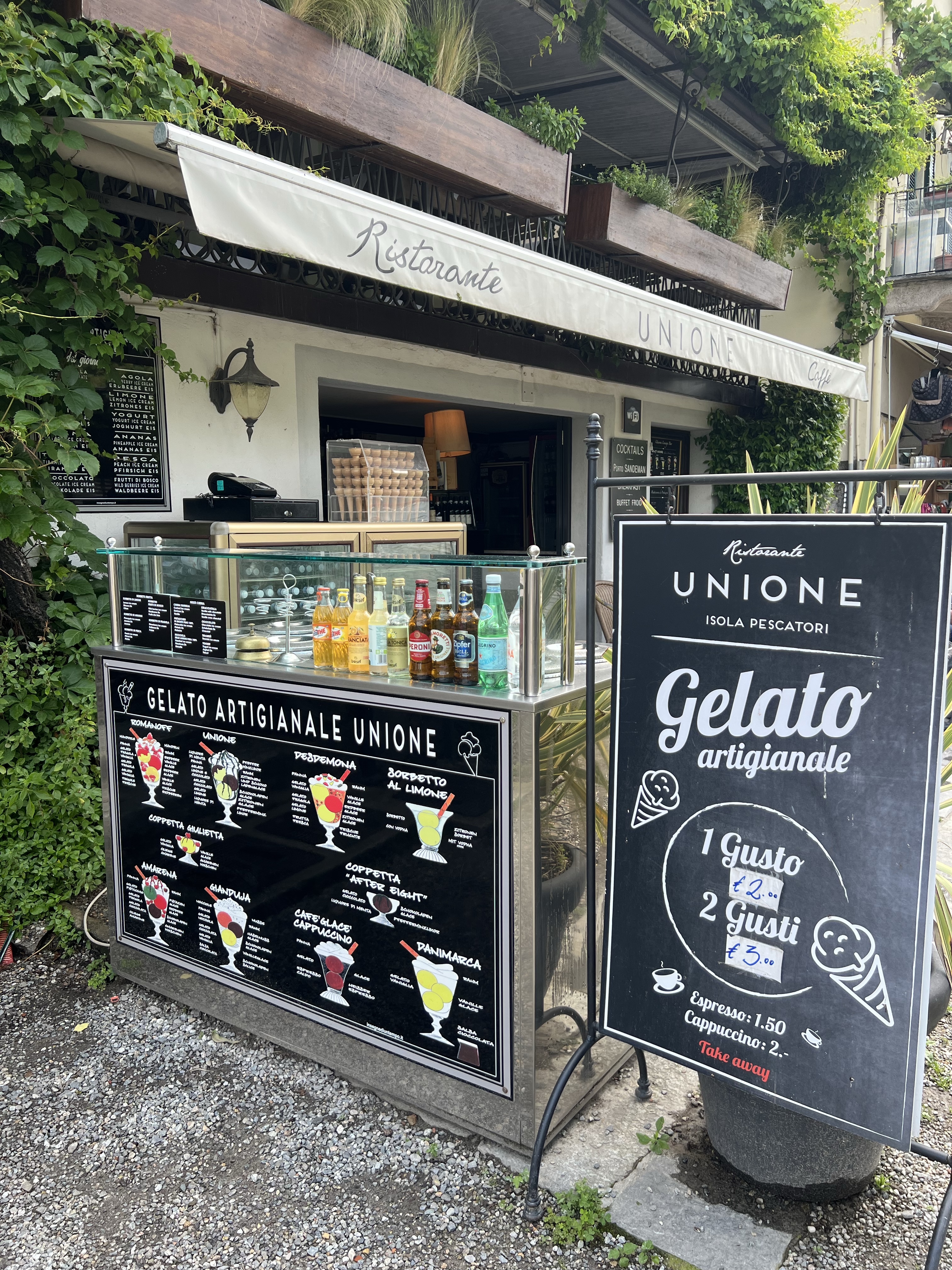 走回碼頭邊等了十分鐘,搭上往下一個島的船。下一座島比較有名氣,名叫Isola Bella,美麗之島的意思,島上有個小宮殿和階梯式的花園,聽說裡面還有養孔雀。但沒想到我們一上島就遇上超多遊客,要進去花園得排很長的隊,而且入場費一個人要20歐!乾脆就不進去了,在外面走走小巷爬上爬下,但遊客實在比上一個島多太多,走起來沒什麼品質,草草看看就回碼頭邊等搭船了。碼頭旁的小廣場臨著湖岸圍著一圈矮牆,上面有一個個甕造型的裝飾,還有神秘的四角錐,感覺是進行神秘儀式的地點。