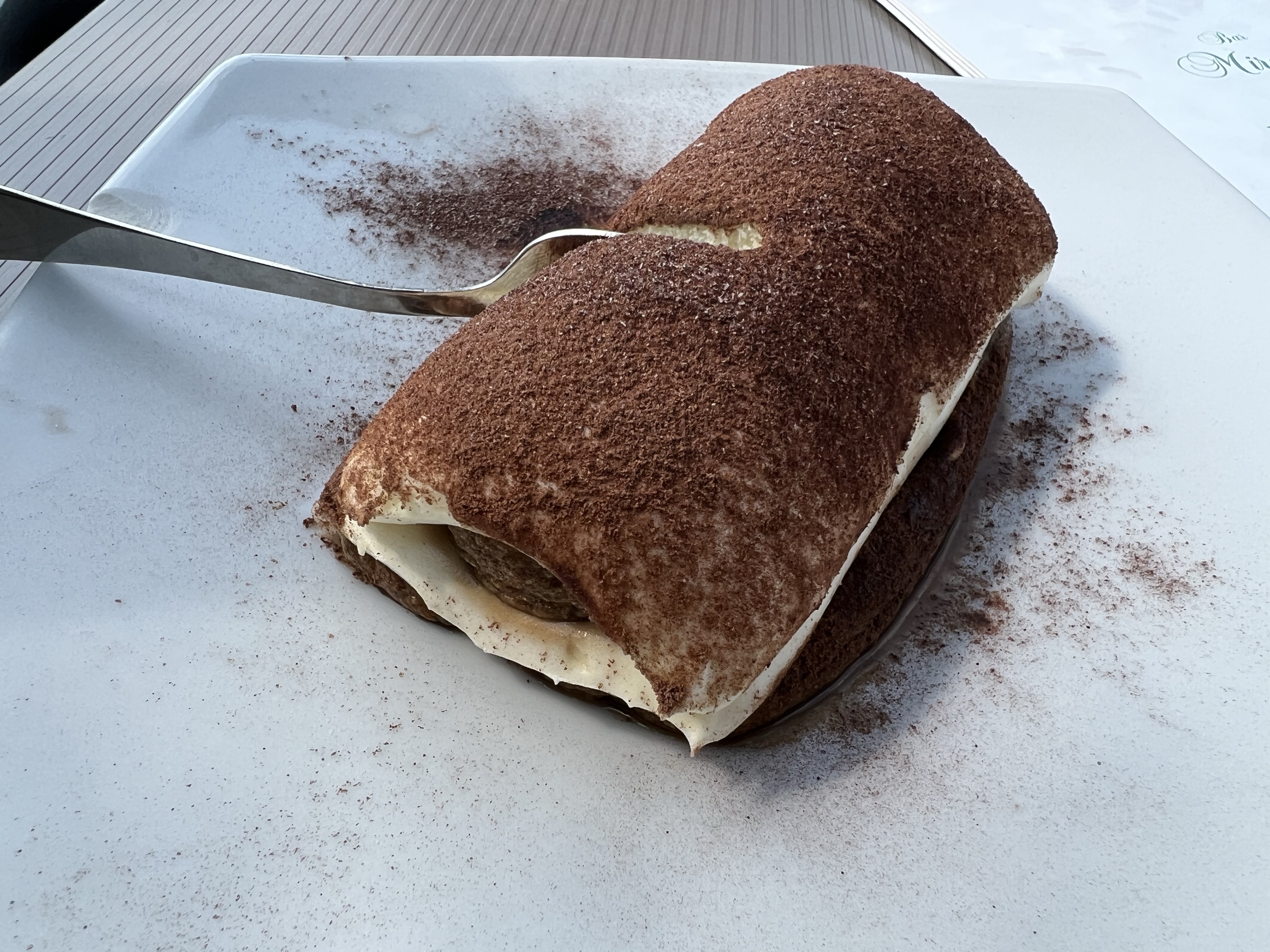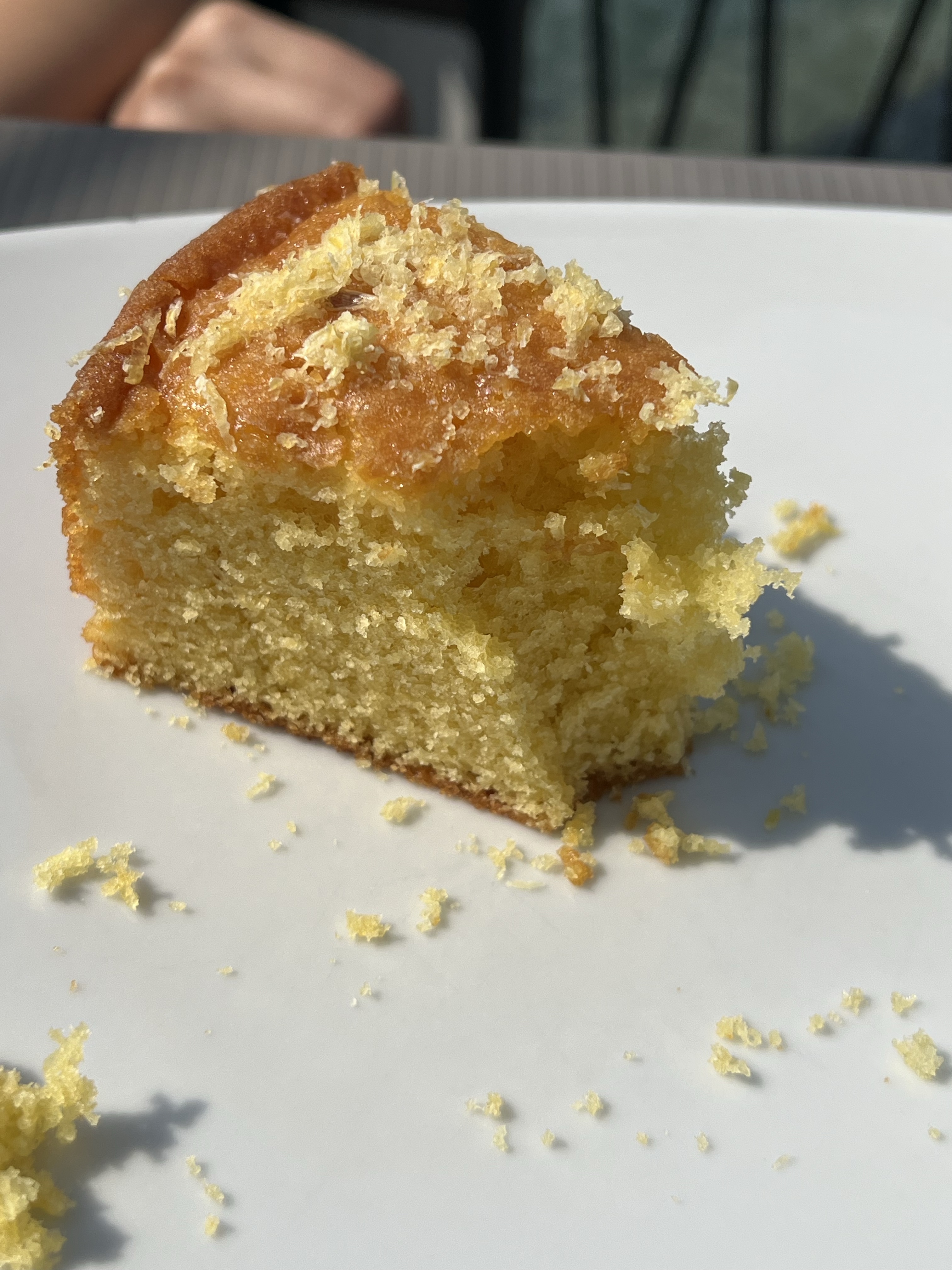 在我們吃得差不多、分別去廁所的時候,有隻麻雀看我們剩下一小塊檸檬蛋糕,覬覦已久,直接飛來桌邊撲著翅膀;看我們沒有動作,索性直接啃起蛋糕,吃了滿嘴。為了不傷害他,只好趕緊把最後一塊送進嘴裡,才讓他悻悻離去。