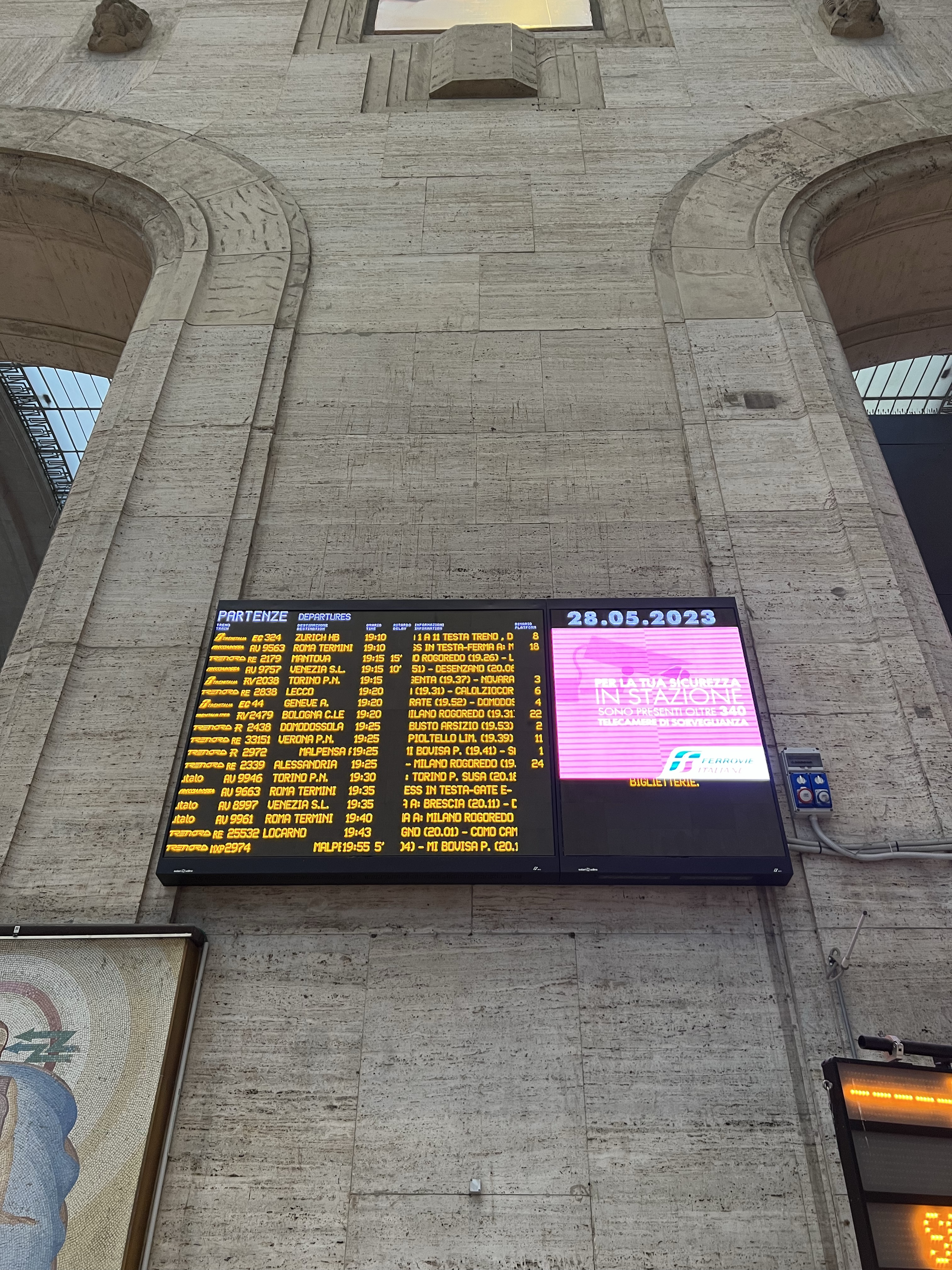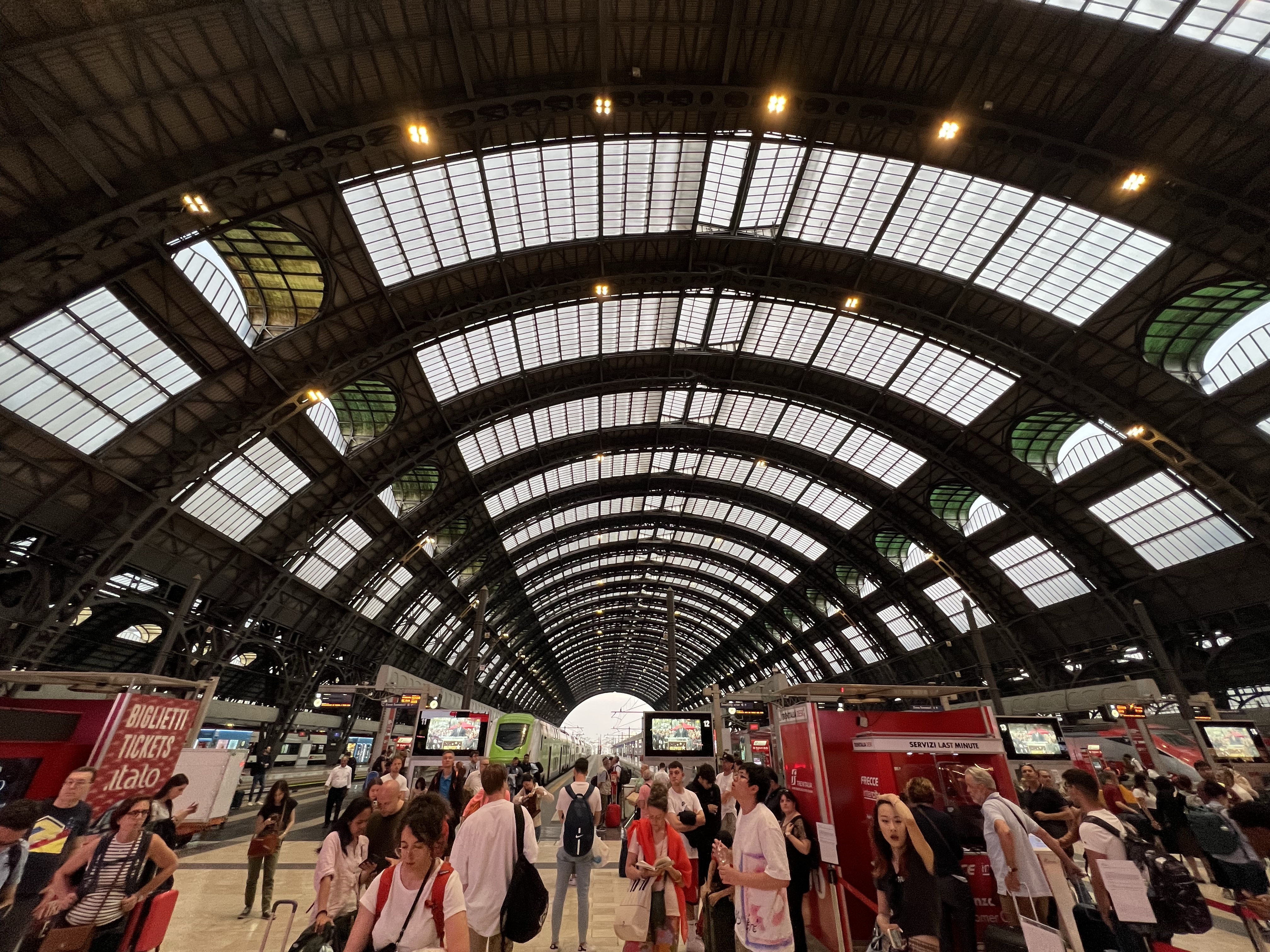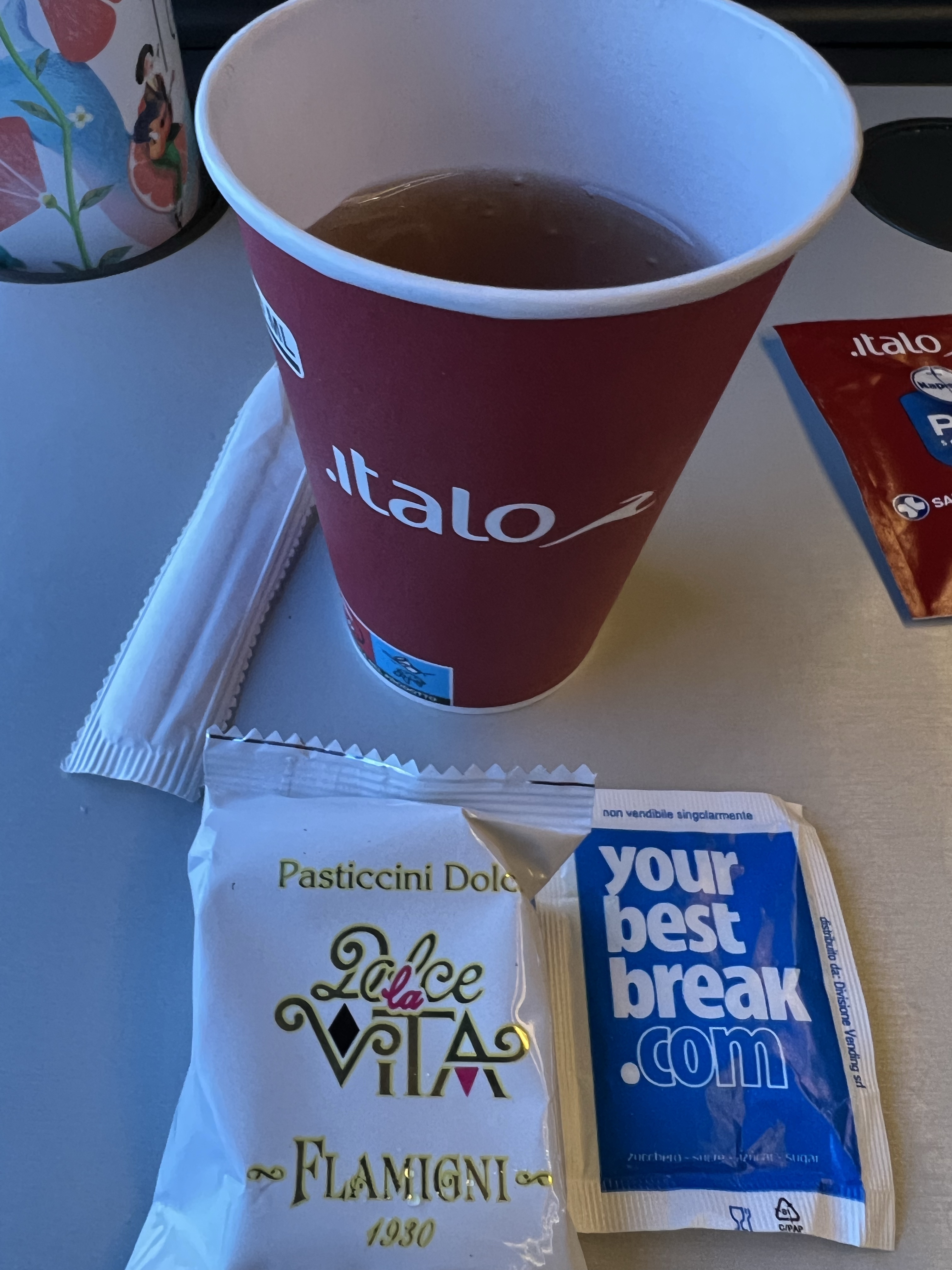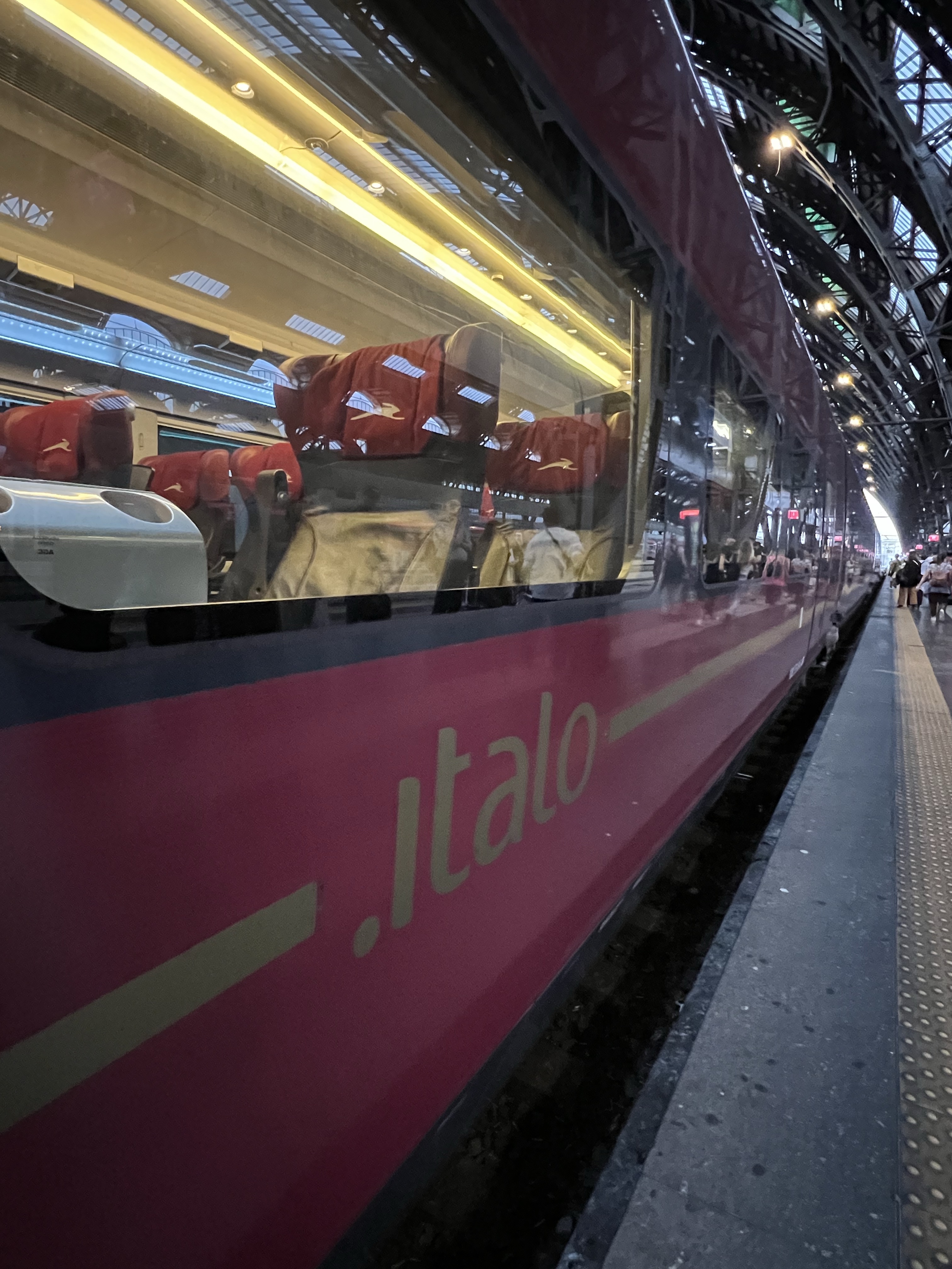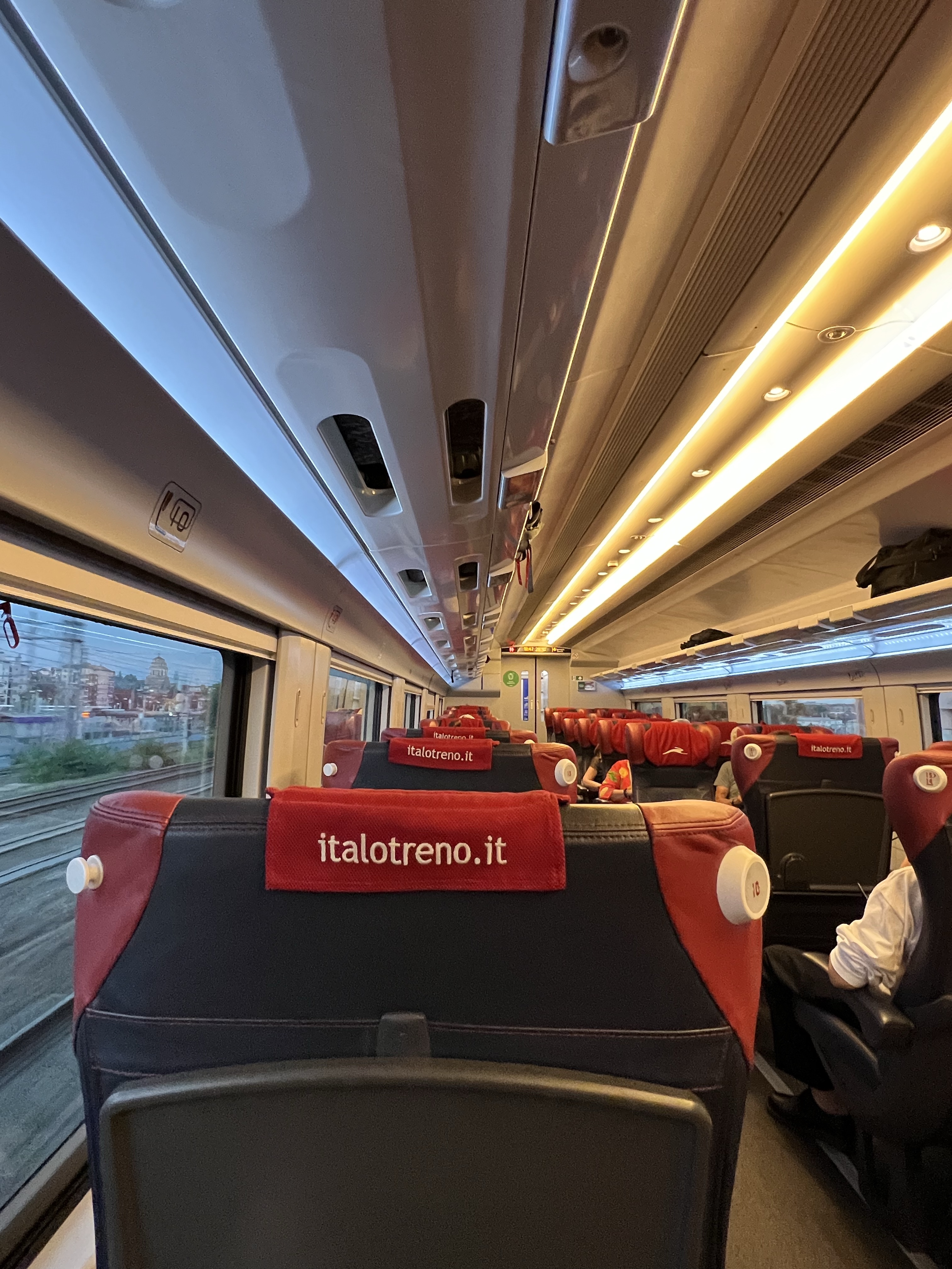 義大利的長程高鐵主要由義大利國鐵Trenitalia和另一家Italotreno經營,這次定了Italotreno的車,一個人基本價是40歐左右,但升級到比較高級的Prima車廂也才多5歐,有鑑於上次在西班牙搭車的擁擠經驗,加上我們需要放大行李,當然就加價升級了。車子開到一半會有服務人員給飲料和點心,但我說我要咖啡拿到熱茶,茹茹也要了咖啡但拿到可樂,看起來是個隨機過程。我把大行李放在門邊的置物櫃,但上面的防盜鋼索不夠長,只好每次有人上下車就轉頭瞄一眼,不過玩了一天實在超累,當作提神活動也不錯,免得一不小心坐過站就到羅馬了。