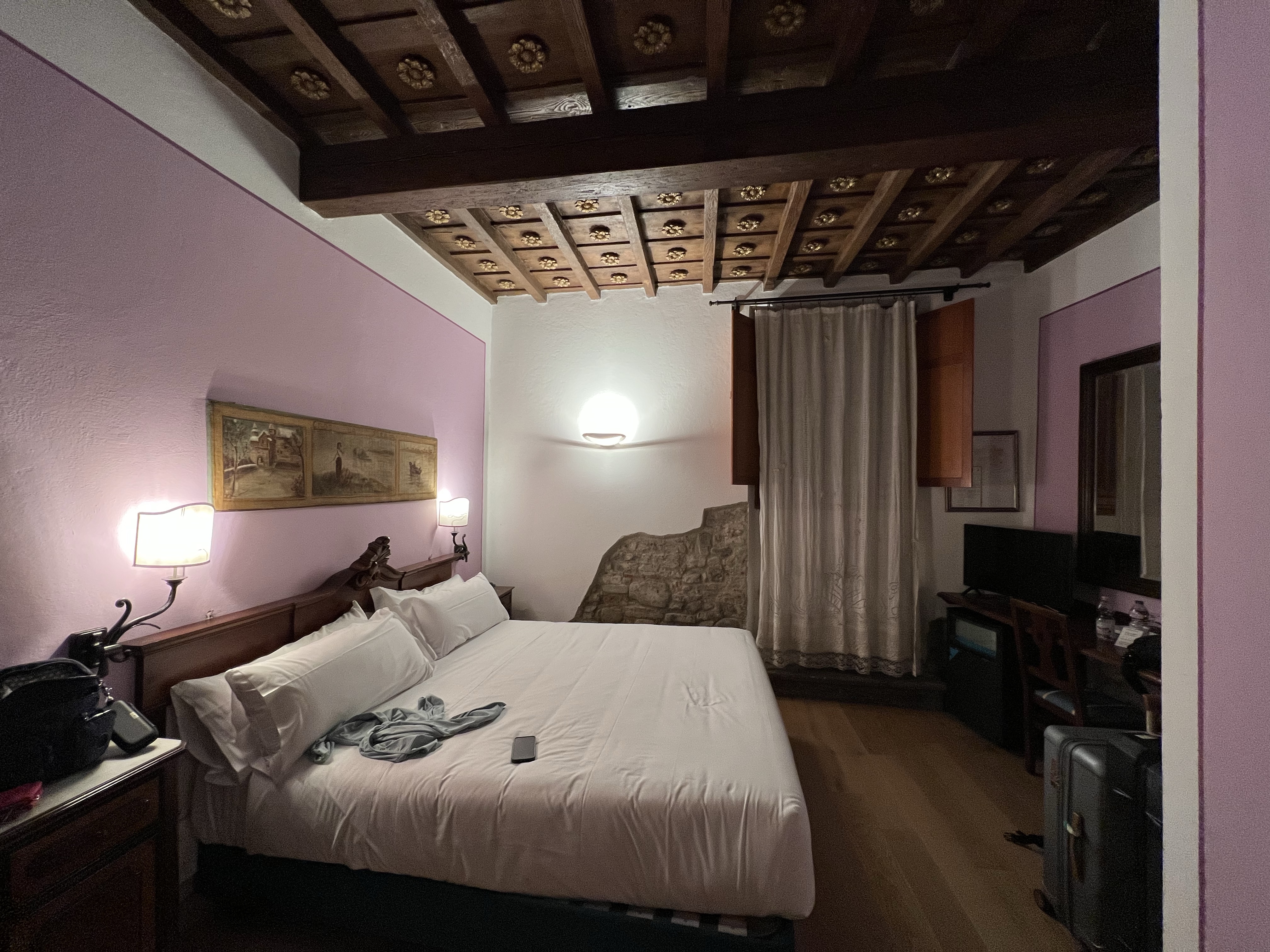 走了12分鐘抵達旅館II Guelfo Bianco,櫃檯的高高義大利人十分親切,幫我們安排了一樓的房間,但可惜沒辦法要到兩張單人床。房內空調超冷,就算在控制面板選了Off,還是有風在吹,只得趕緊沖熱水澡後窩進被窩裡,累死了一下就睡著。明天要去聖母百花教堂爬一堆樓梯!