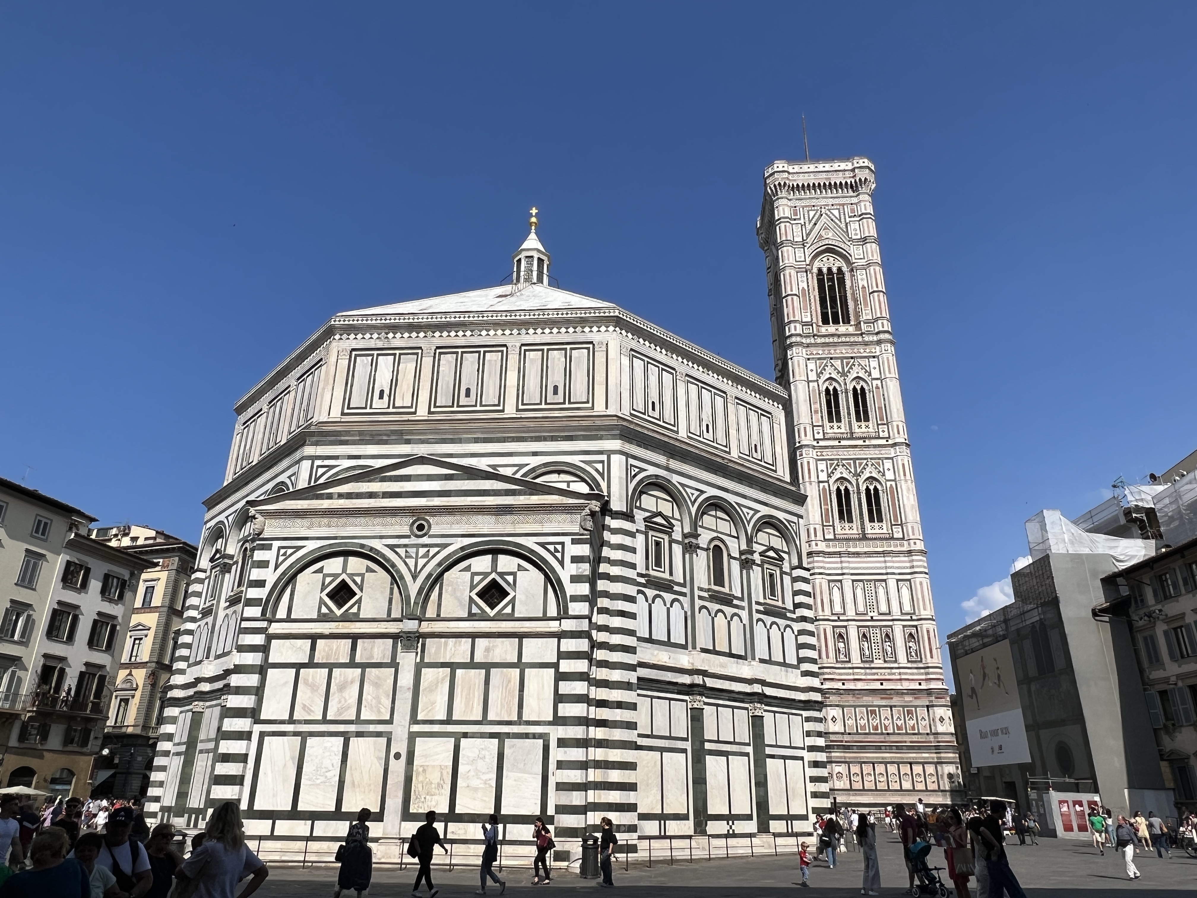 但其實我最期待的反而是旁邊的喬托鐘樓!長方柱體的外觀,以偏紅的大理石作為基色,為了抵銷視覺縮小的效果作成下窄上寬的結構,各方面都非常特別!而且玩刺客教條時走在旁邊都看不到頂!一定要登塔看看究竟!