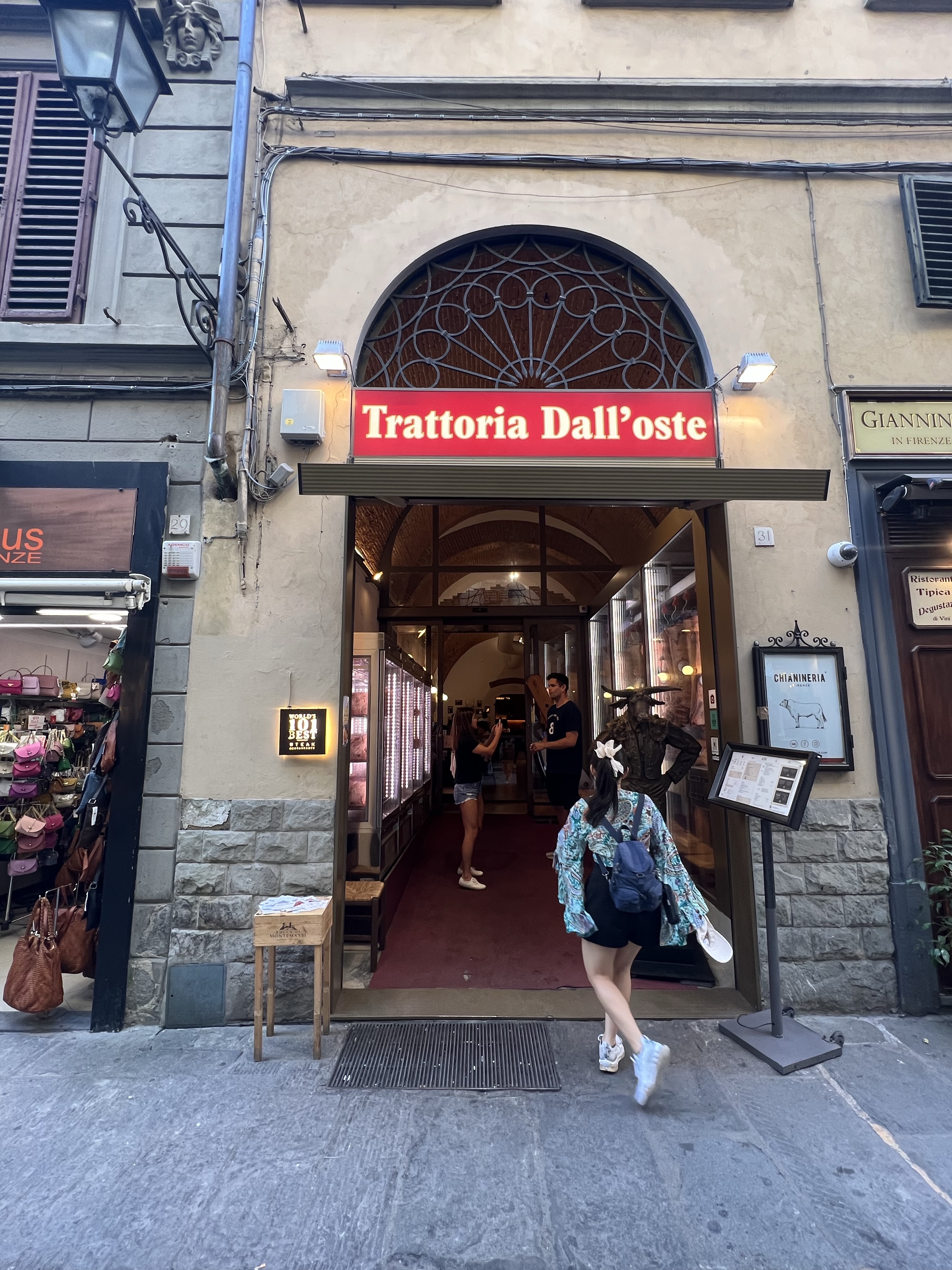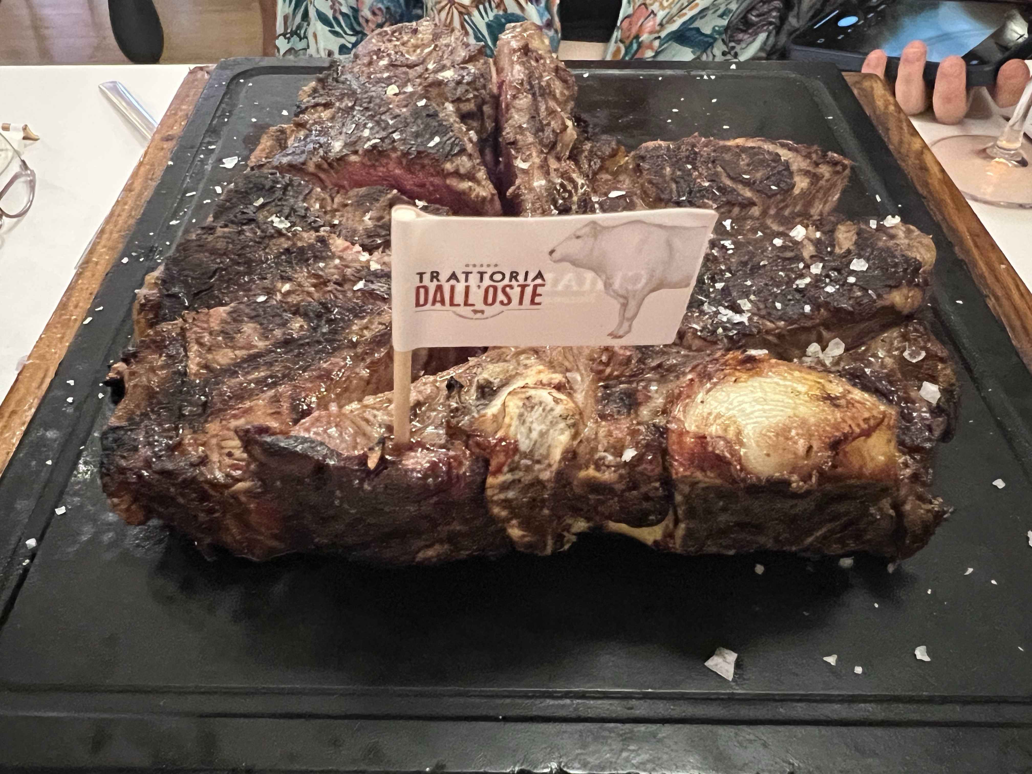 Trattoria dall’Oste是一家拿過世界百大牛排館殊榮的名店,在佛羅倫斯有幾家分店,招牌當然就是「三指厚」的丁骨牛排!菜單也很簡單,總之就是選你想要的牛肉產地和部位,然後選重量(至少1公斤),之後就看有沒有想吃配菜或沙拉等等。我們選了每公斤86歐的佛羅倫斯本地丁骨牛排,聽說兩個人吃一公斤就很飽了,也就不加點任何配菜,只點了一杯亮橘色的本地特色調酒嚐嚐。店內大概有三分之二是亞洲旅客,隨便掃視就有韓國人、中國人、越南人等等,其中一個服務生看起來也是韓國人(我發現佛羅倫斯非常多韓國人!)不過看到這樣的客人組合還是讓我抖抖的,畢竟專賣觀光客的店多半沒好店。