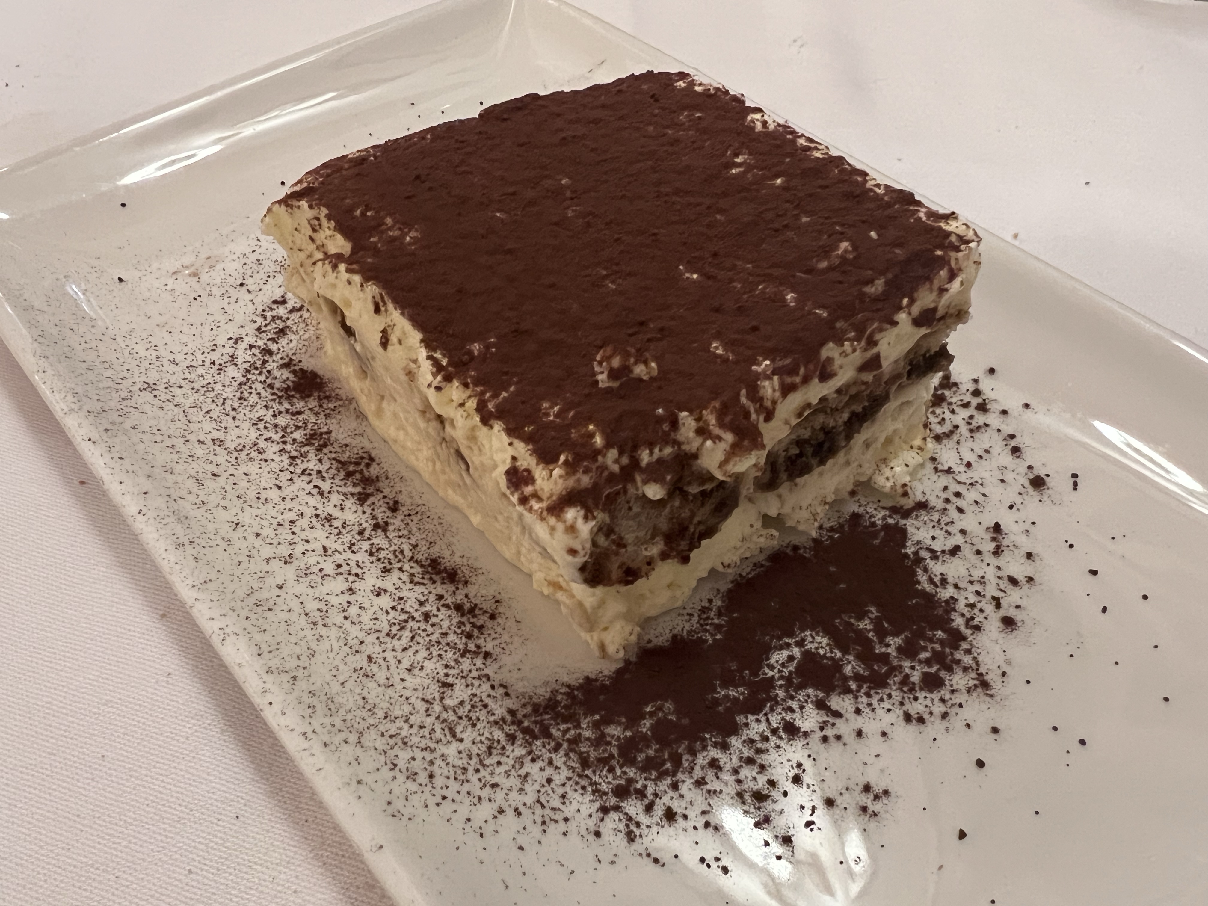過了十多分鐘牛排就上桌了!超厚的牛排放在炙熱的鐵板上上桌,服務生一開始也沒有詢問我們熟度,切開看起來是三分熟,不過有的區塊鐵板比較熱就幾乎到五分熟了,趕緊把那塊切出來放盤子裡。牛肉的味道普普,覺得肉味不是很足,口感和油花吃起來是不錯,但因為只有鹽和胡椒,吃多了確實單調。兩個人吃一公斤確實剛剛好,我大約吃掉2/3,最後還有點胃能叫個提拉米蘇作結,但我們一致認為昨天在島上吃的提拉米蘇大勝!