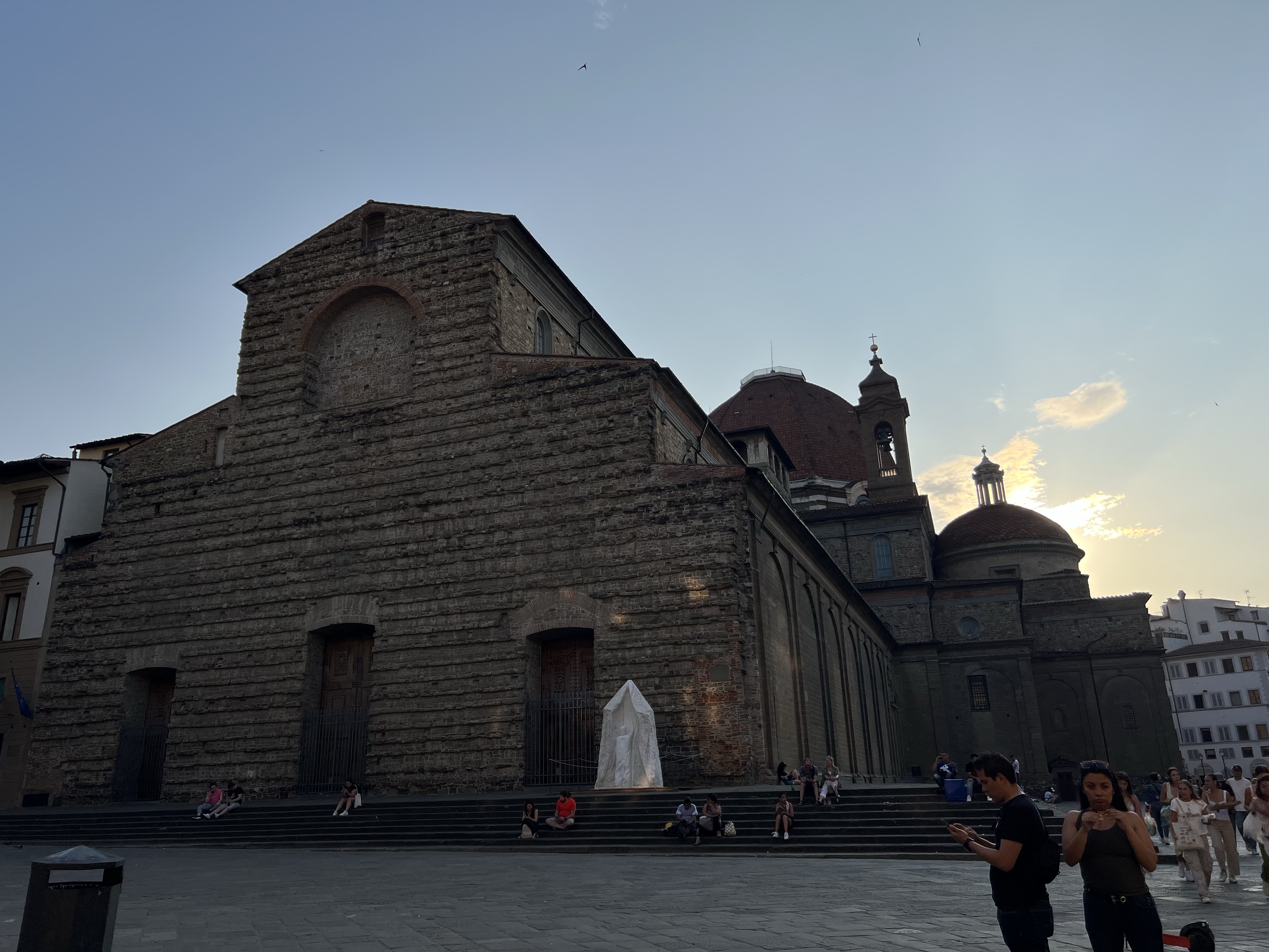 趕緊離開玩具店繼續往聖母百花教堂前進,五分鐘不到就看到大理石砌成的白色禮拜堂,近看才能感受到大教堂全由各色大理石堆疊而成的震撼,非常剛硬的幾何線條在當年應該也是走在創新前沿。教堂外排了超長的人龍,看起來是在排主教堂免費參觀的隊;我們有買下午登塔的票,自然就不用大排長龍。